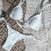 Bikini símil tejida, corpiño triangulo con tiras y argolla en el centro, la bombiless se ata a los costados.