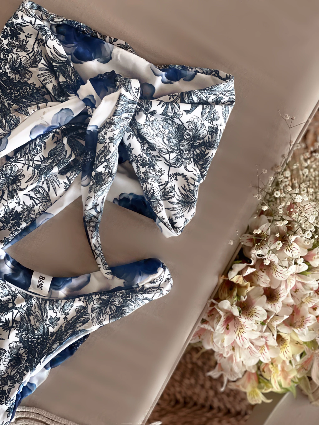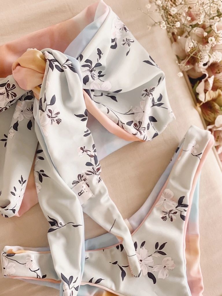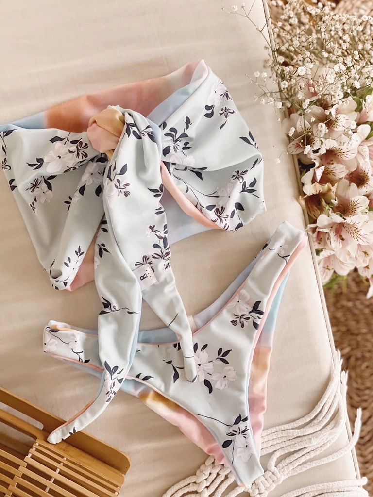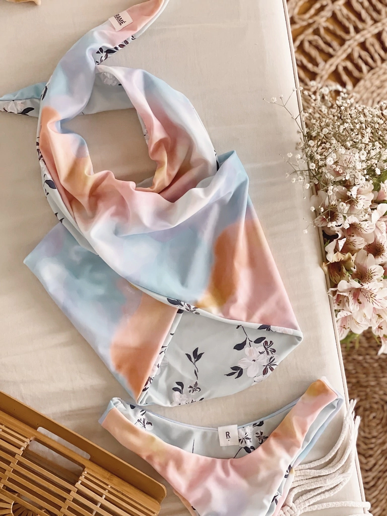 Bikini estampada reversible, corpiño tipo pañuelo (multiuso), bombiless.