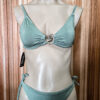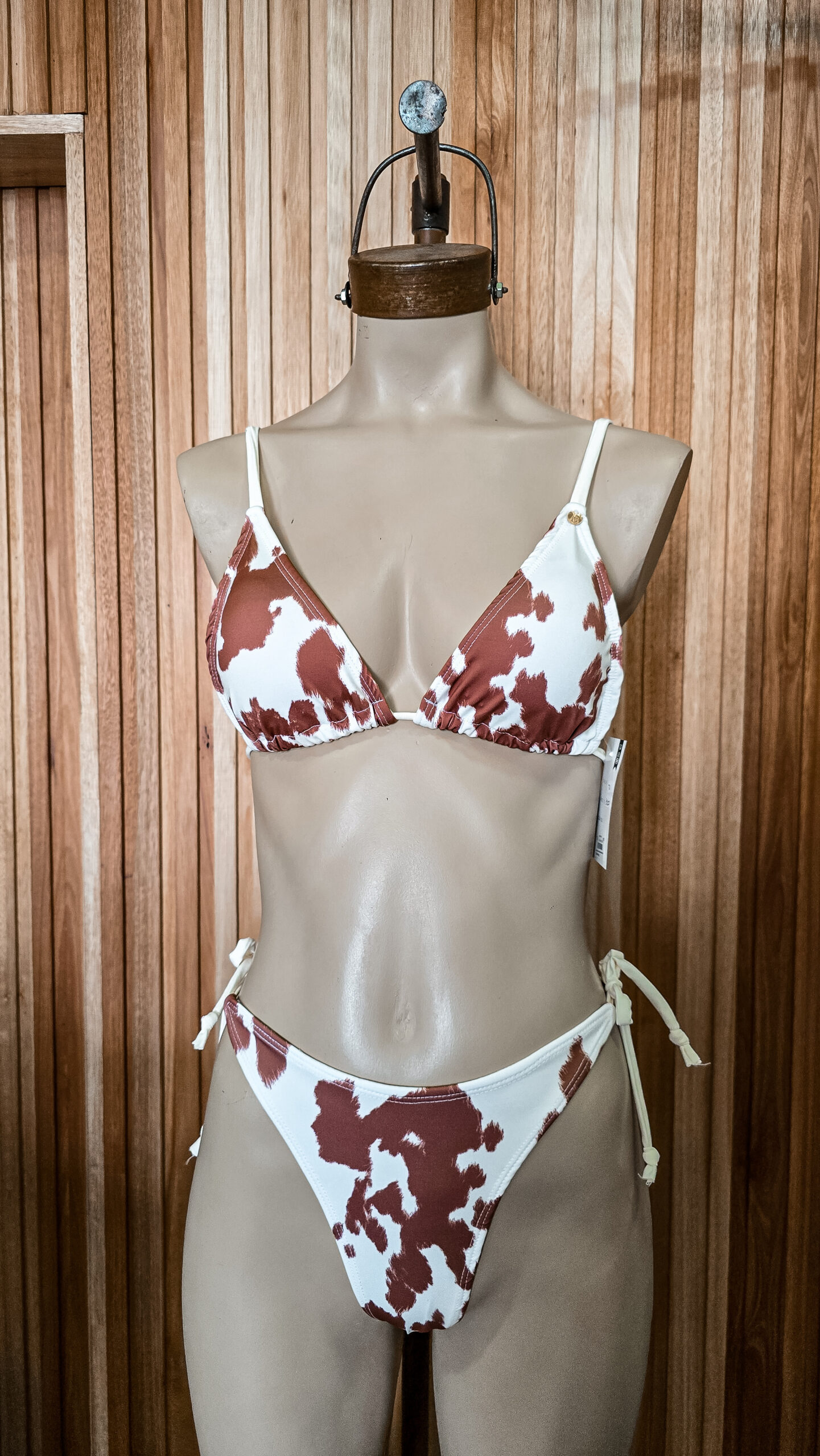 Bikini de lycra. Modelo estampado. Corpiño triángulos (con tazas desmontables) con lazos tipo cordón para atar al cuello y en la espalda.