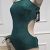 Bikini estampada animal print, corpiño estilo deportivo con tiras para atar cruzadas en la espalda, bombiless en V.