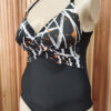 Bikini lycra estampada, corpiño estilo deportivo con tiras para atrás, bombiless alta.