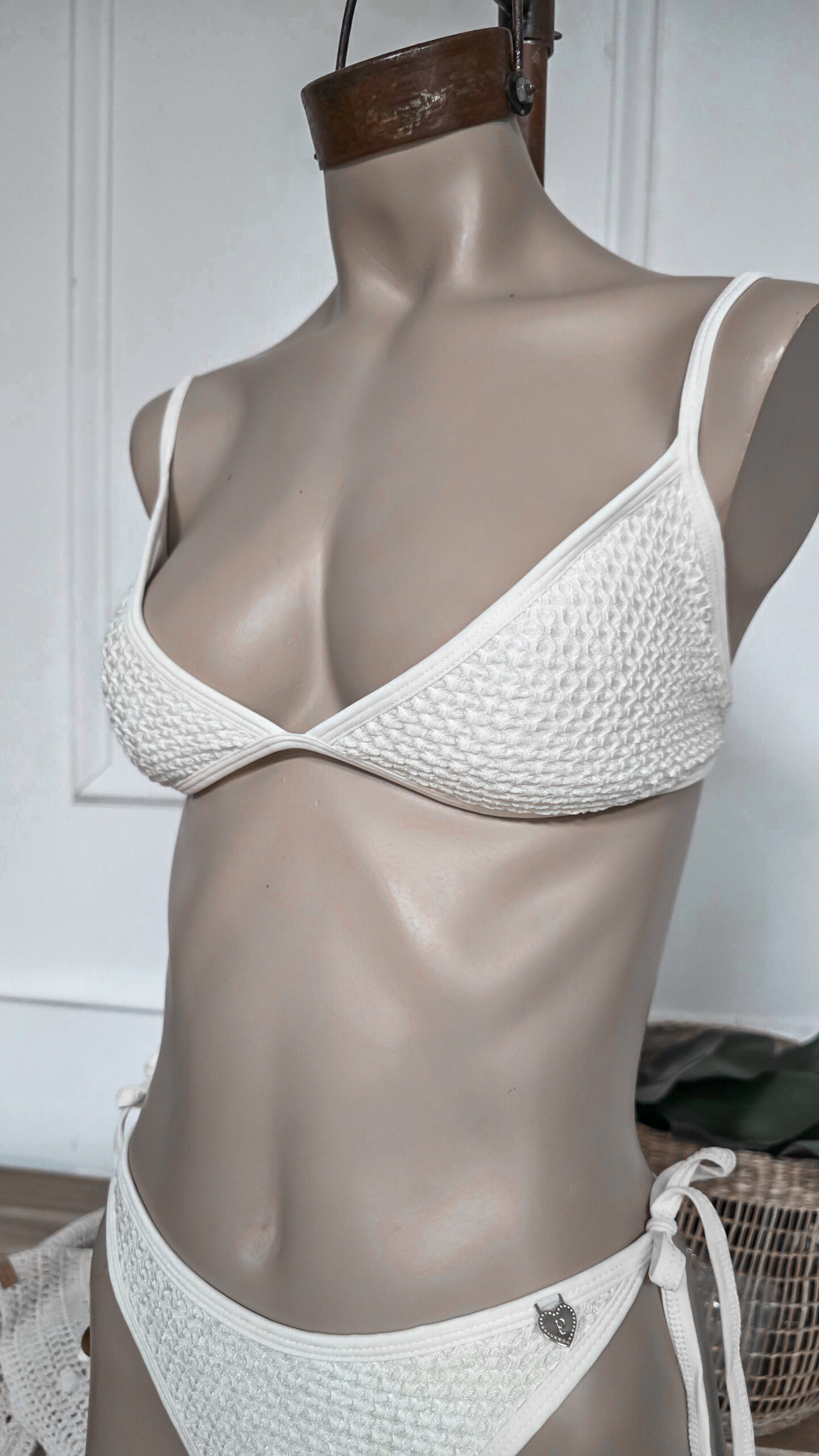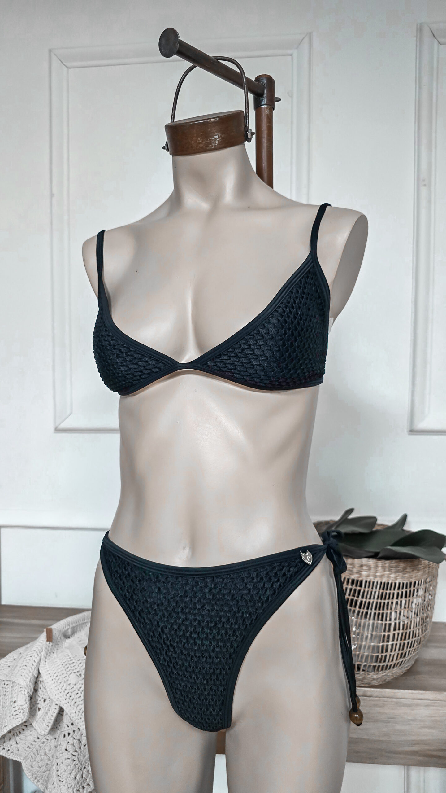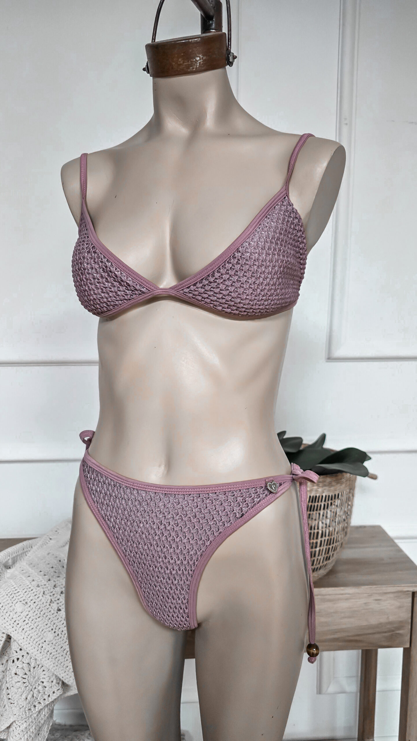 BIKINI TEJIDA: Corpiño triangulo, breteles regulables, lazo para atar en espalda con detalle de bolitas de madera en el final de los lazos tipo cordón. Tanguiless para atar, con detalles en el lazo de bolitas de madera.
