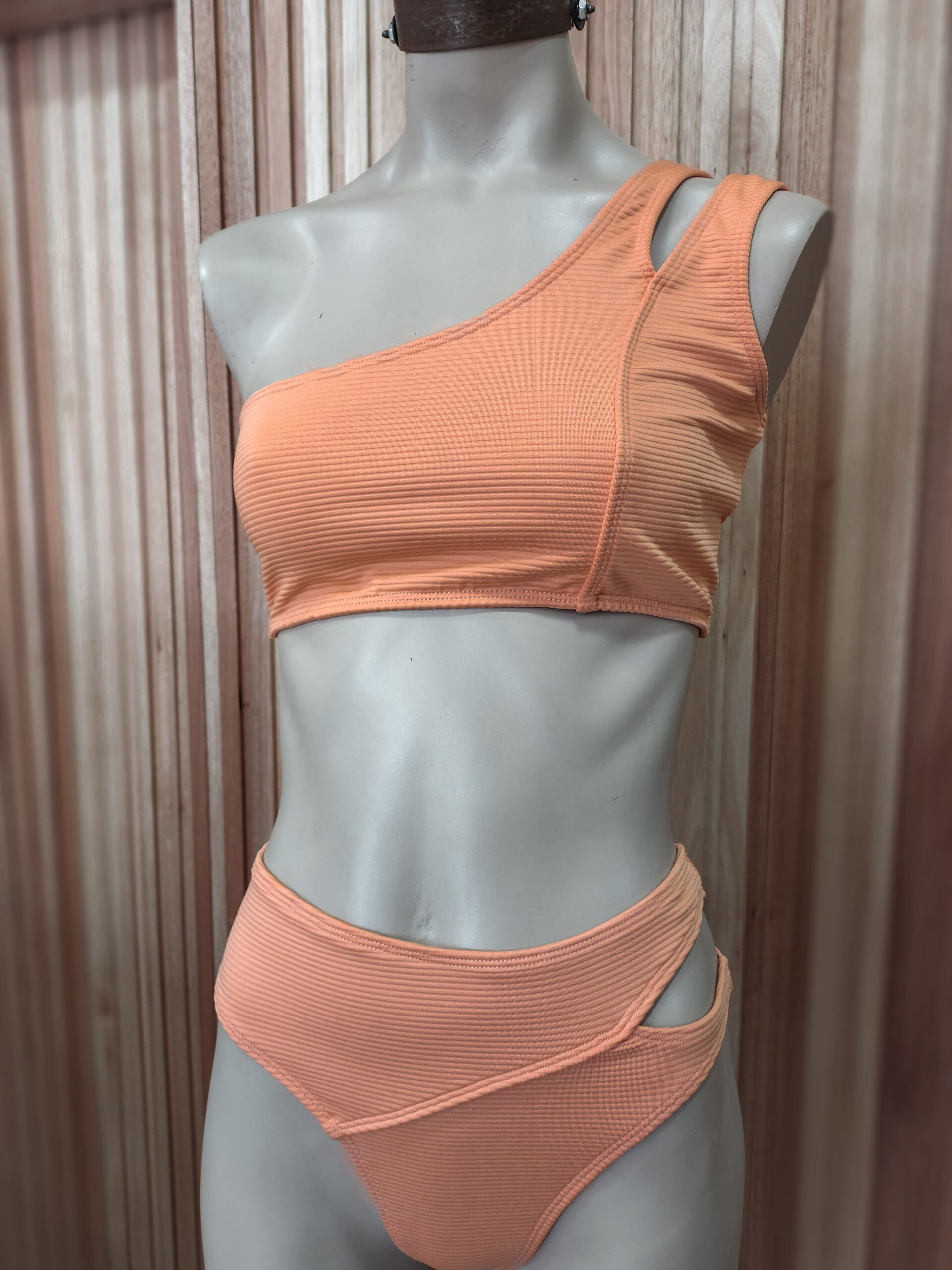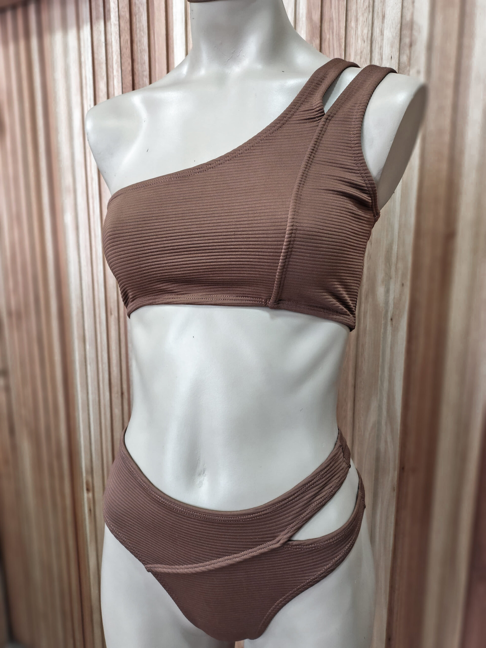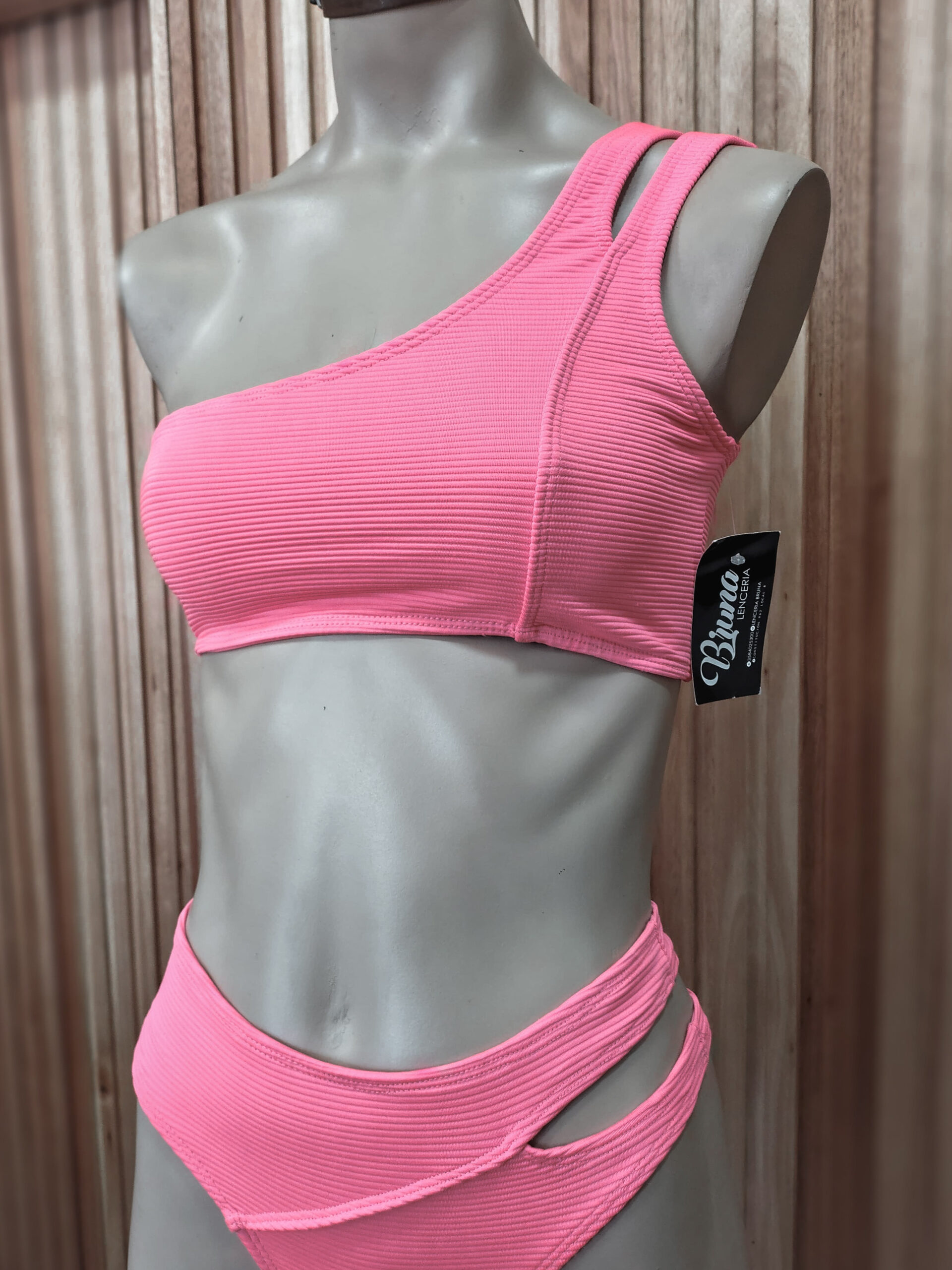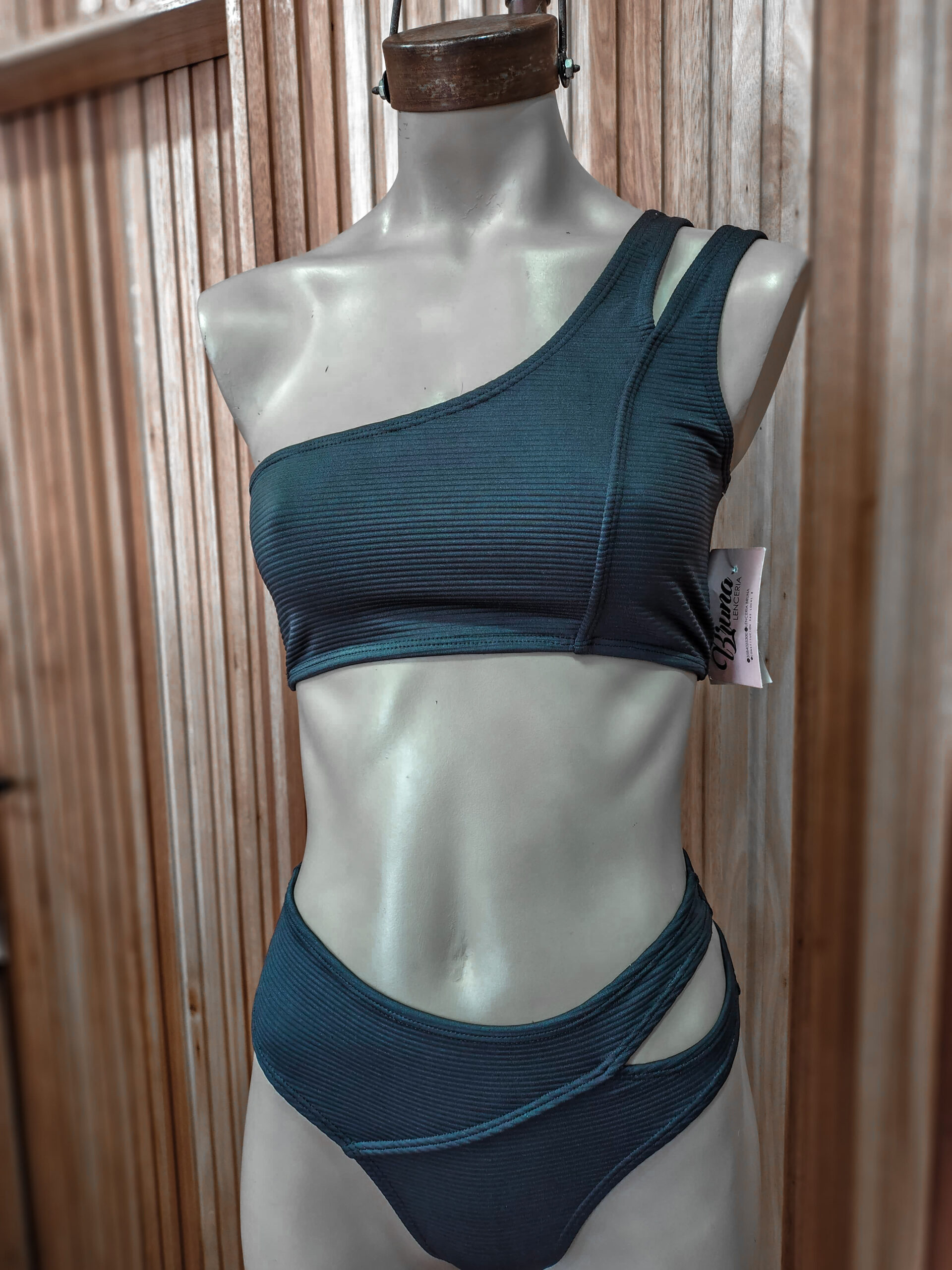 Bikini morley, corpiño tipo top de un solo hombro con tira doble por recorte y bombiless con recorte al costado también. Media vedetina.