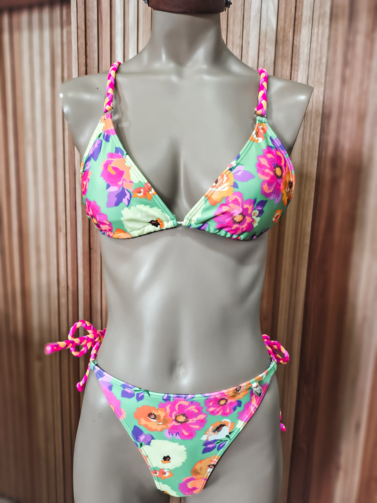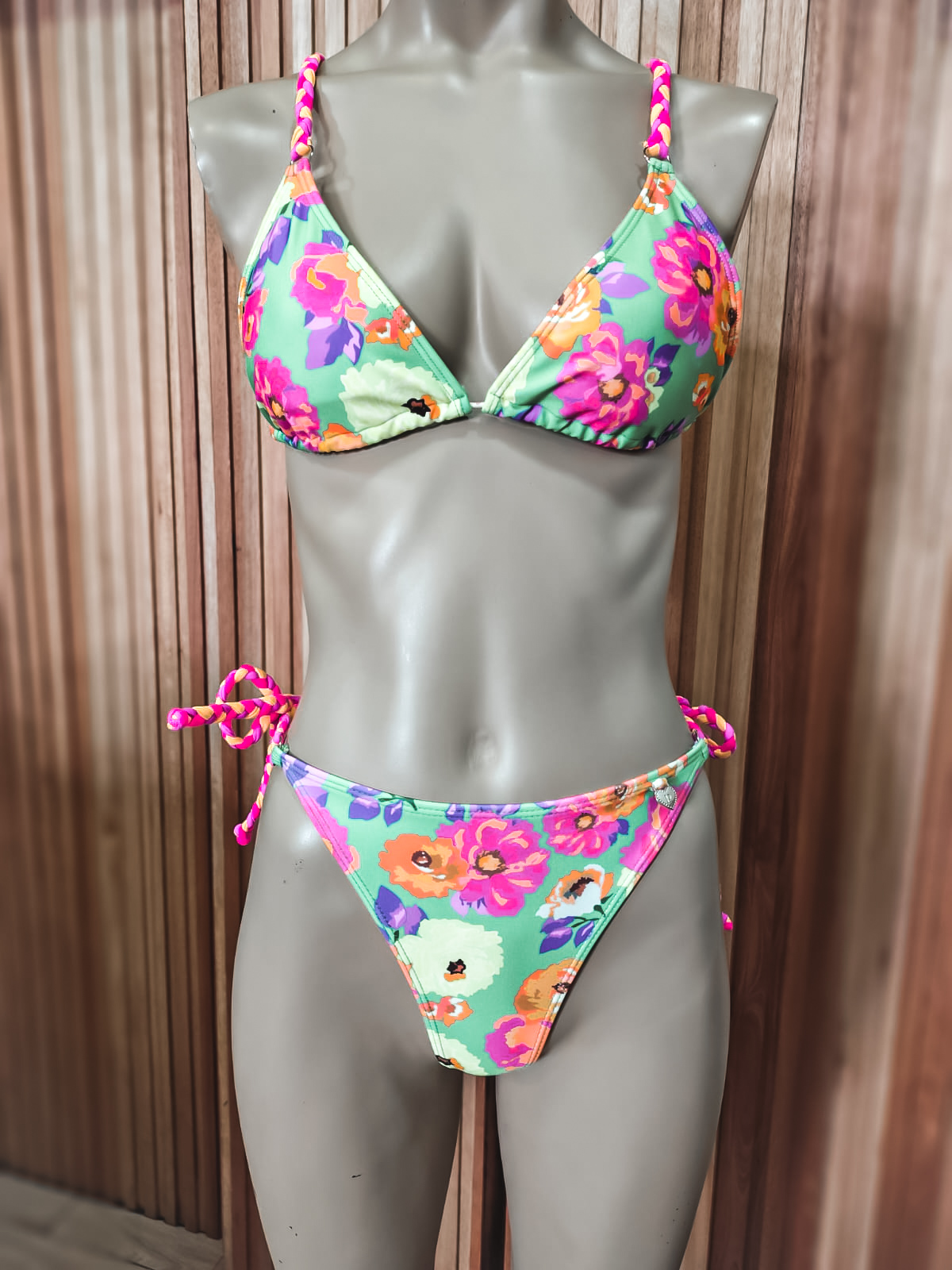 Bikini de lycra forrada estampada. Corpiño clásico de triángulos con tazas desmontables. Breteles regulables con trenzada de colores. Tanguiless.