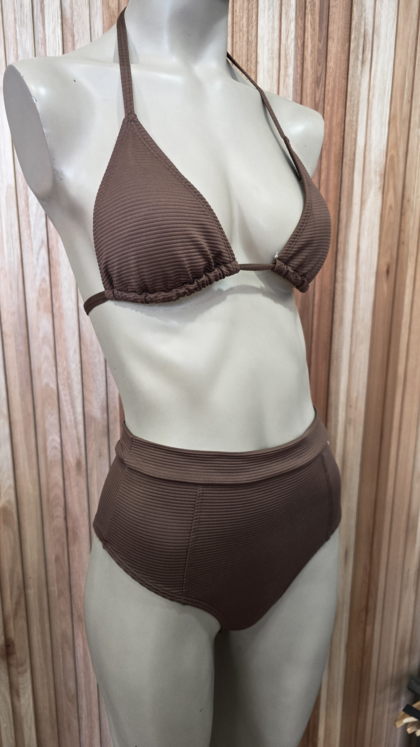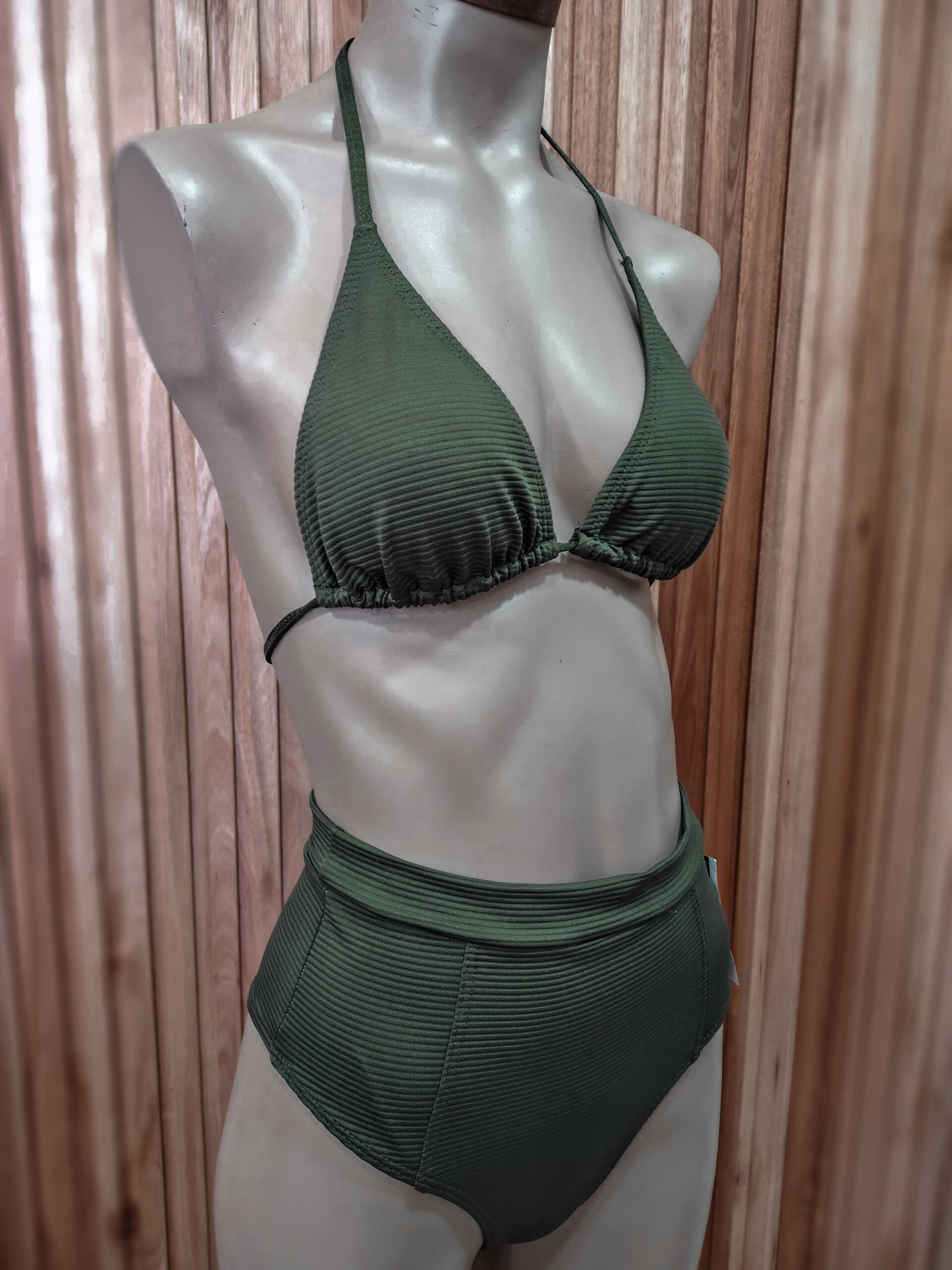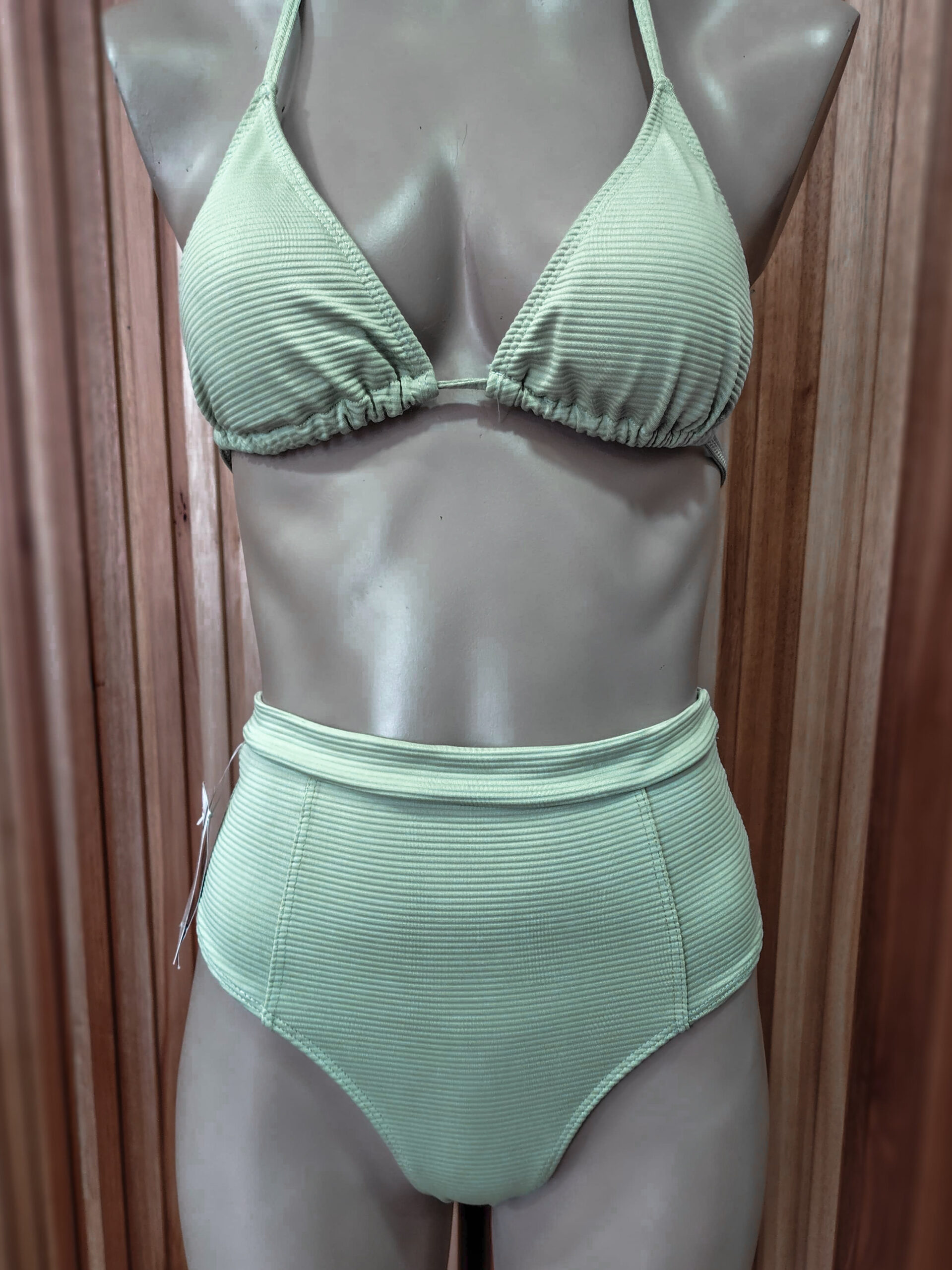 Bikini lycra símil morley, corpiño triángulo básico con tiras para atar, y tacitas desmontables, bombiless alta.