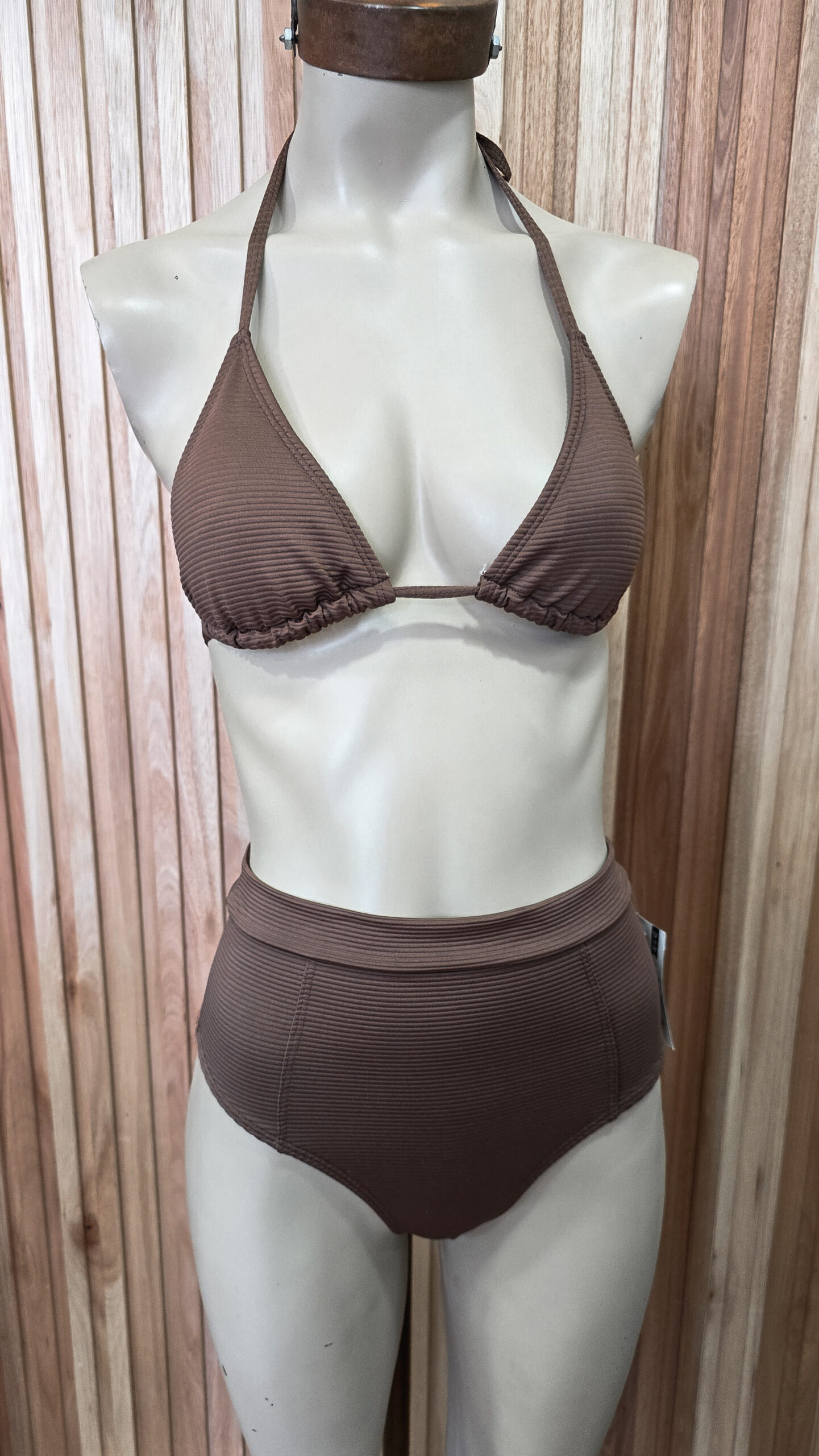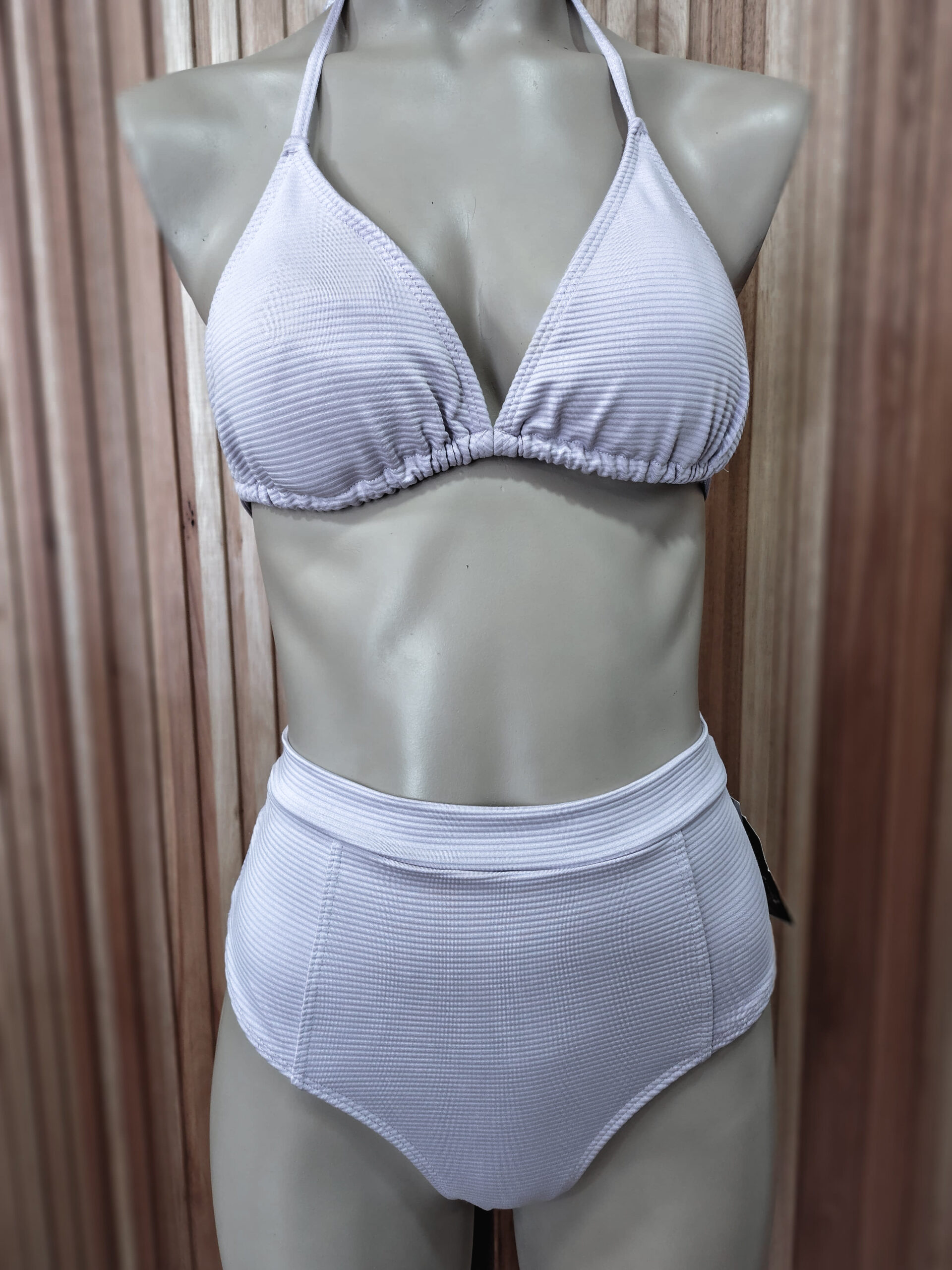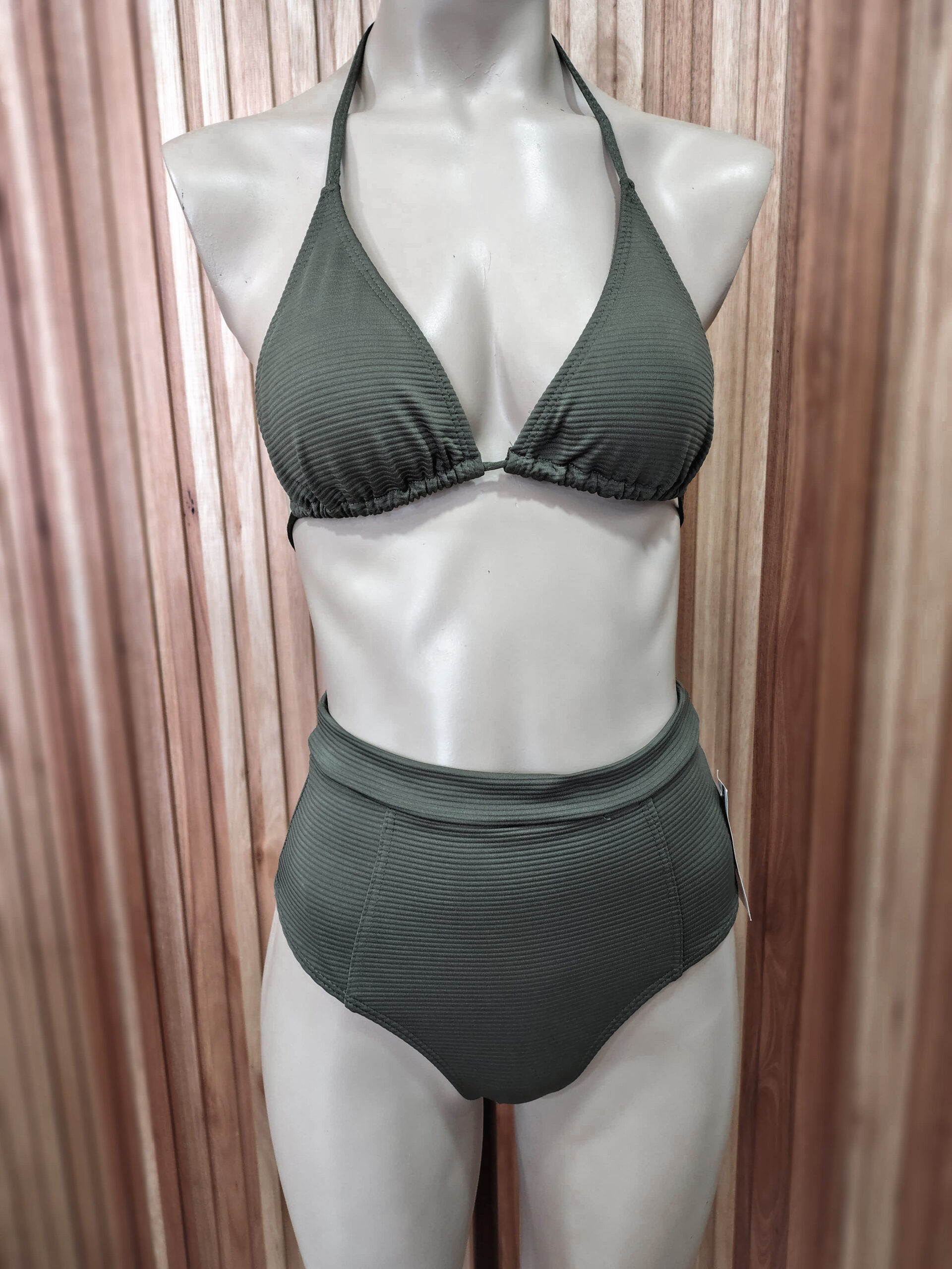 Bikini lycra símil morley, corpiño triángulo básico con tiras para atar, y tacitas desmontables, bombiless alta.