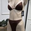 Bikini símil morley combinada, corpiño triángulo con tazas desmontables y lazos finos para atar. Tanguiless para atar.