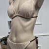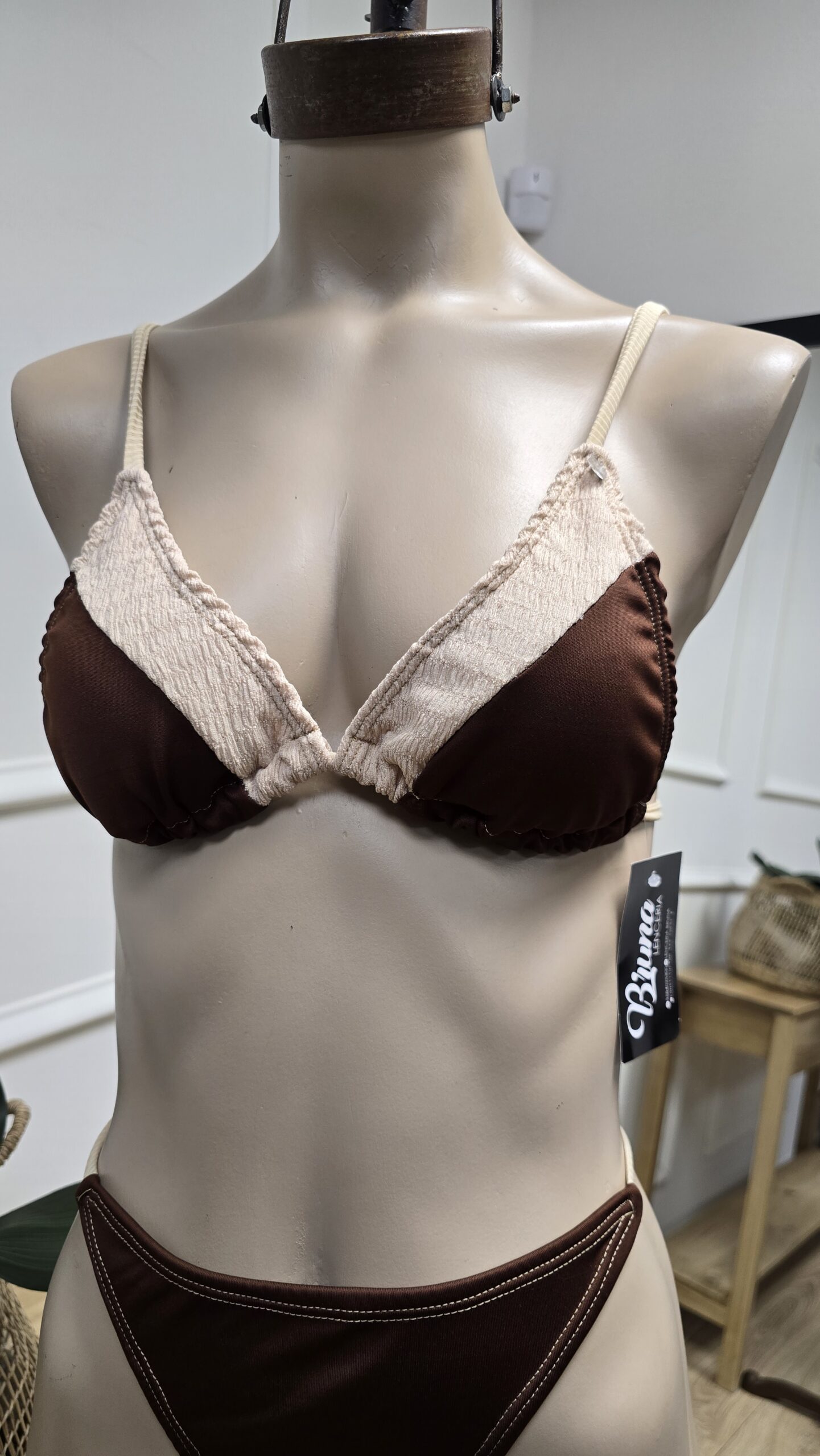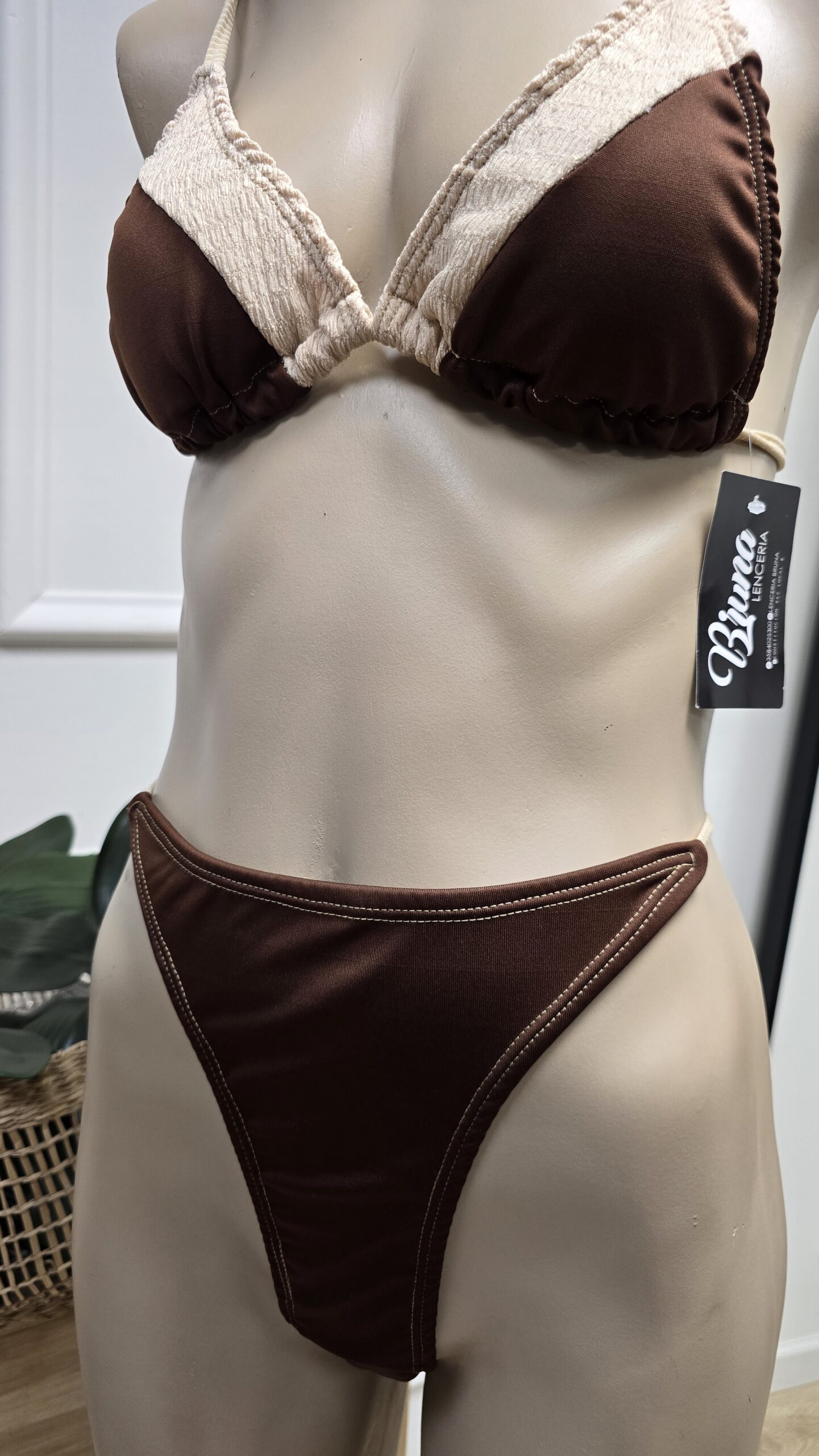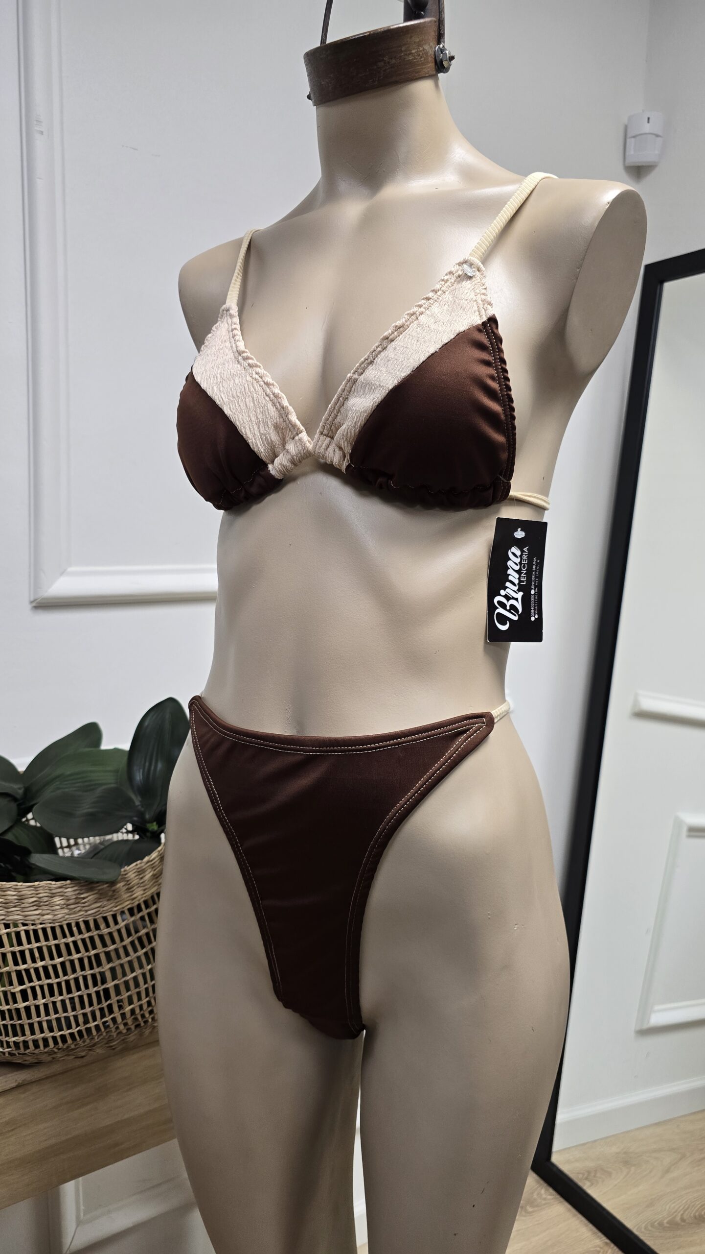 Bikini lycra, corpiño triángulo combinado con morley, tanguiless para atar. Tazas desmontables.