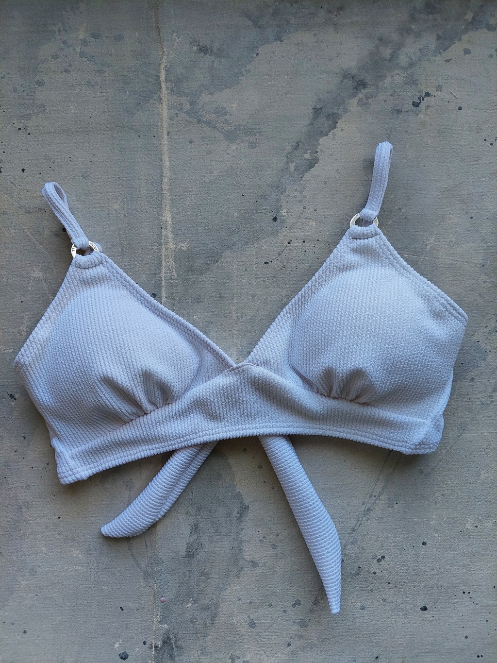 Bikini forrada morley, corpiño triángulo con bajo busto, breteles regulables y lazo para atar en la espalda. Detalle de argollas metálicas en el bretel. Bombi alta vedetina.