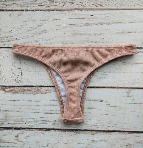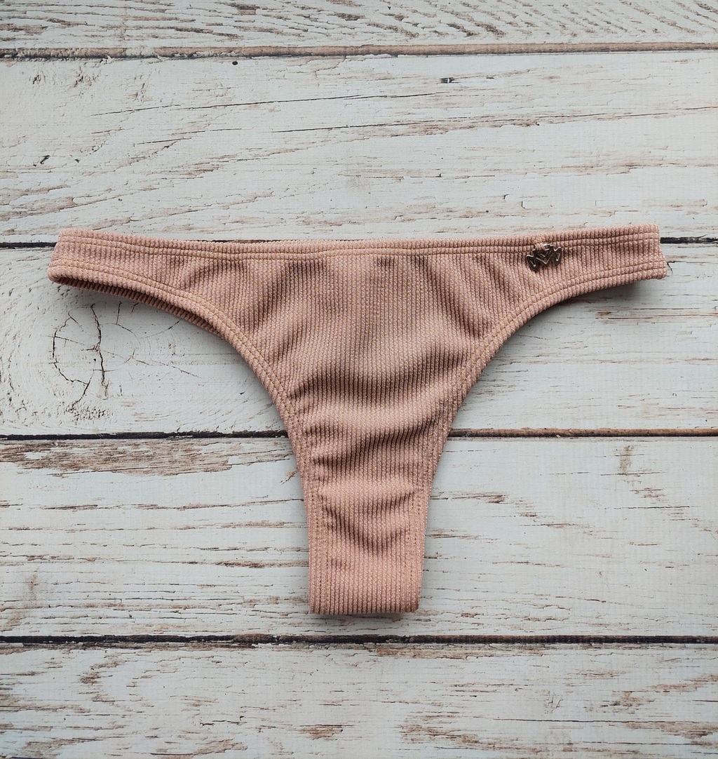 Bikini forrada símil morley, corpiño tipo top con apertura en el centro y bombiless. Combinada