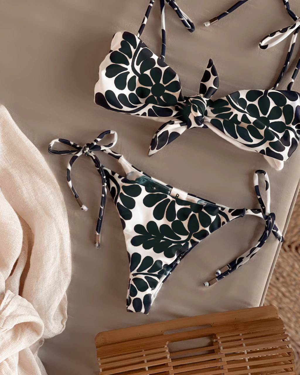 Bikini estampada, corpiño con lazo en el centro, la bombiless es reversible y se ata a los costados.