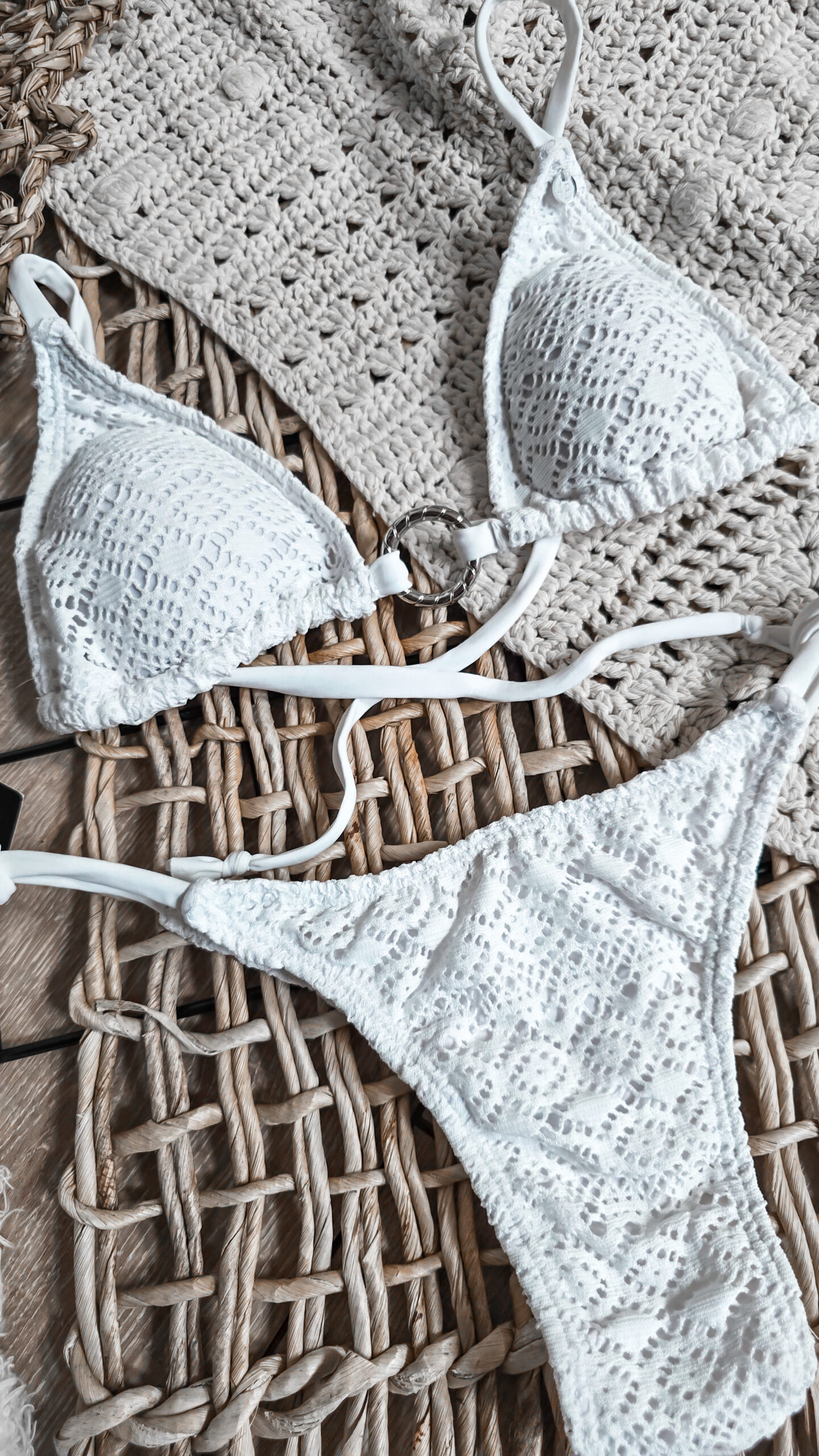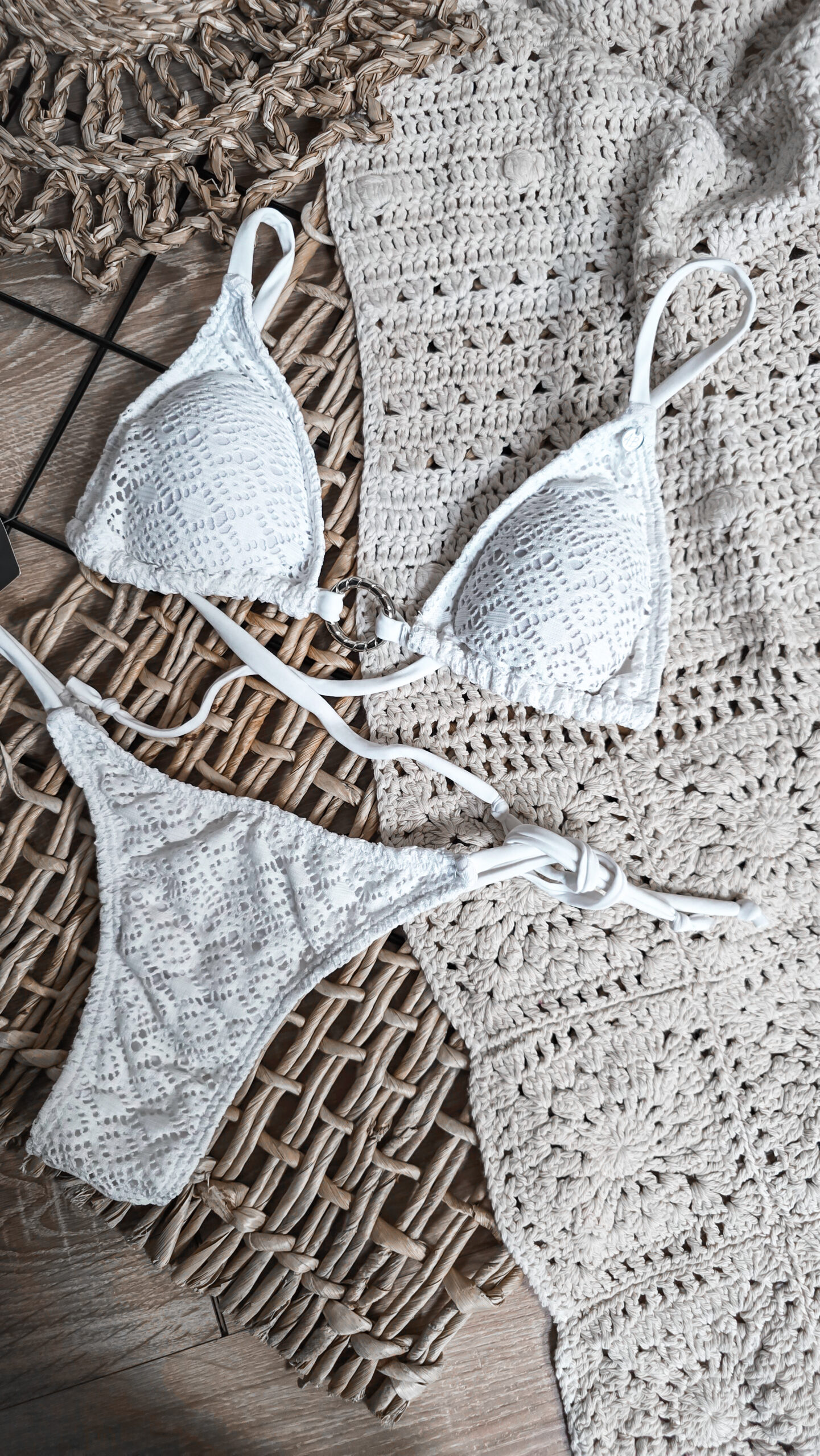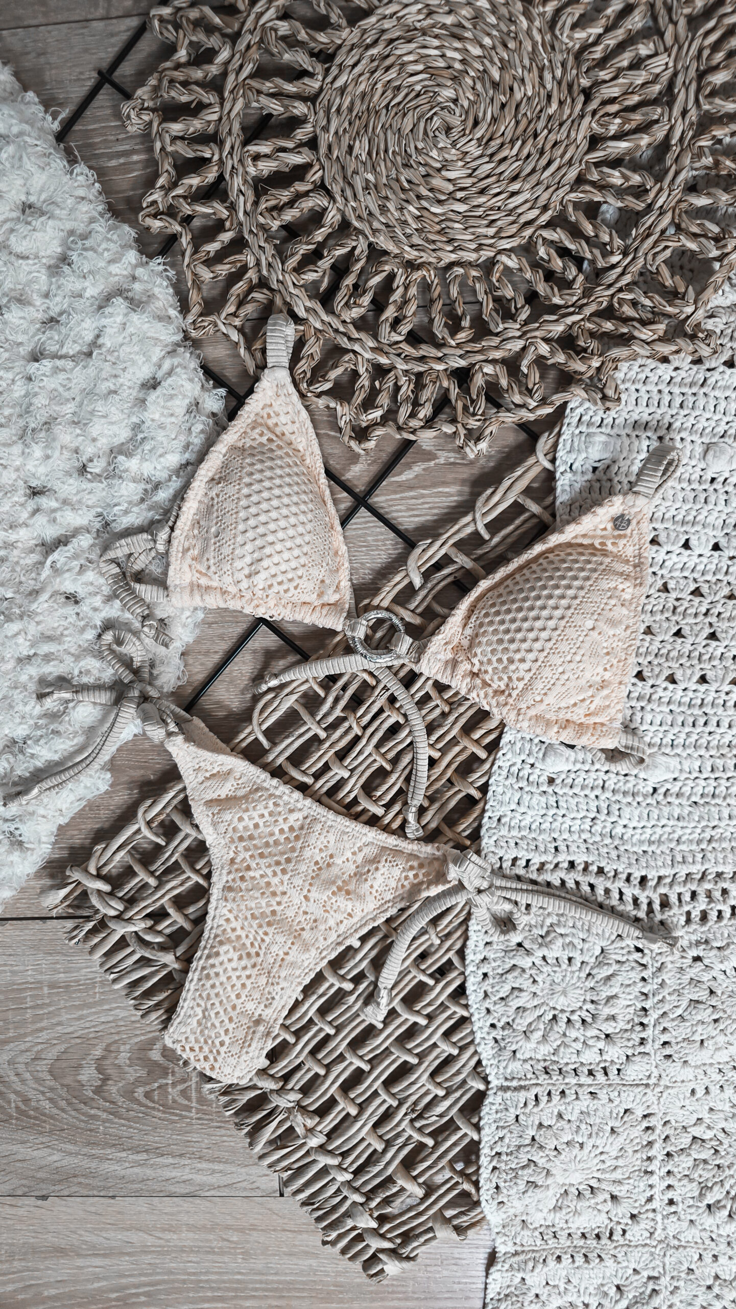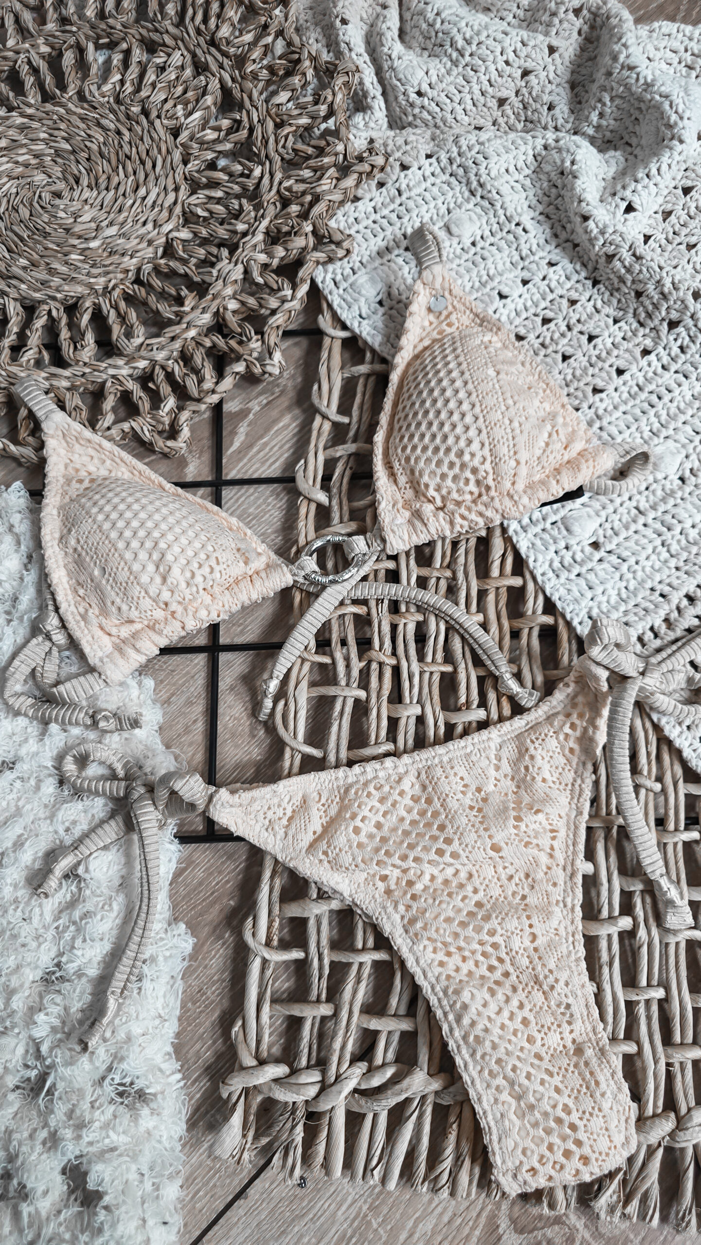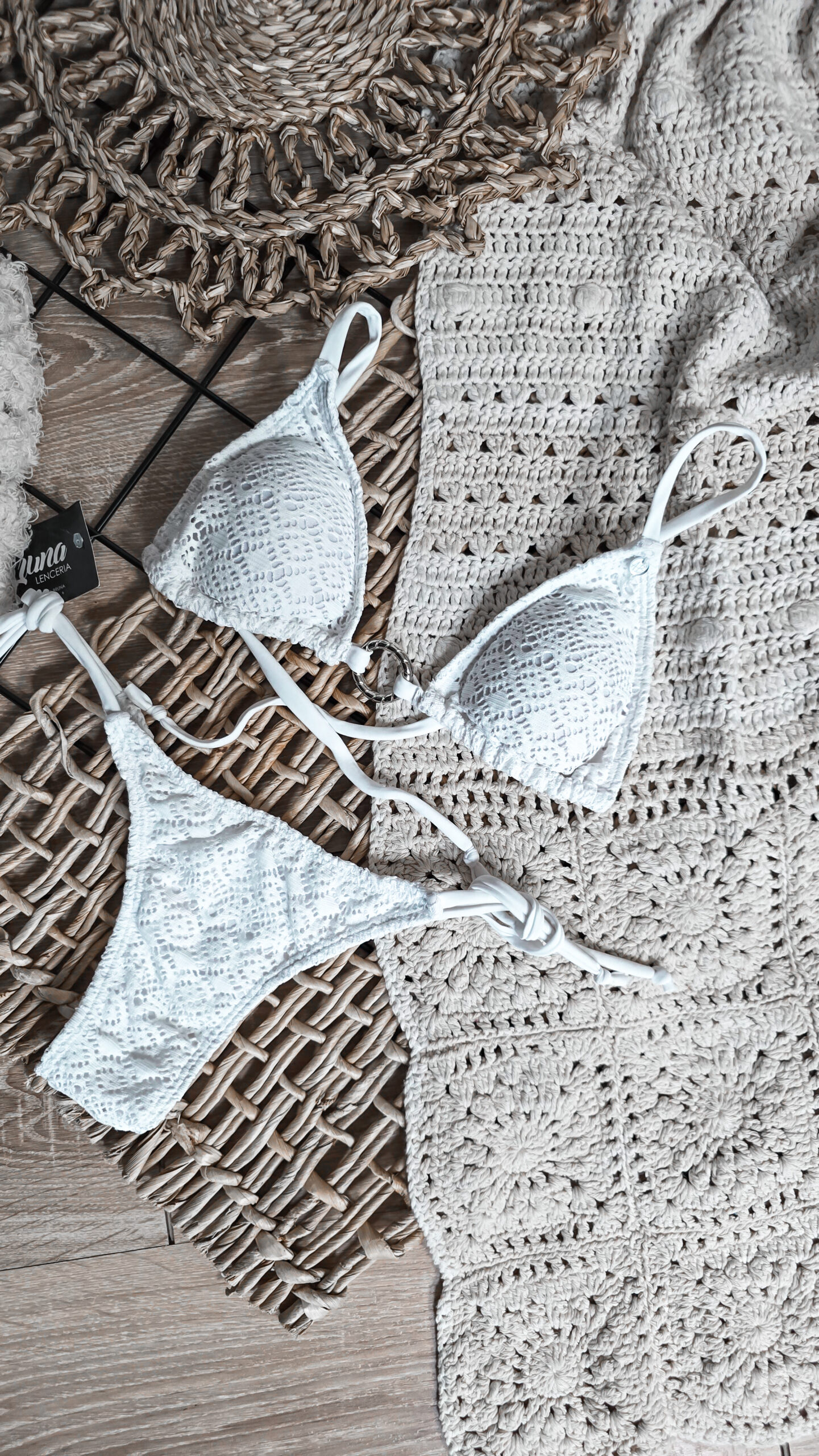 Bikini simil tejida, corpiño triángulo con argolla metálica en el centro y tiritas, la bombiless se ata a los costados. Tazas desmontables.