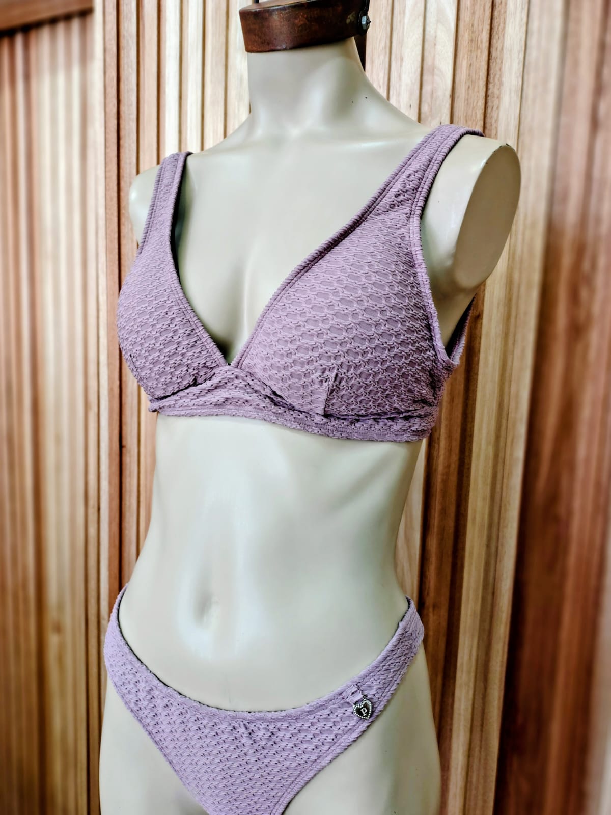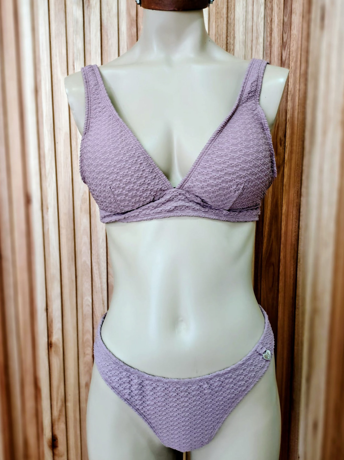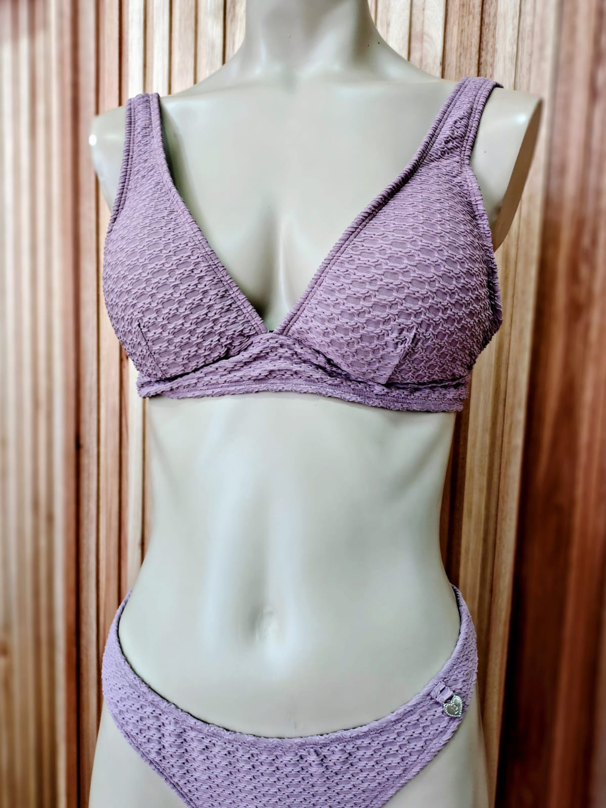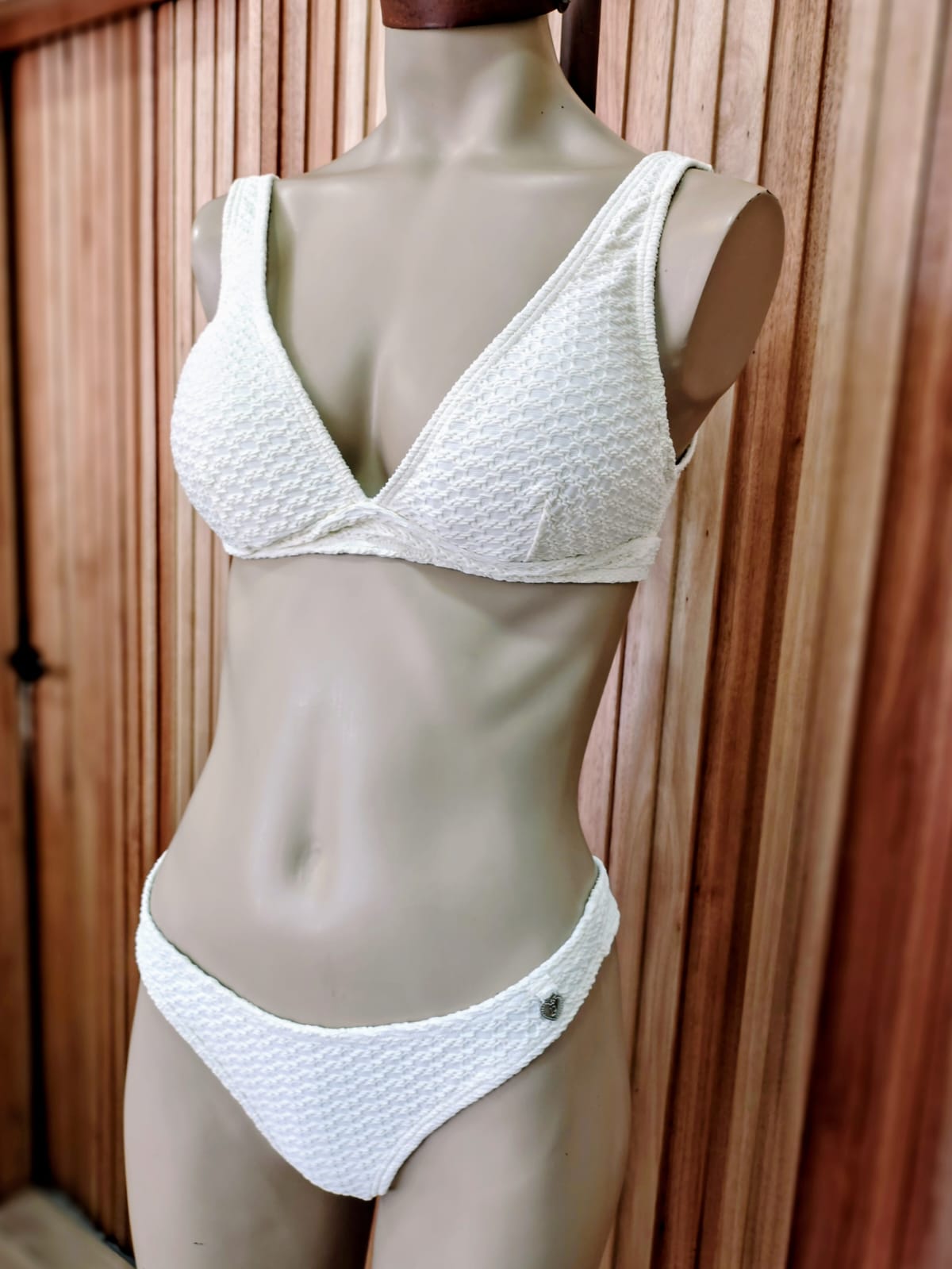 Bikini de lycra tejida, tela super texturizada. Corpiño triángulo con bajo busto, coleta ancha, prendidura trasera, breteles fijos anchos. Bombi less.