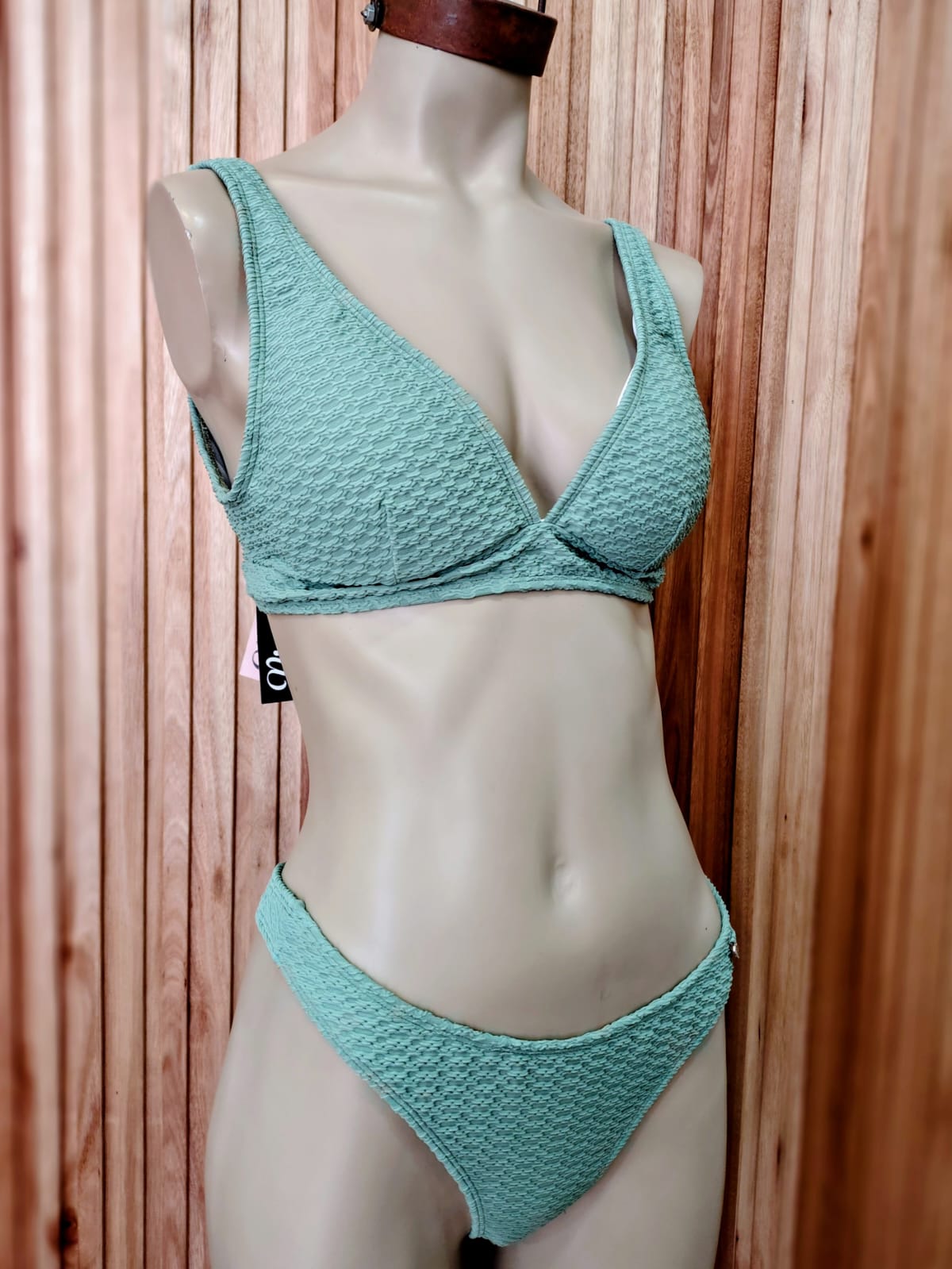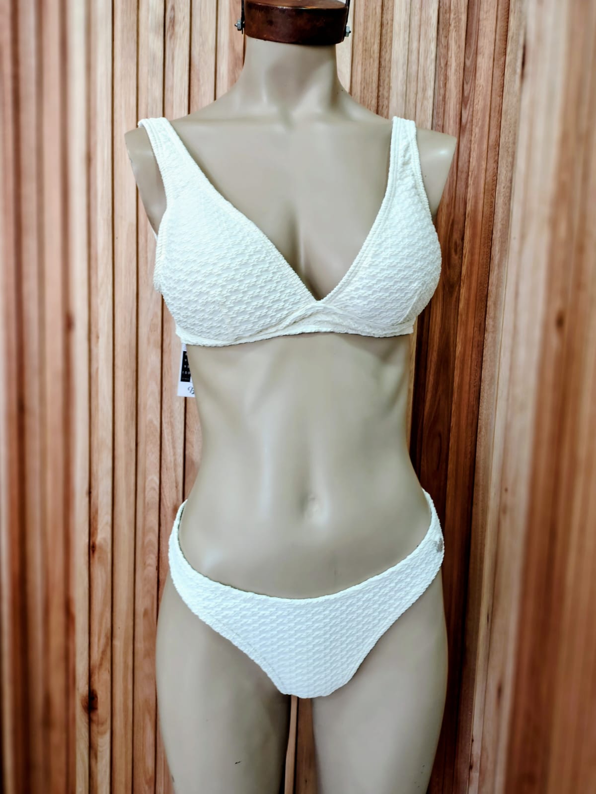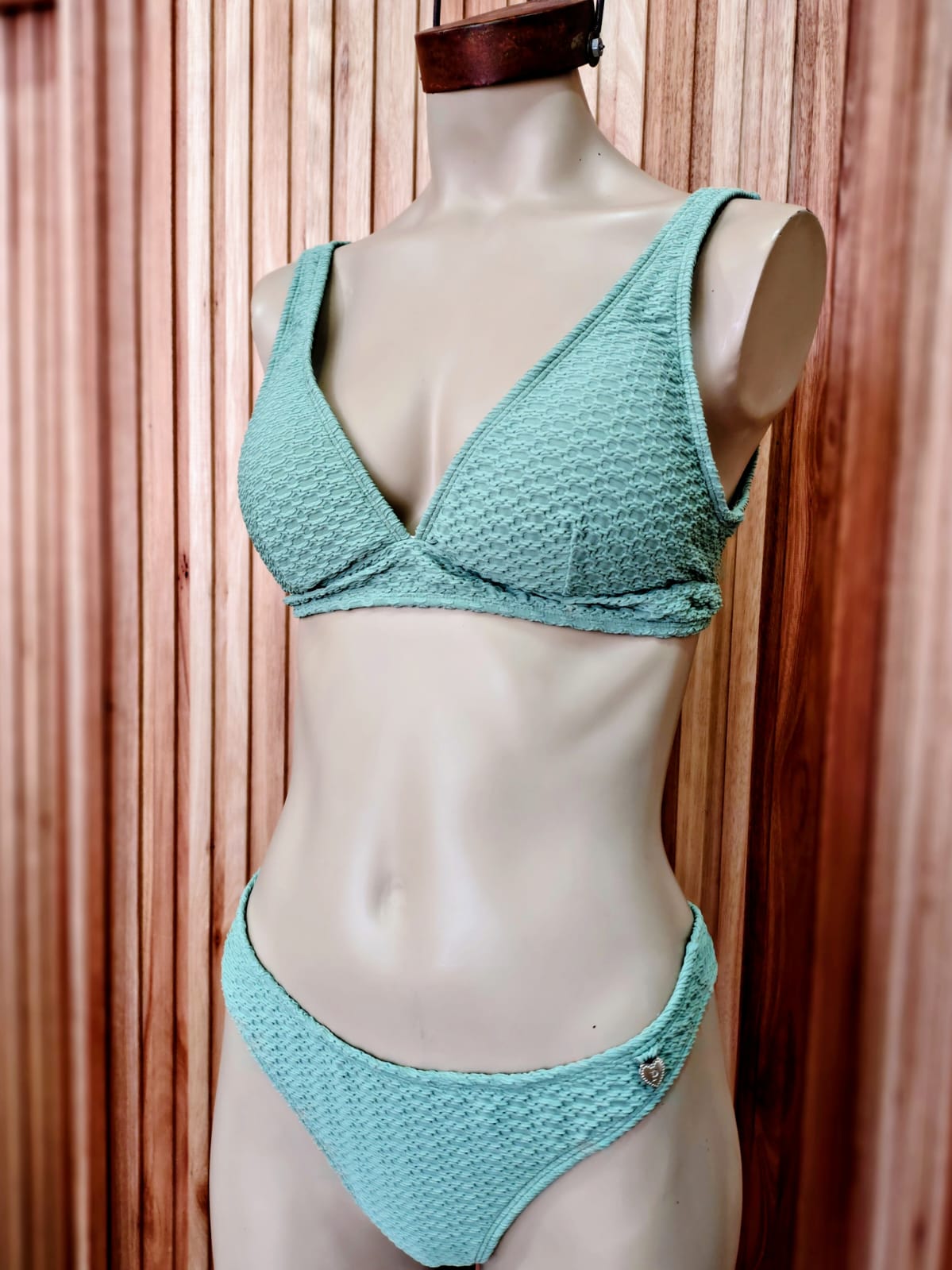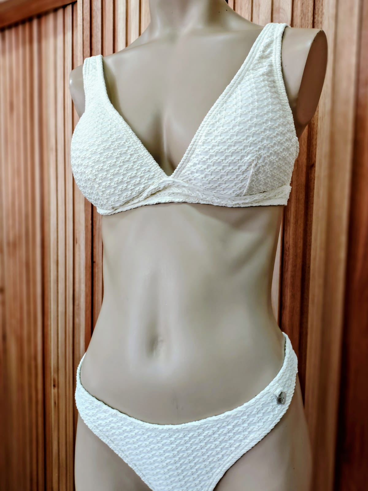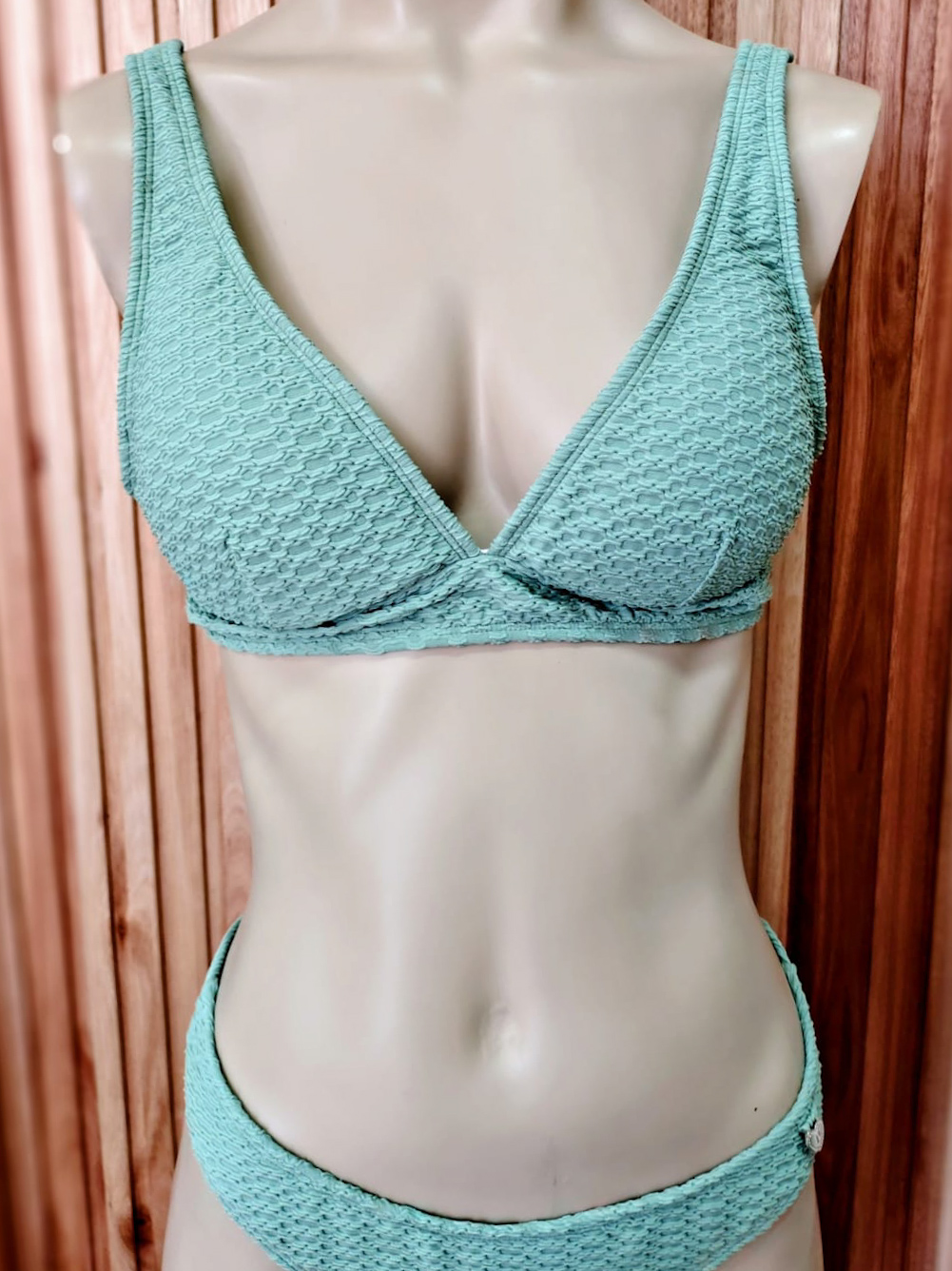 Bikini de lycra tejida, tela super texturizada. Corpiño triángulo con bajo busto, coleta ancha, prendidura trasera, breteles fijos anchos. Bombi less.