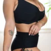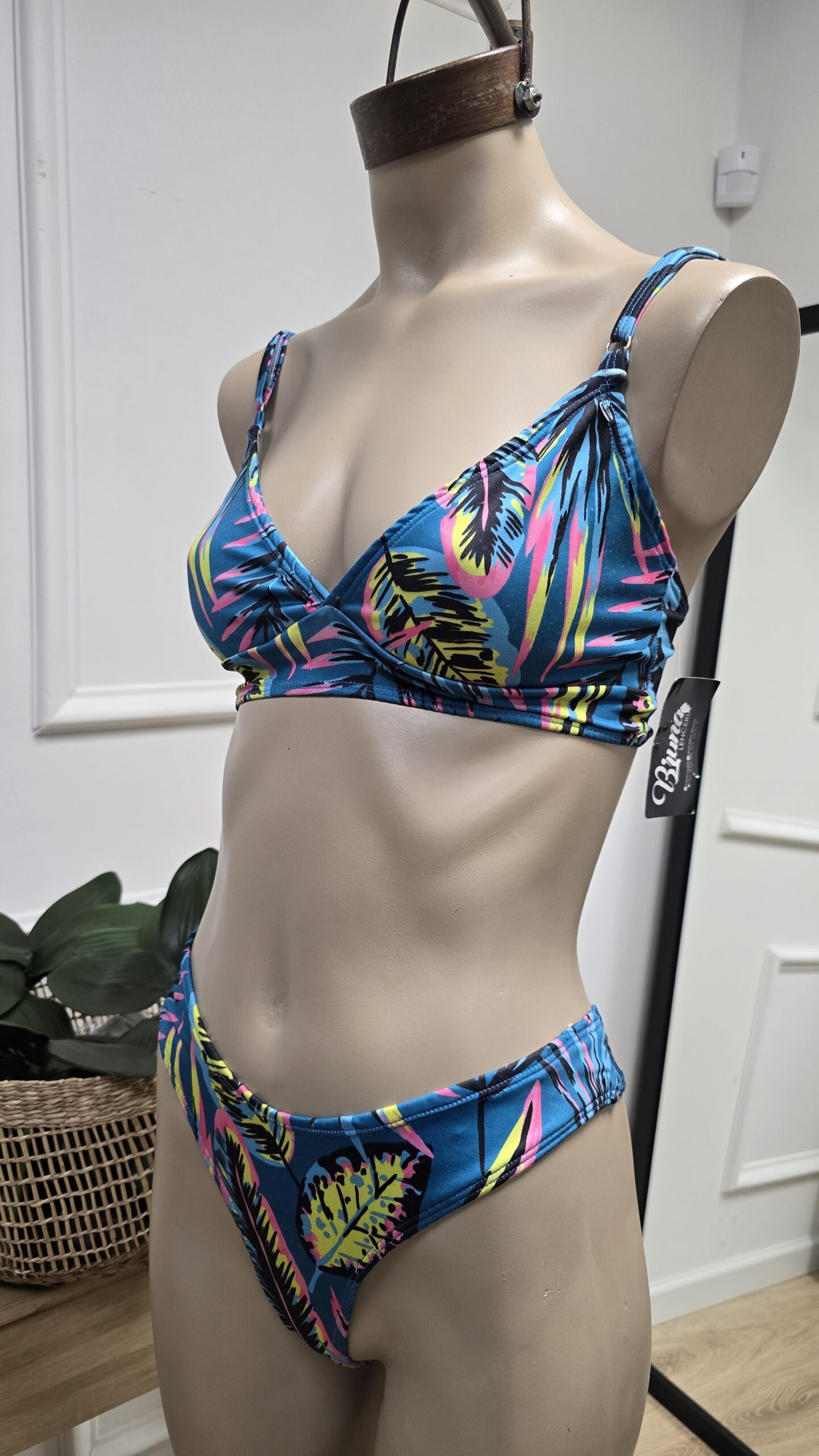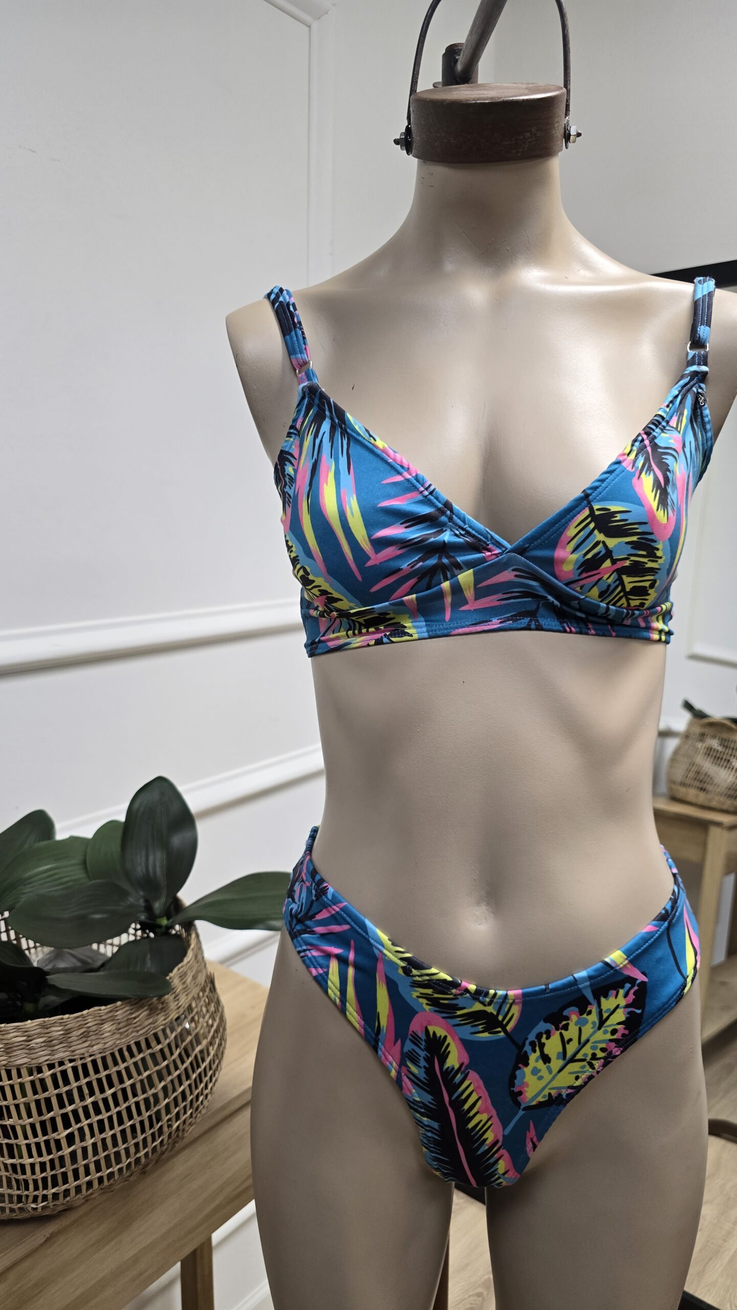 Bikini estampada de lycra, corpiño con breteles regulables. Bombiless alta.