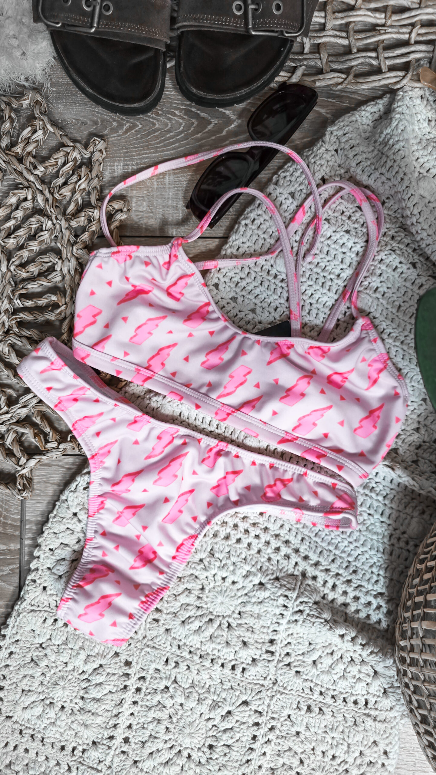 Bikini lycra estampada, corpiño estilo deportivo con tiras cruzadas atrás, bombiless.