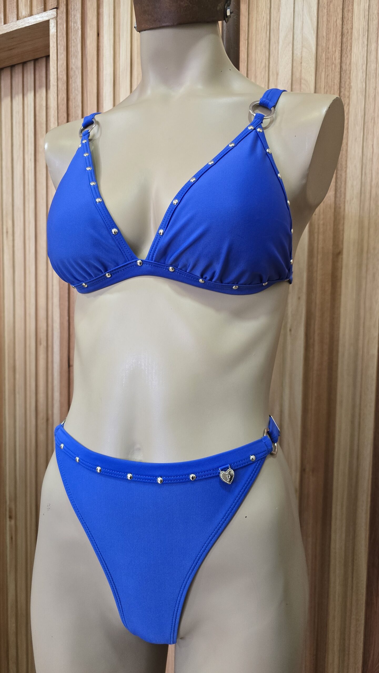 Bikini forrada, de lycra. Corpiño triángulo con tazas desmontables y detalle de tachas plateadas en el borde. Breteles regulables y prendidura trasera. Tanguiless regulable con detalles de tachas.