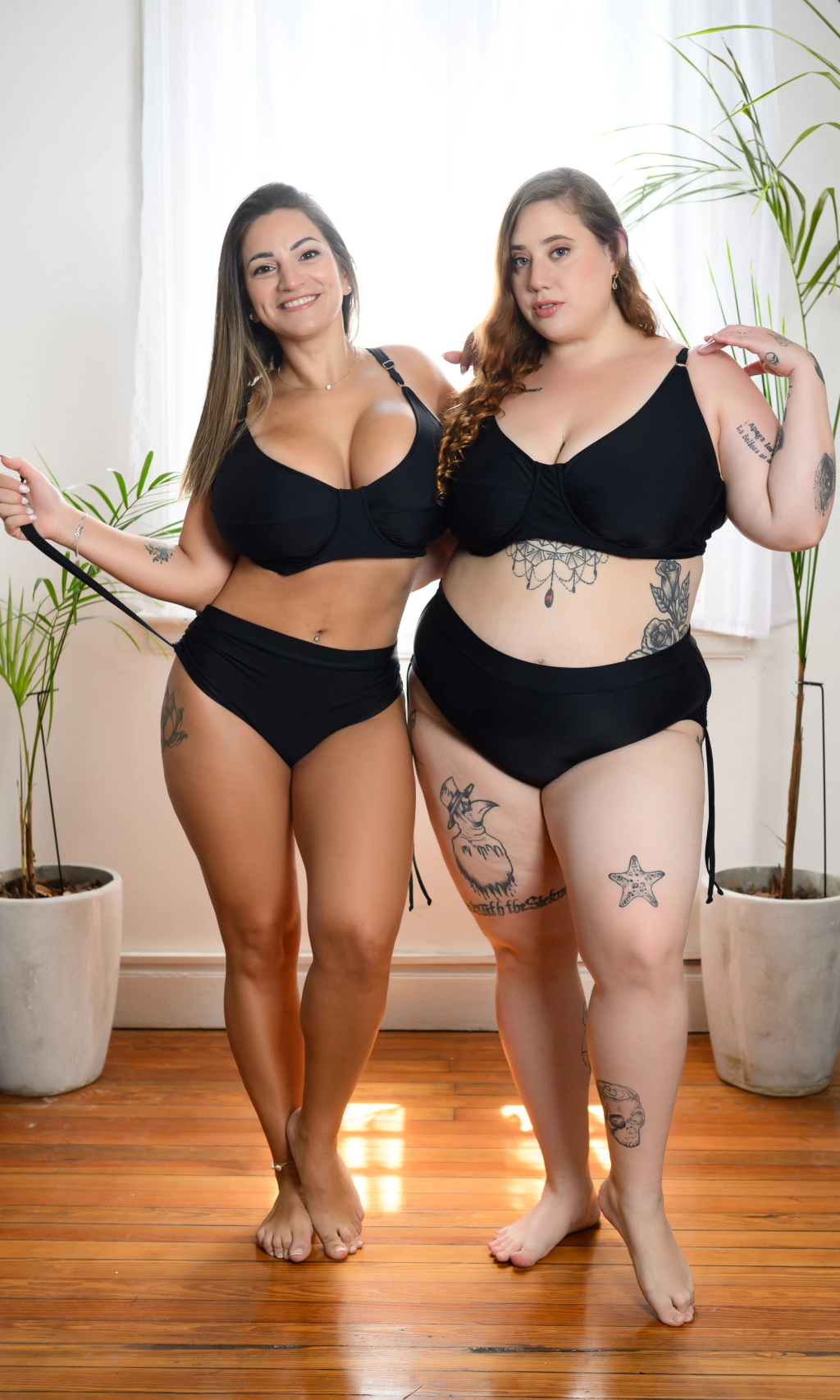 Bikini lisa doble lycra, corpiño con aro, breteles regulables y espalda atada. Bombi vedetina, tiro alto con regulaciones laterales tipo frunce. Universal – linea Curvy-, desde el talle 100