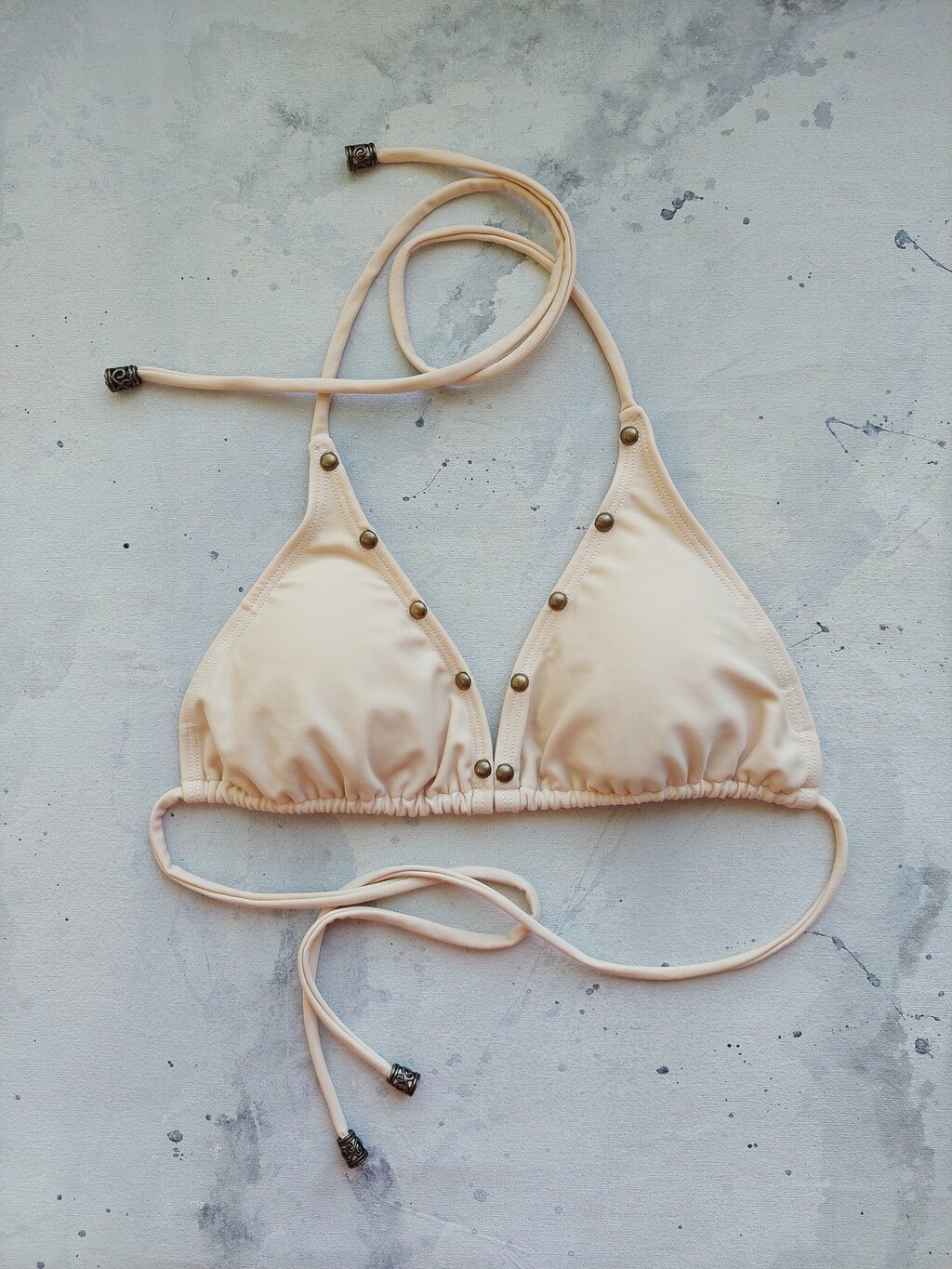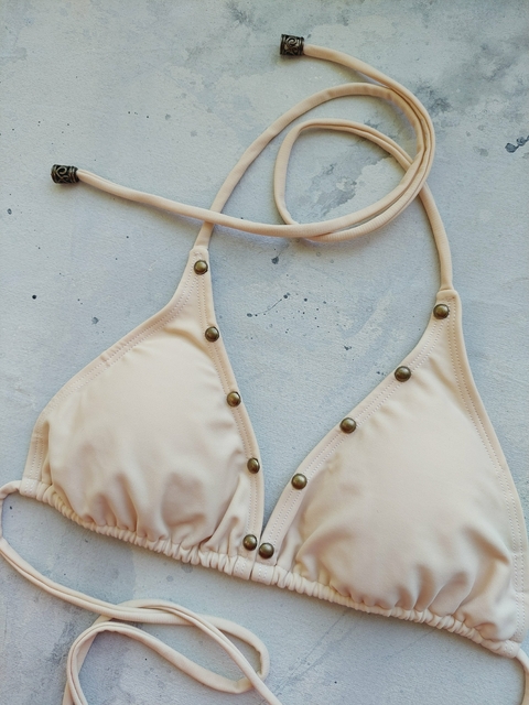 Bikini de lycra forrada con tazas desmontables. Corpiño básico de triangulitos con detalle de tachas doradas. Bombiless con detalles de tachas doradas también.