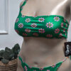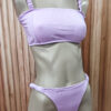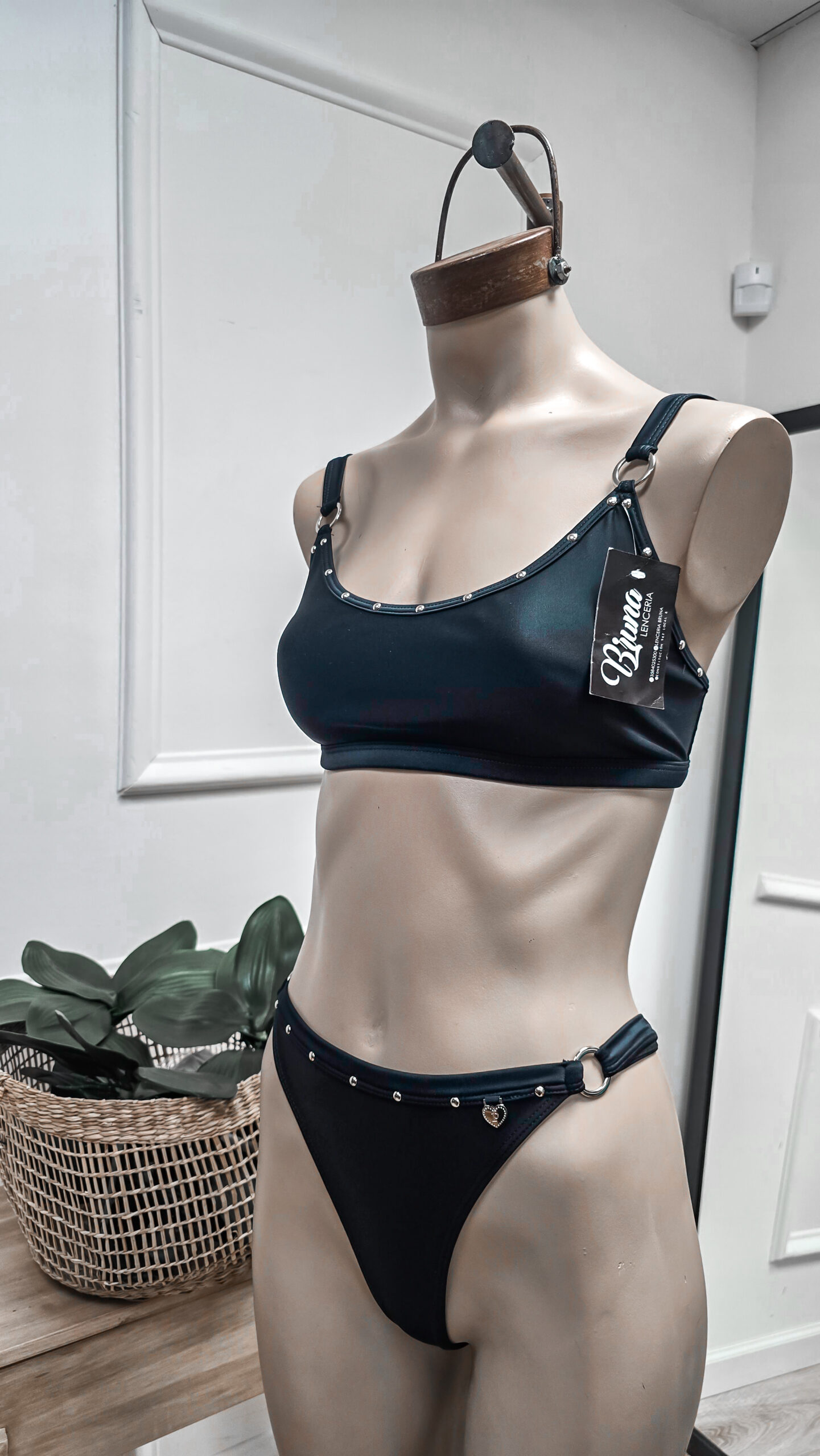 Bikini forrada lycra con detalles de tachas en top, corpiño tipo deportivo, con breteles regulables y prendidura trasera en espalda. Bombiless regulable.