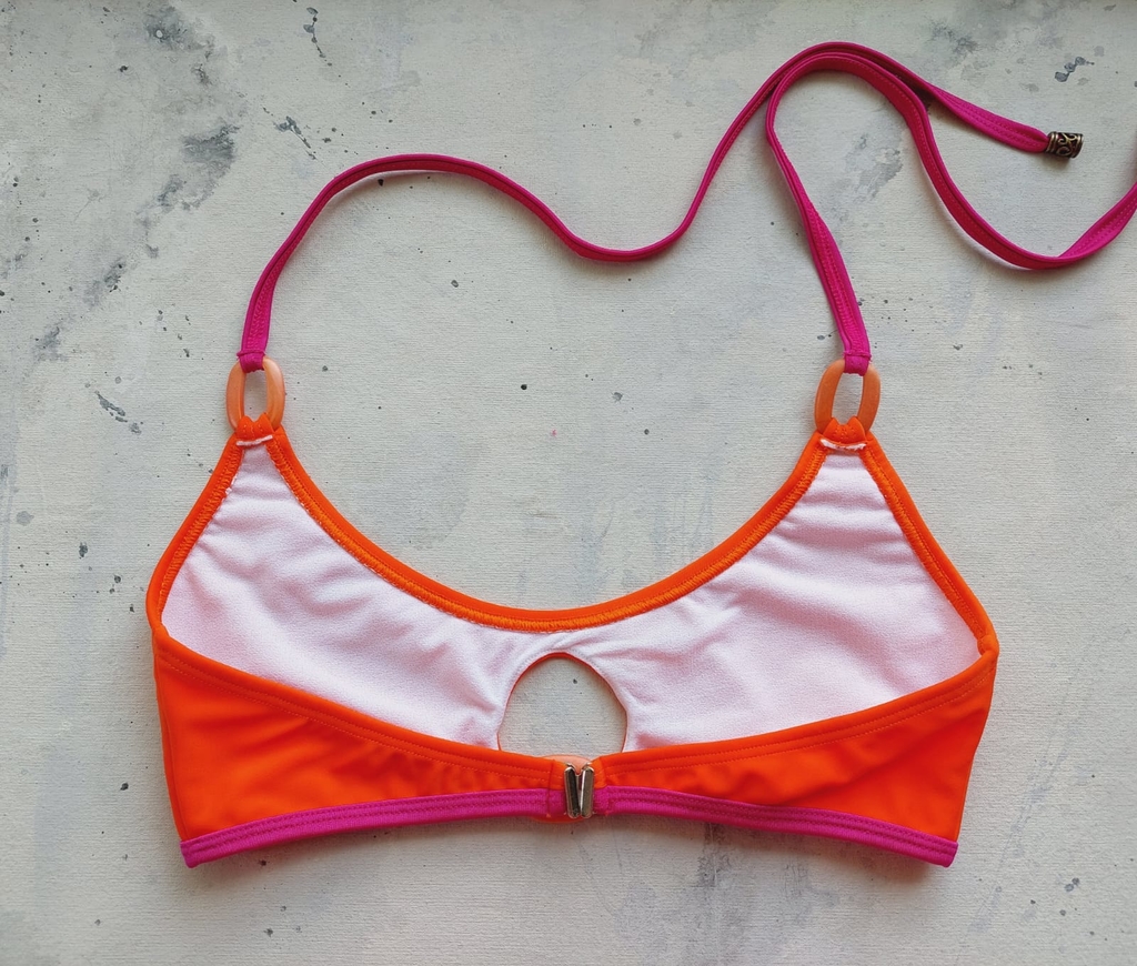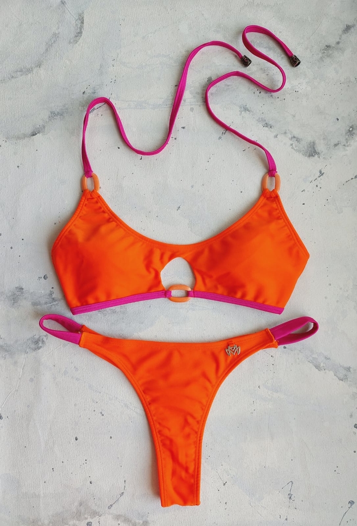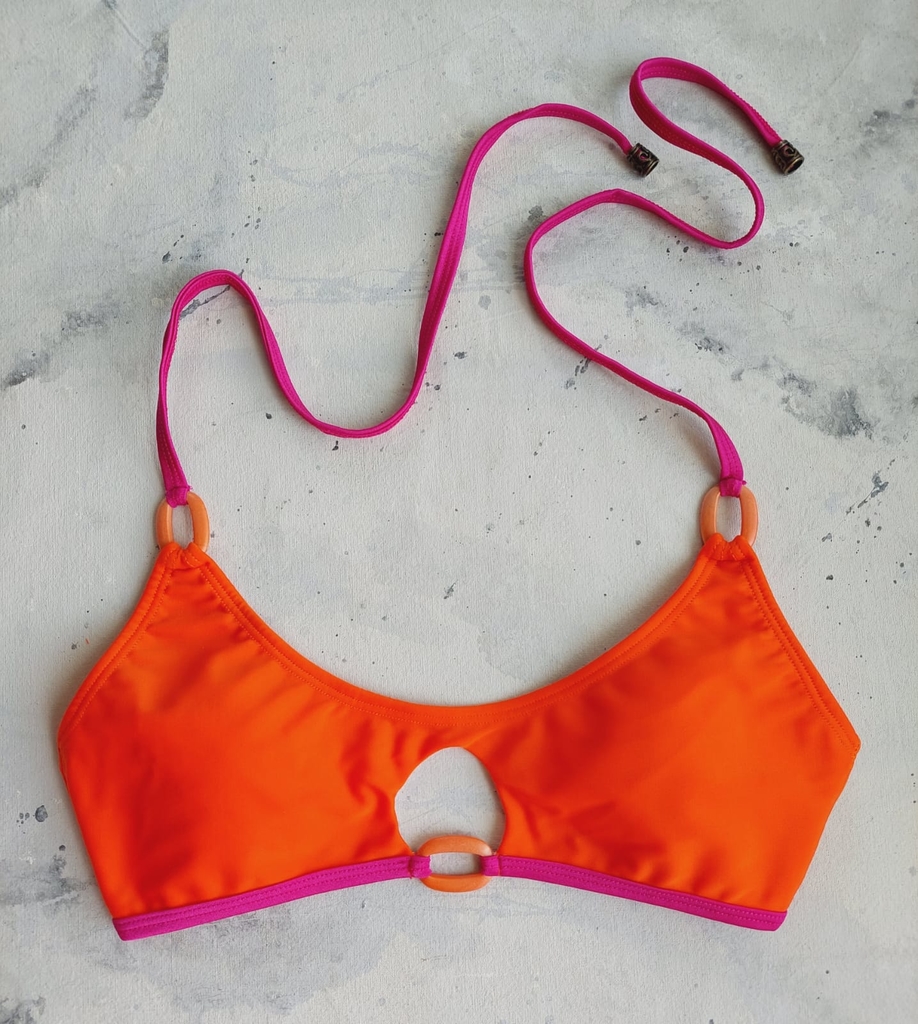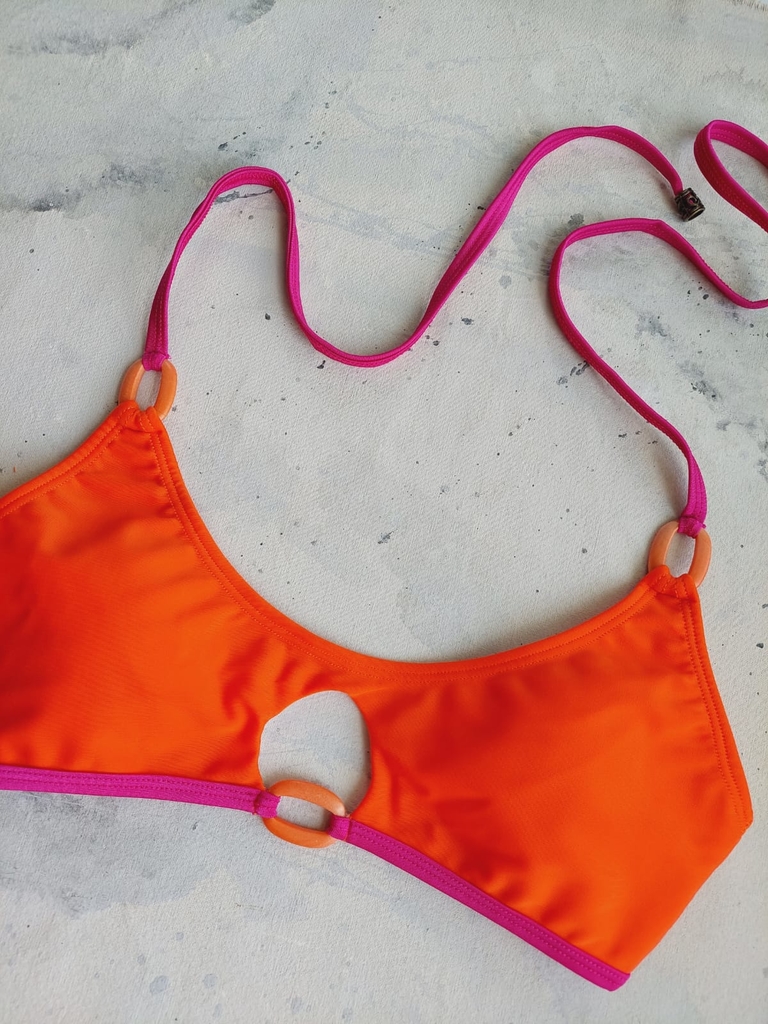 Bikini de lycra combinada. Corpiño con argollas en el centro delantero y en breteles que se atan al cuello, con prendidura trasera. Tanguiles que no se regula.
