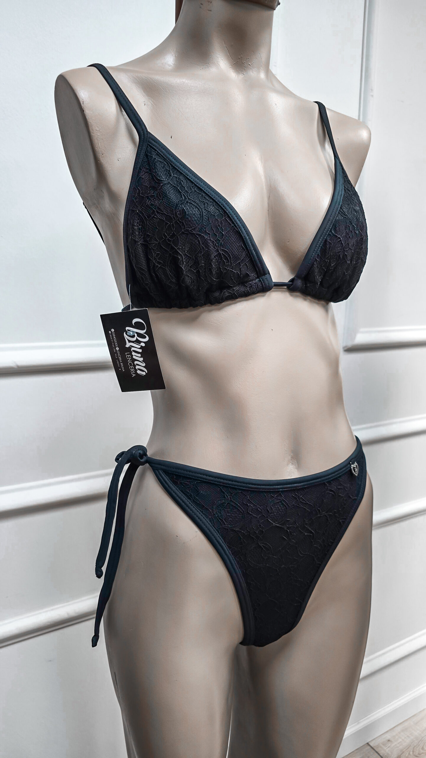 Bikini forrada con encaje, corpiño triángulo con tiras, la bombiless se atada a los costados.
