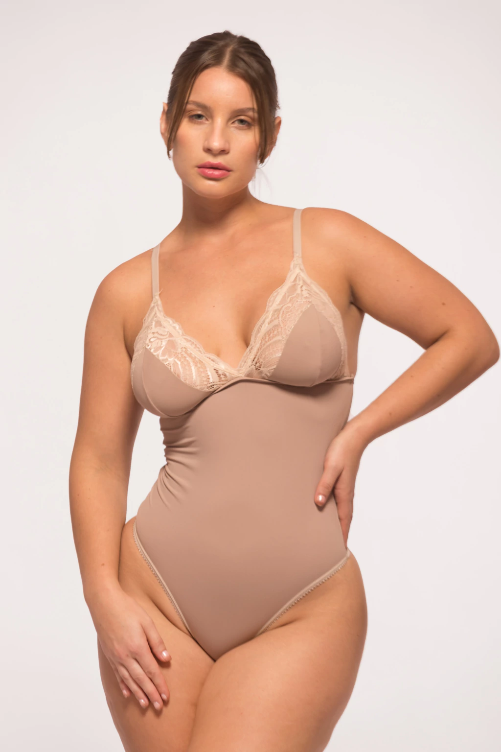 Body de lycra escote en v, corte debajo del busto y tazas triangulares sin armar, con recorte de puntilla en bordes. Sin broches en entrepierna. Breteles regulables.