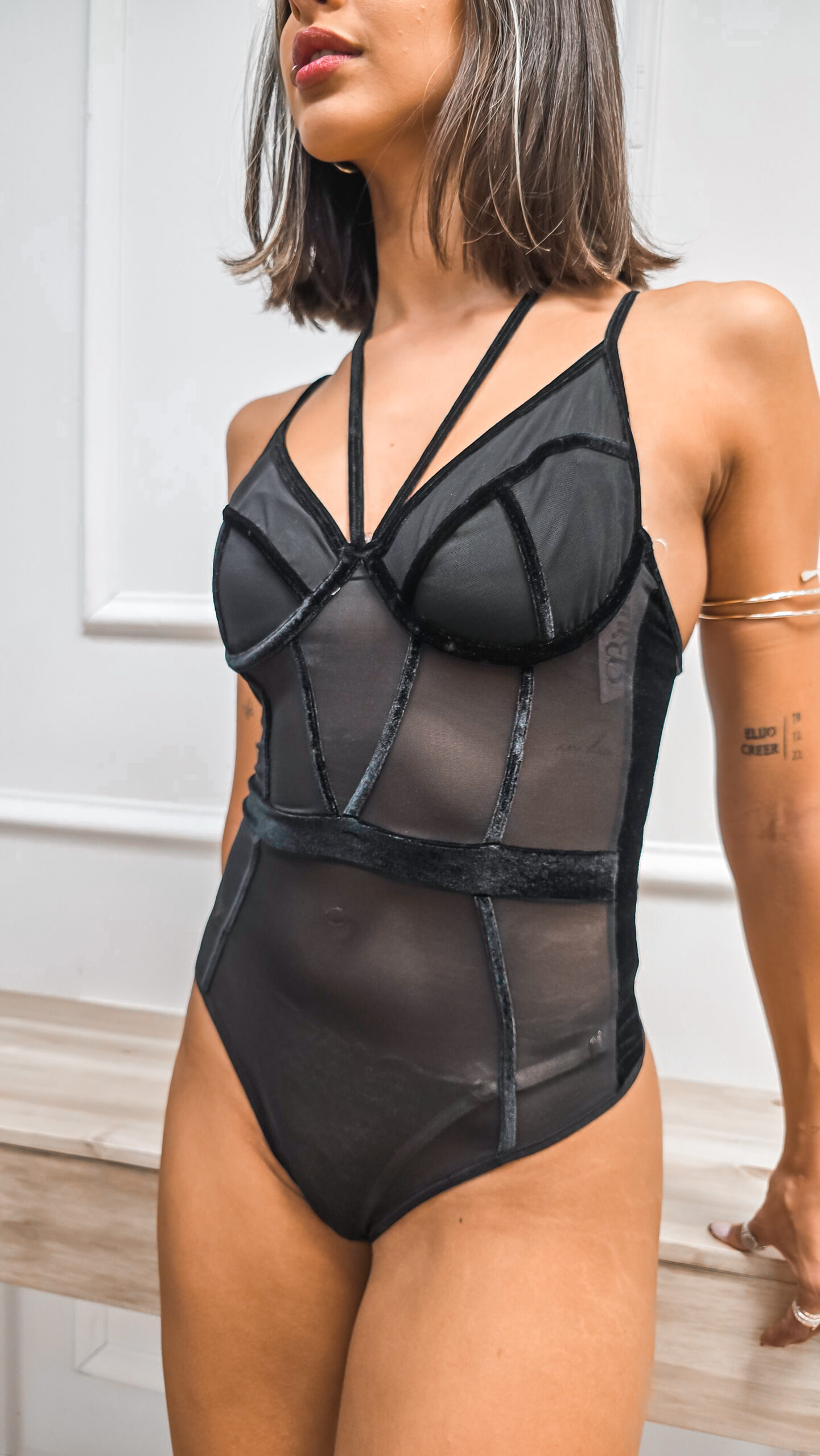 Body con aro y arnés de terciopelo. Tela micro tul, con doble tela en la parte de las tazas. Se abrocha con snap en entrepierna.