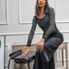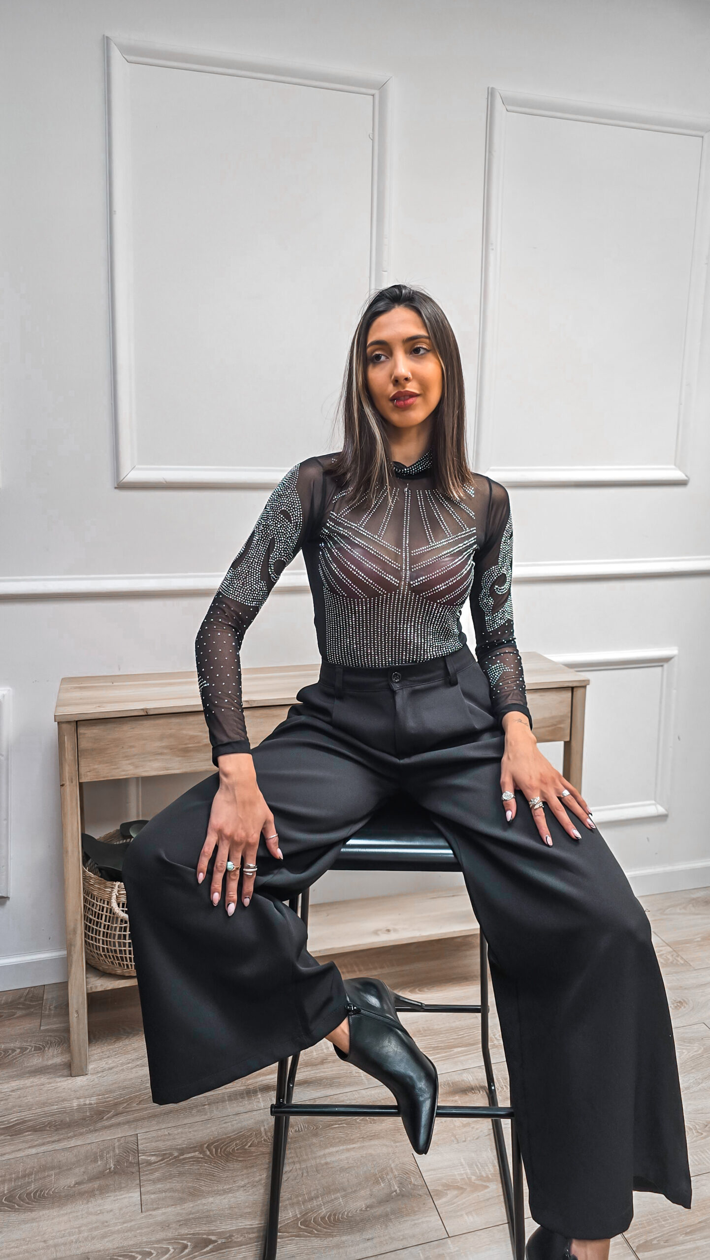 Body de microtull con strass, transparente, mangas largas, cuello media polera, prendidura en entrepiernas.
