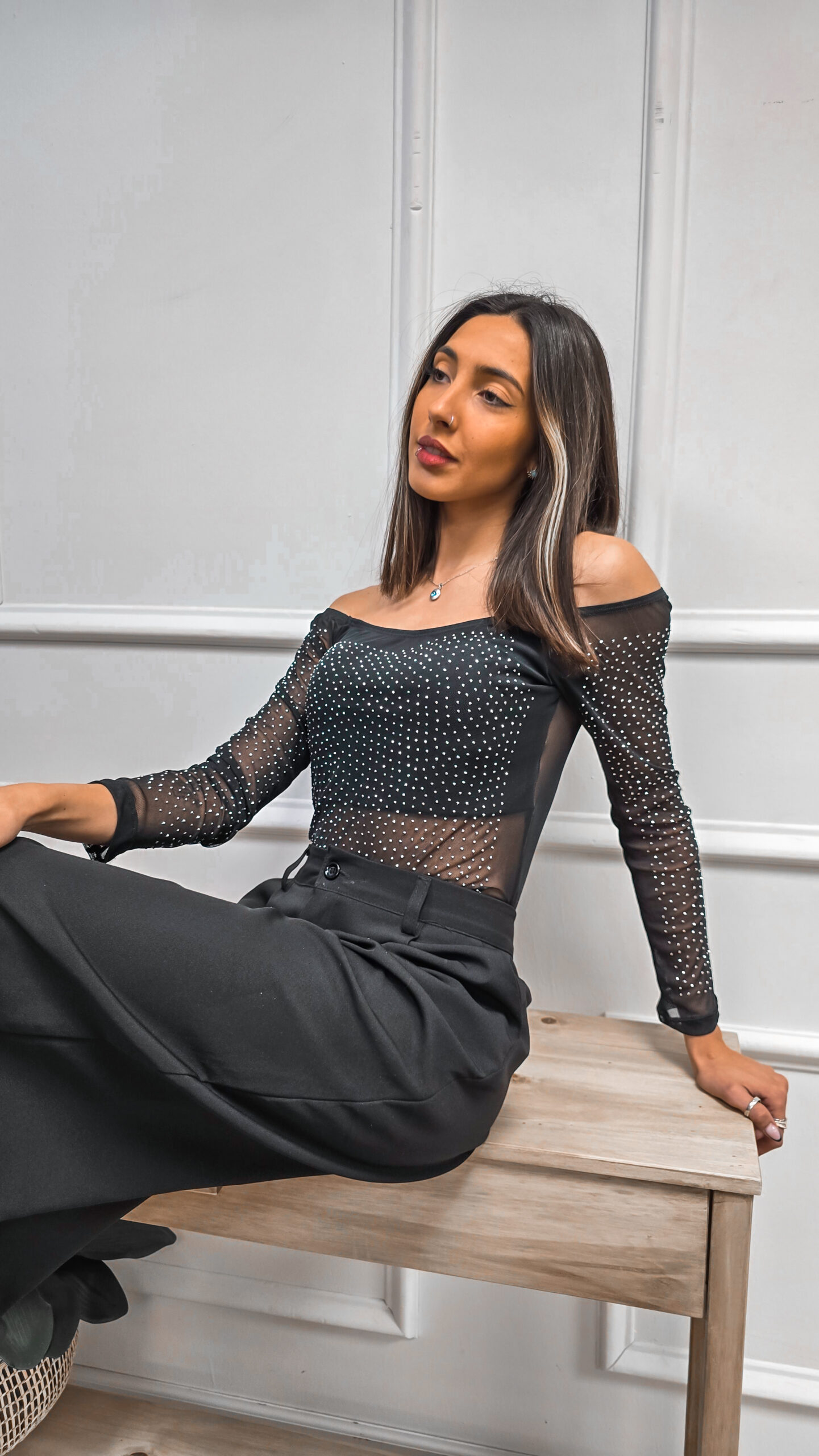 Body de microtul con strass, mangas largas, corte corazón, forrado con lycra por dentro, con tazas, cuello recto.
