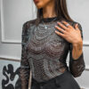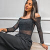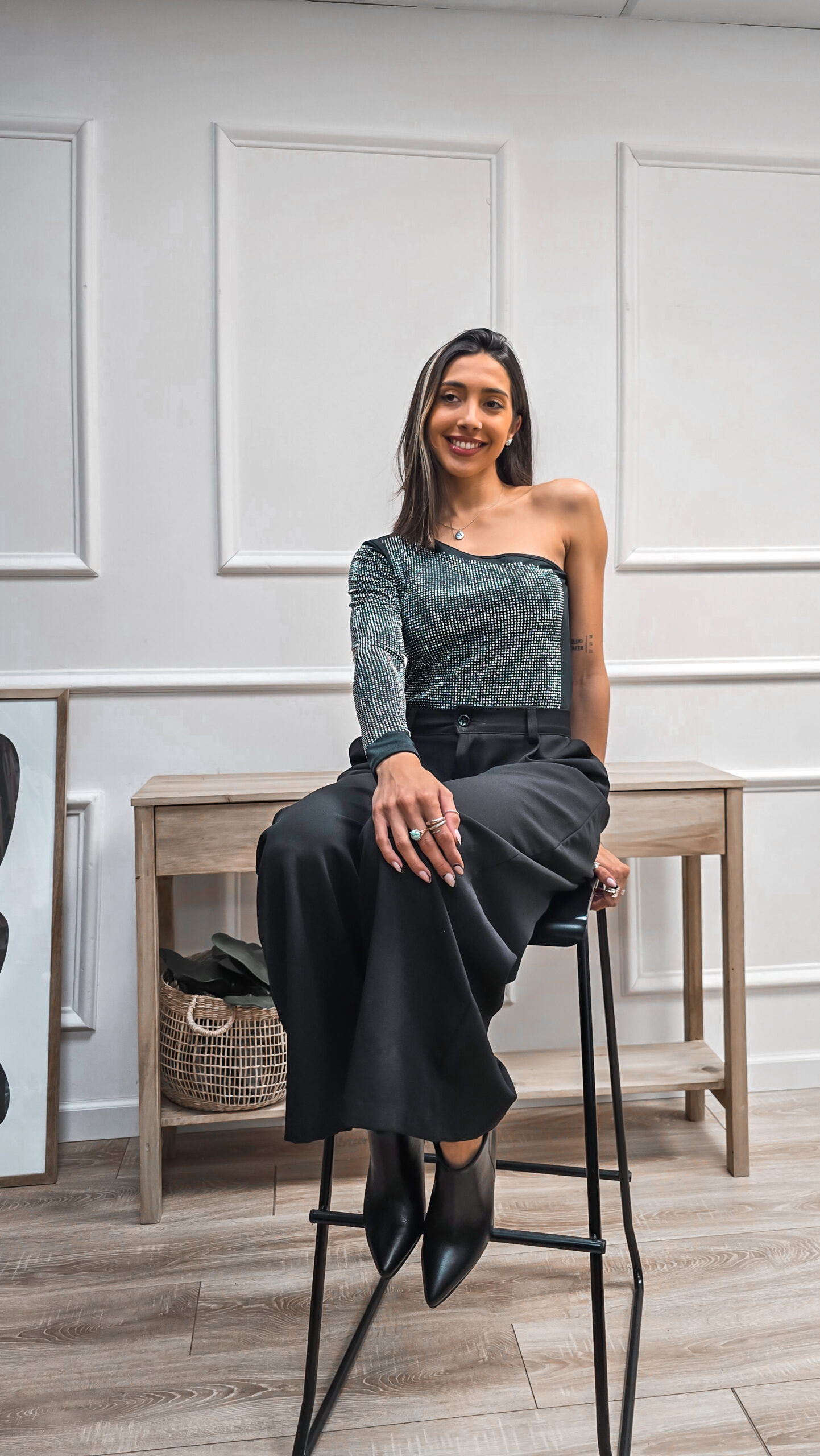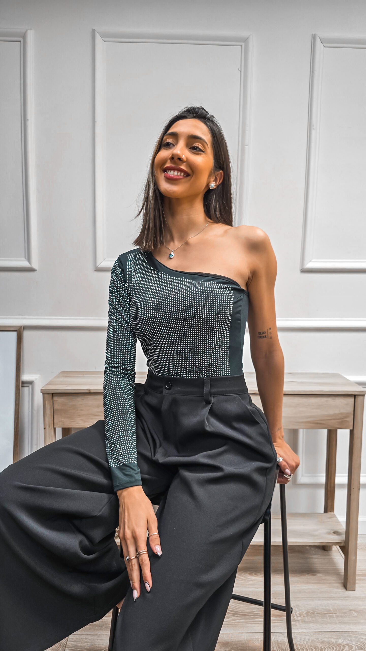Body de lycra con strass, con una sola manga larga, y el hombro izquierdo descubierto. Con prendidura en entrepiernas.