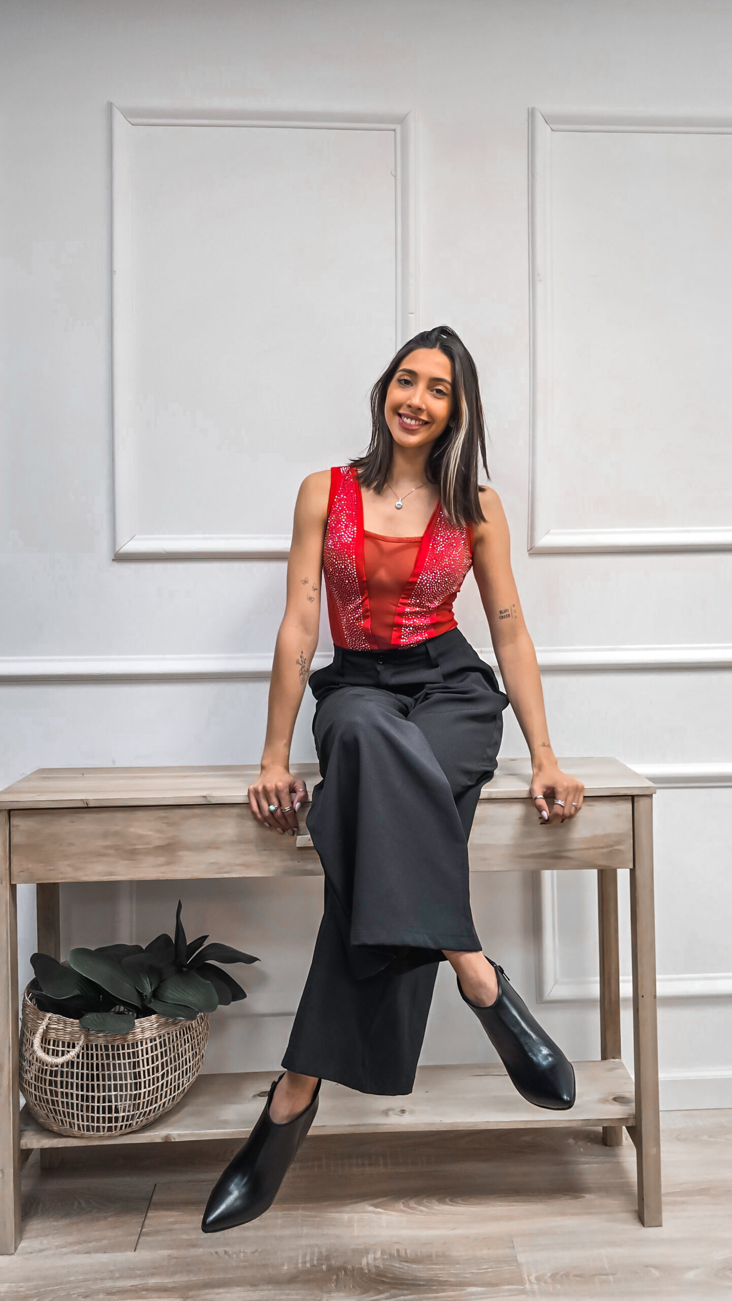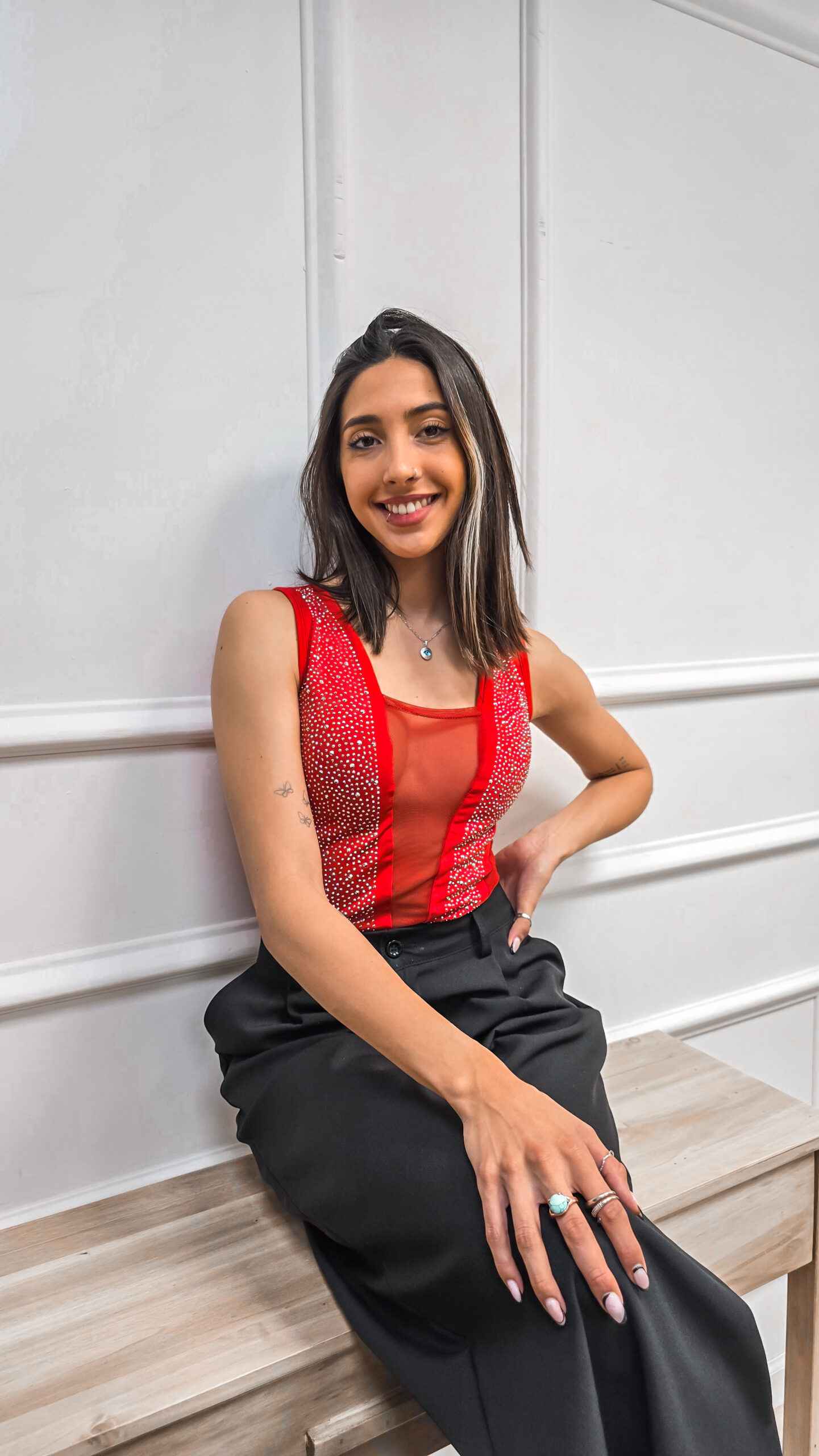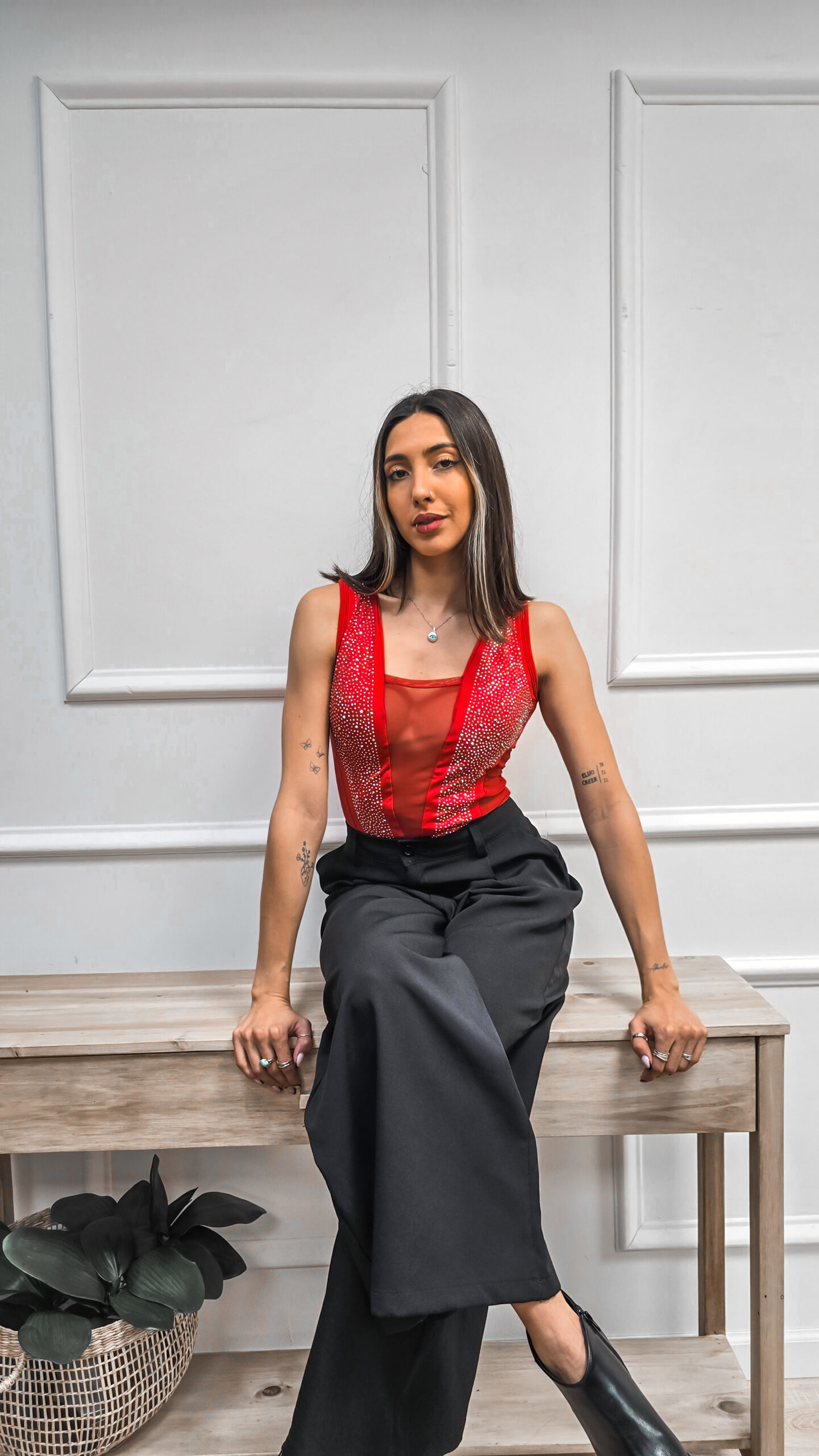 Body de lycra musculosa, con detalles de microtull y strass de brillos, con taza. Prendidura en entrepiernas.