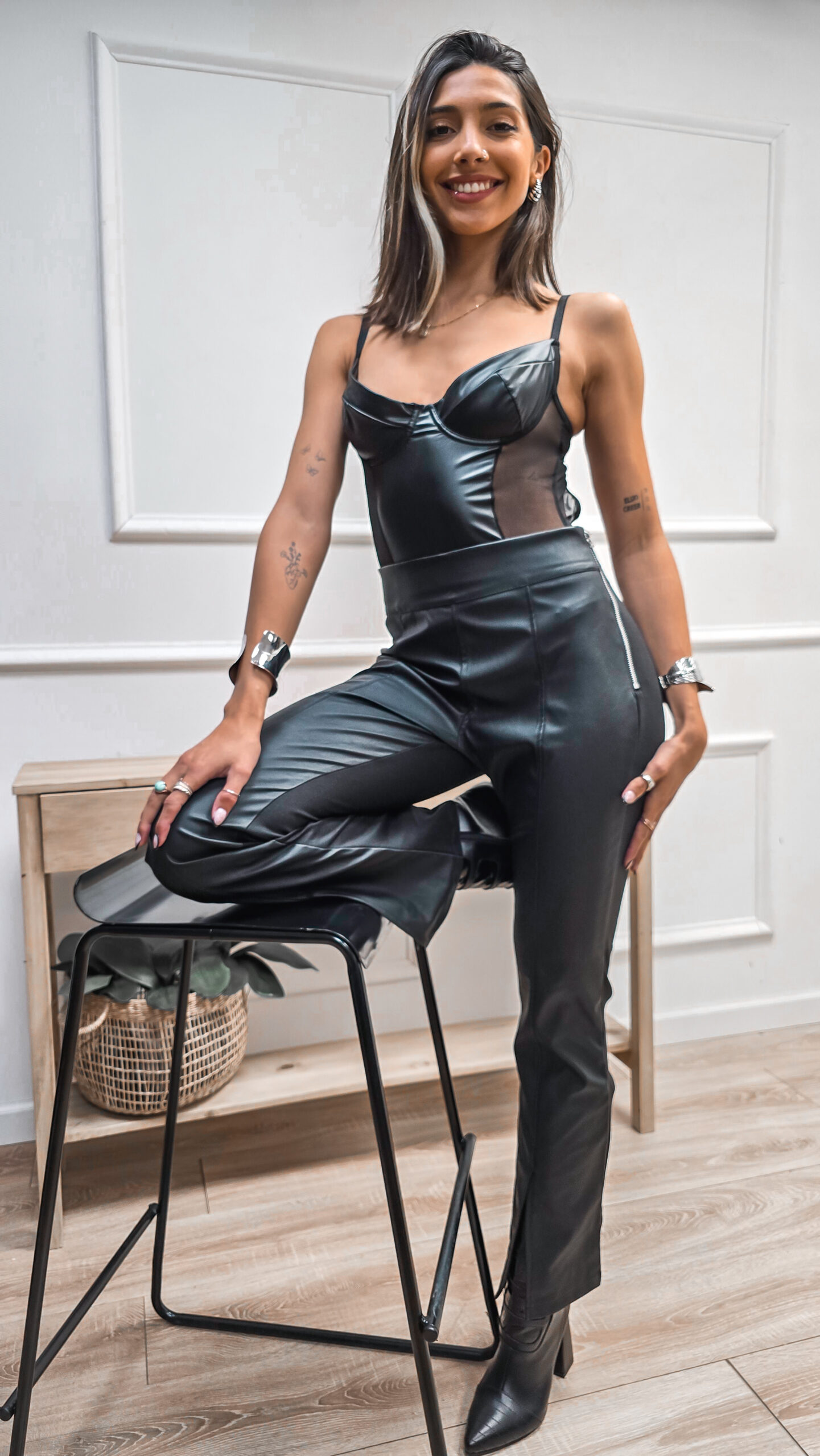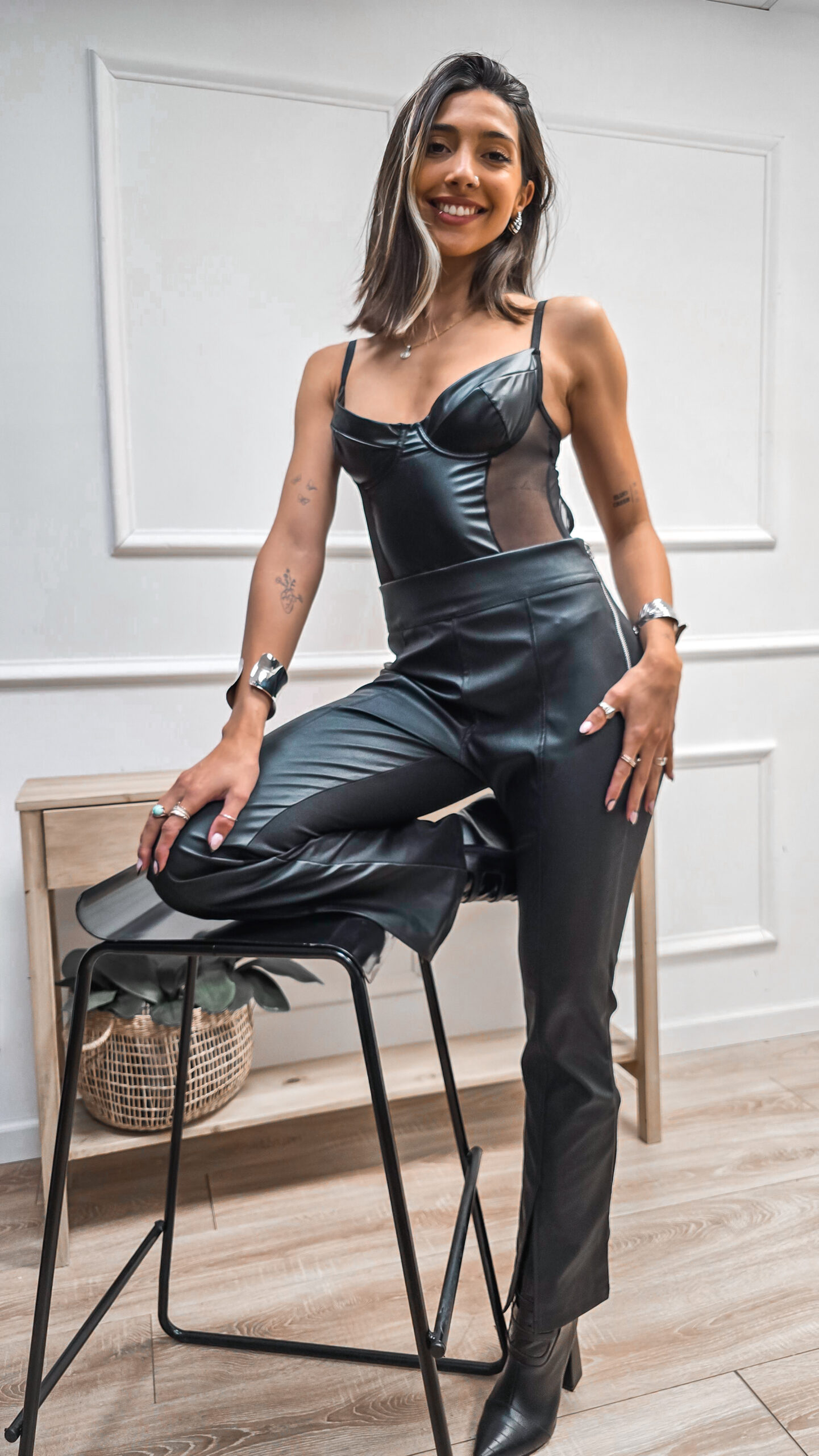 Body plenamente de lycra brillosa y microtul, color negro. Con breteles finos y regulables. Con recortes. Tazas sin relleno con aro. Prendidura en entrepiernas.