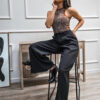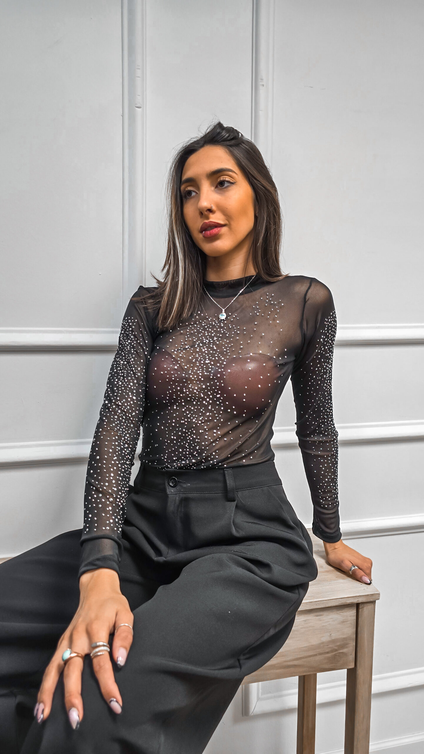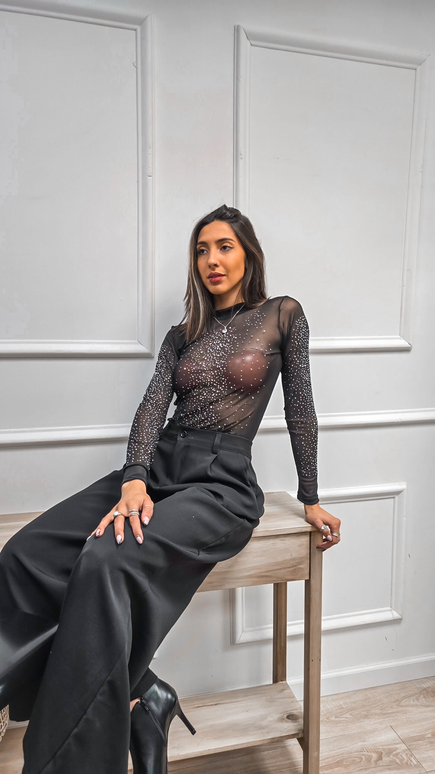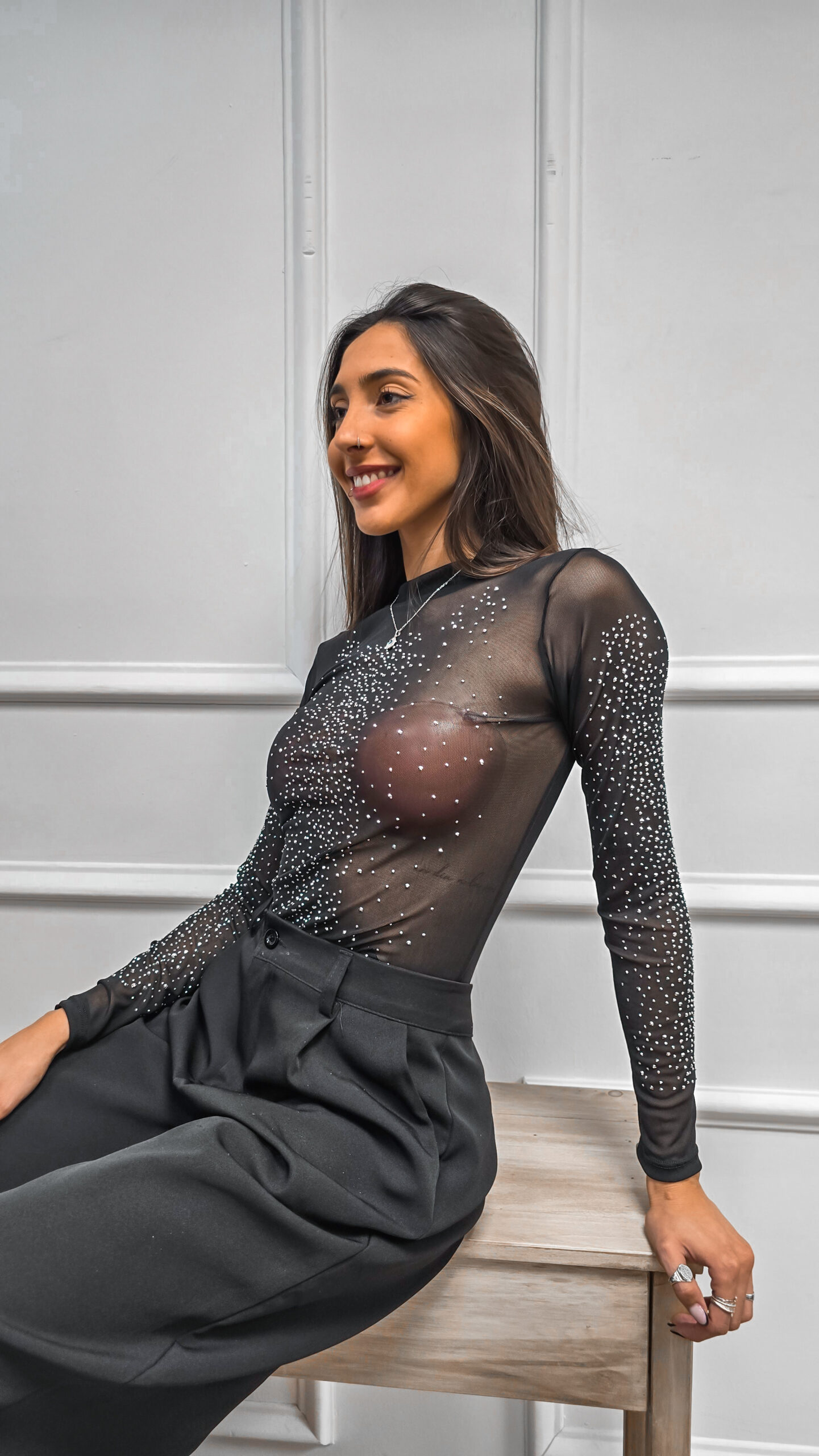Body de microtul con strass, transparente, mangas largas, cuello media polera, prendidura en entrepiernas.