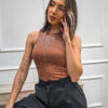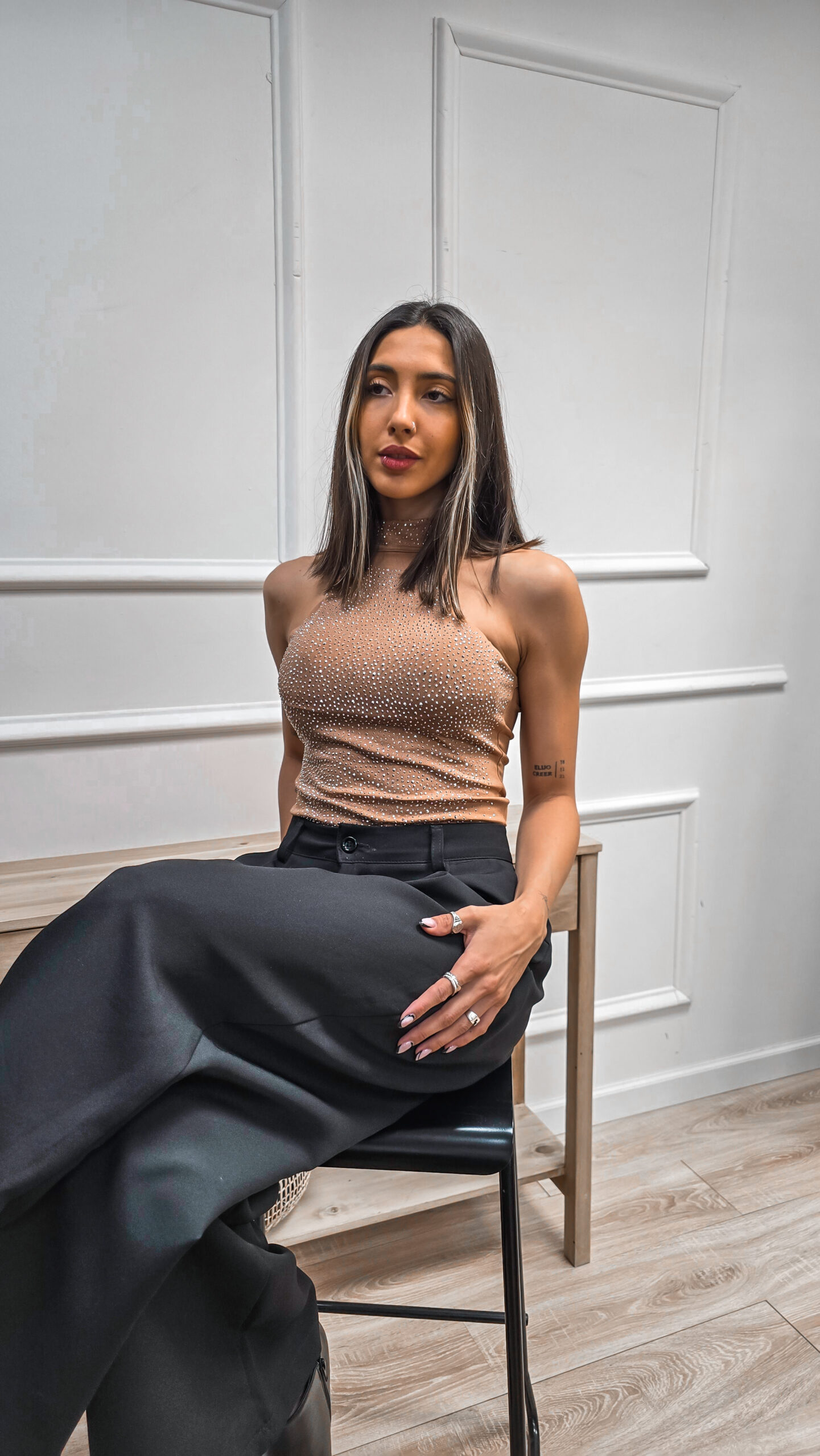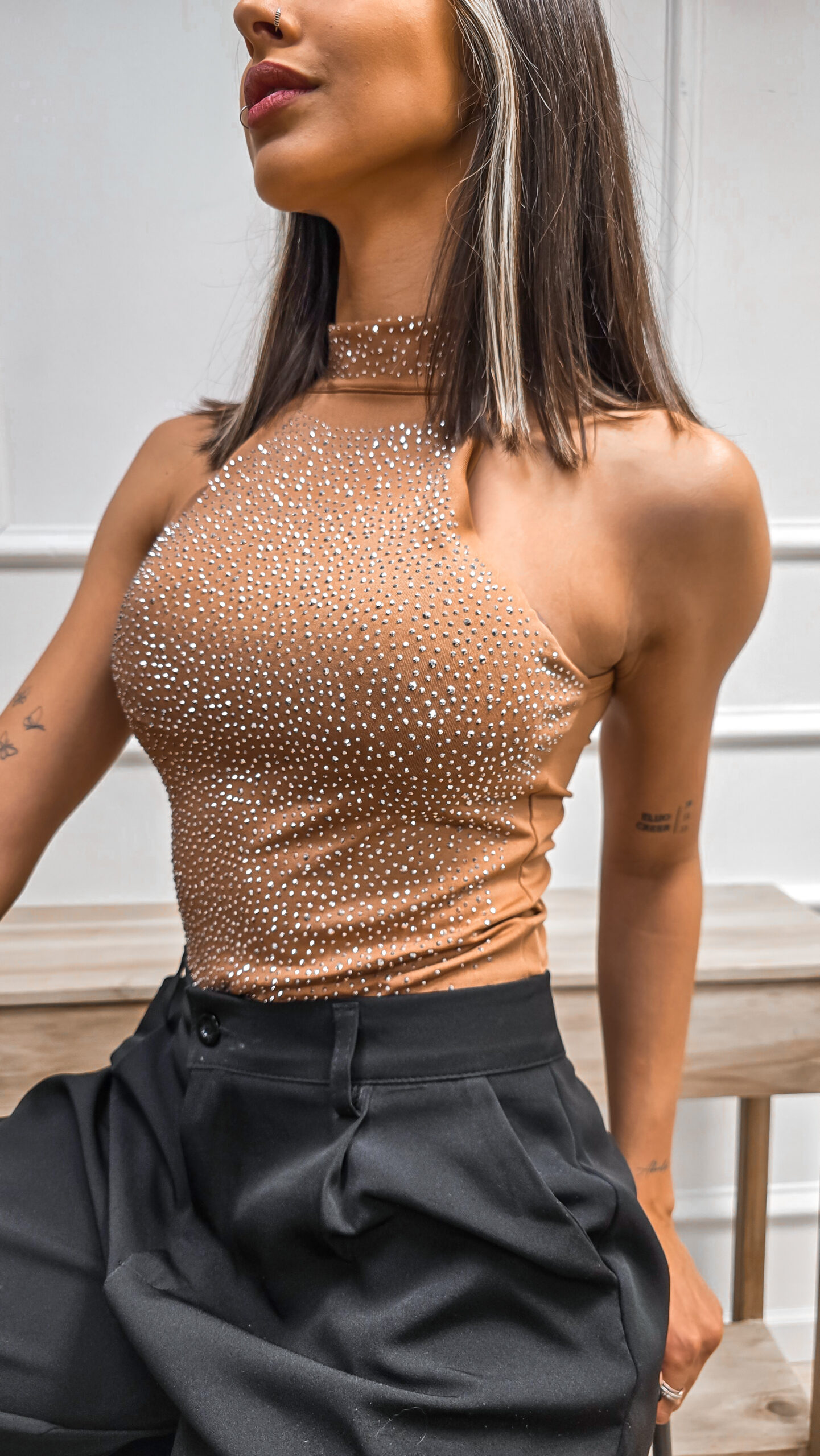 Body de lycra con strass, doble tela. Escote americano, cuello media polera, prendidura en entrepiernas.