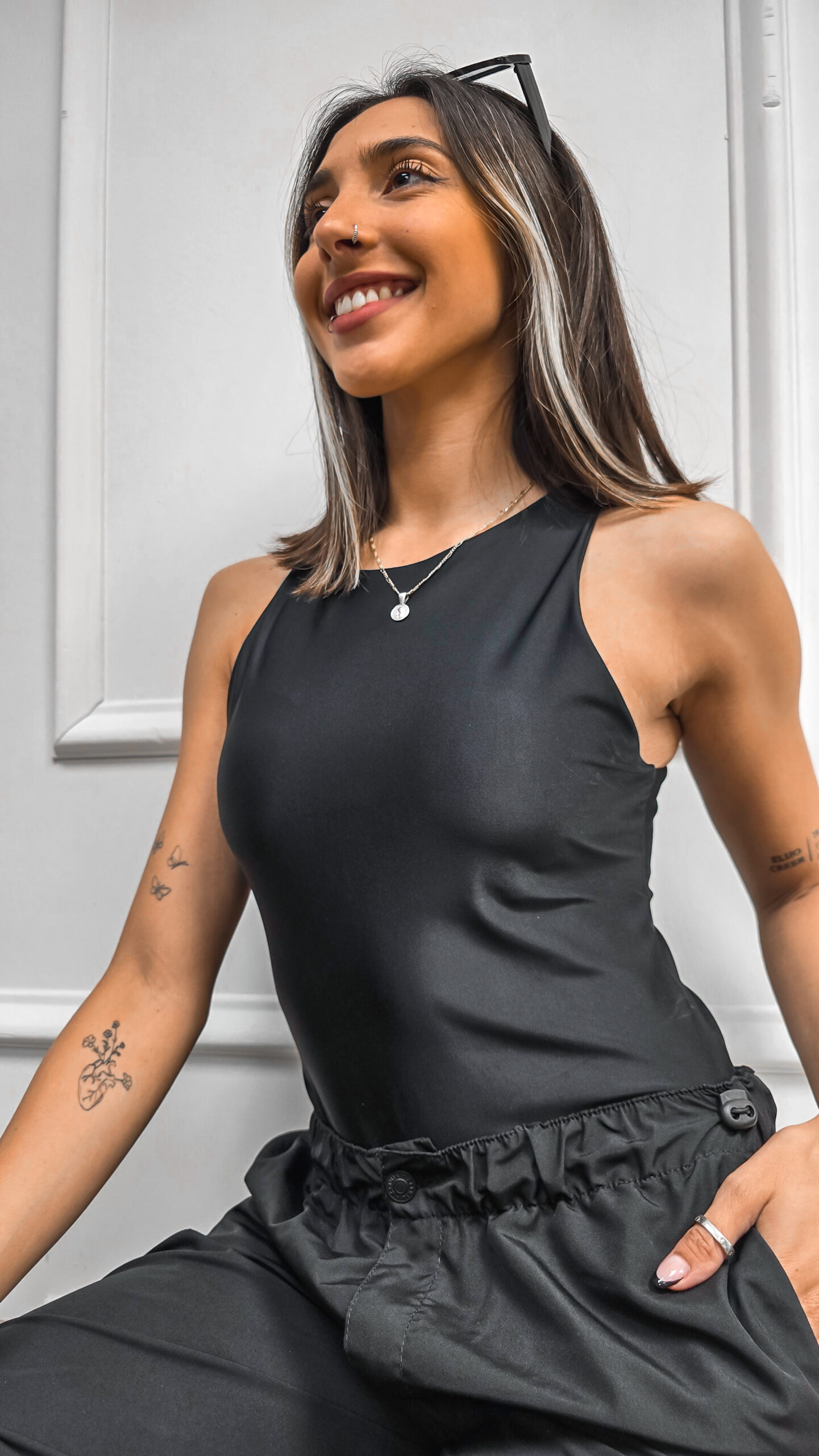 Body de lycra brillosa, doble tela, musculosa breteles anchos, cuello redondo, prendidura en entrepiernas.