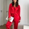 Pijama de seda corto. Camisa mangas cortas abotonada con borde combinado de otro color. Short con elástico en la pretina de la cintura.