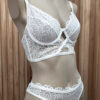 Conjunto de lencería. Corpiño Bralette triangulito, sin relleno, forrado, de encaje, con bajo busto ancho de lycra, tipo bustier. Modelo sin prendiduras. Breteles regulables. Con vedetina.