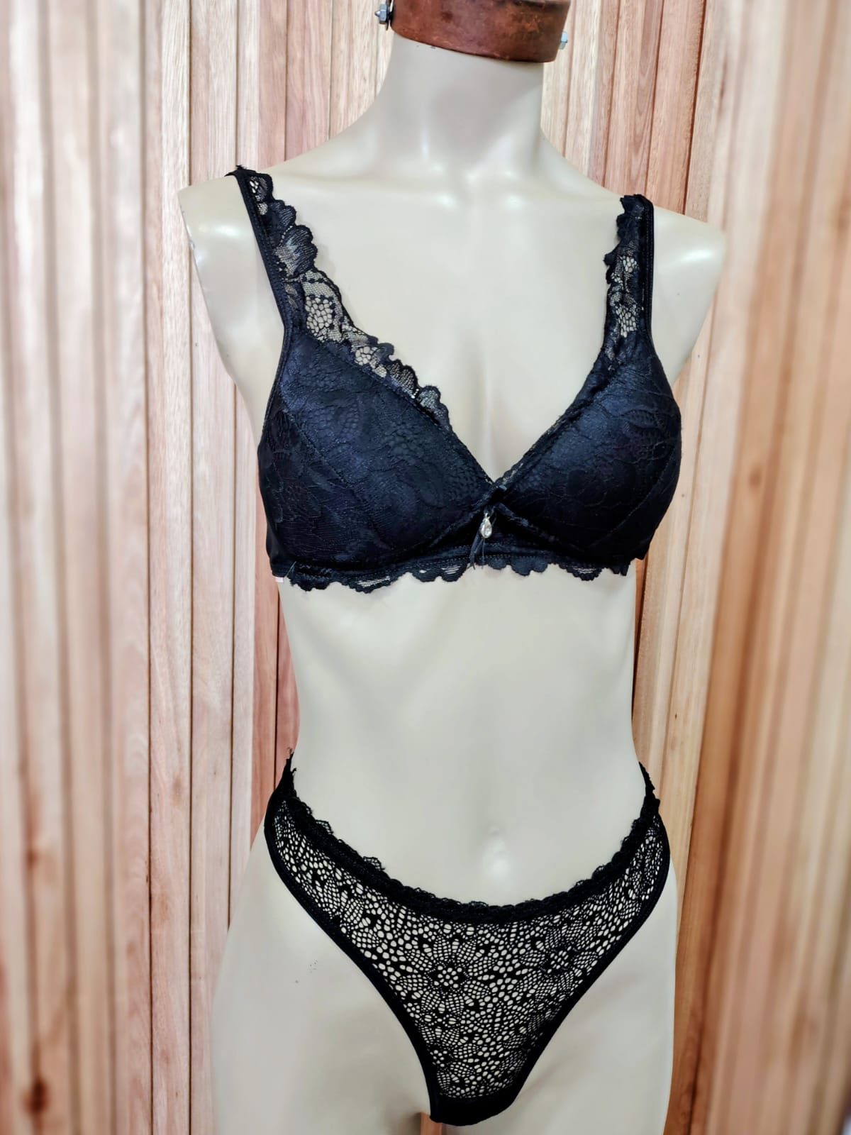 Conjunto de encaje estilo romántico. Corpiño triangulo soft, con bajo busto. Bretel romántico, regulable, coleta de microtul, prendidura trasera. Bombiless.