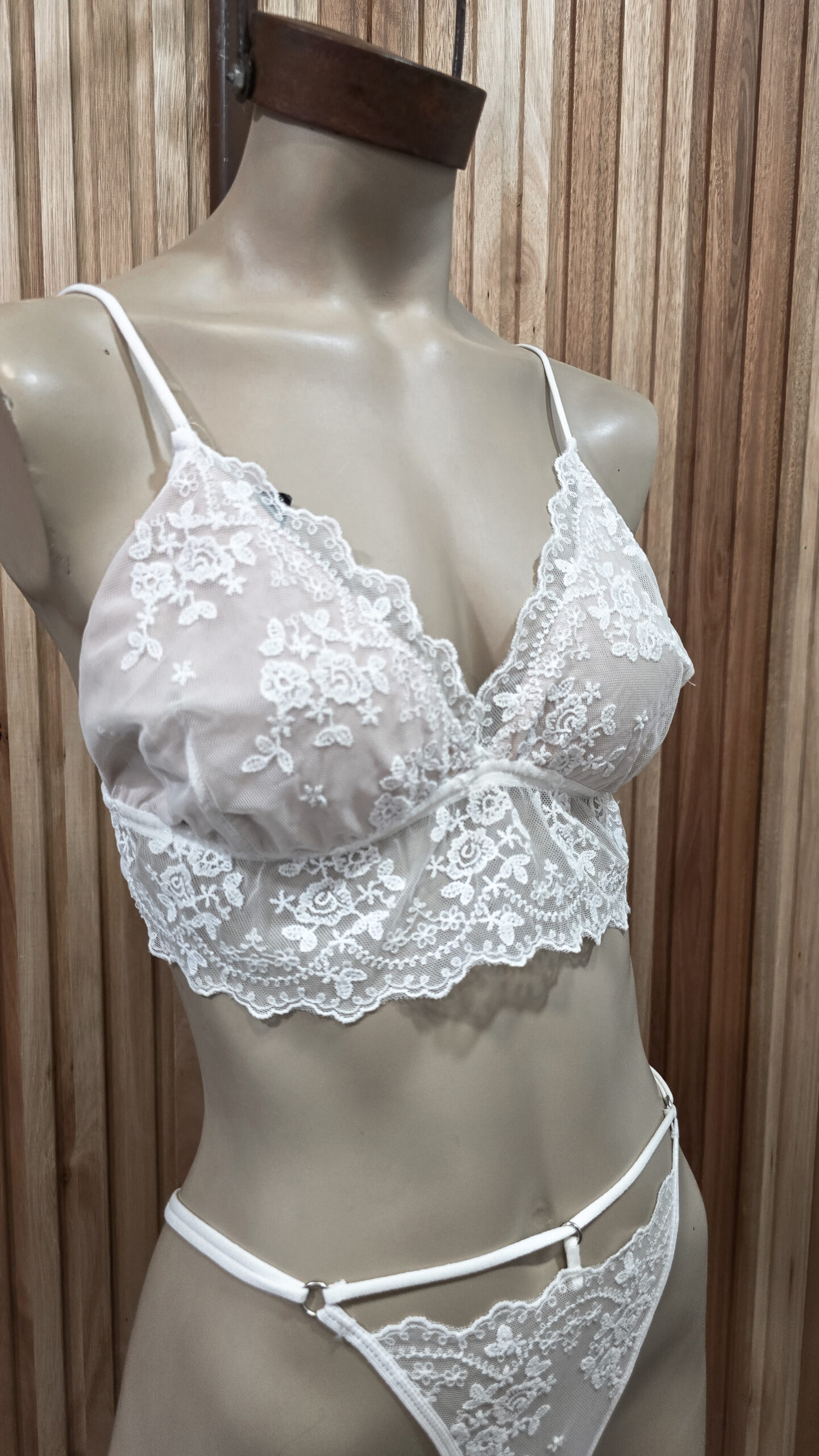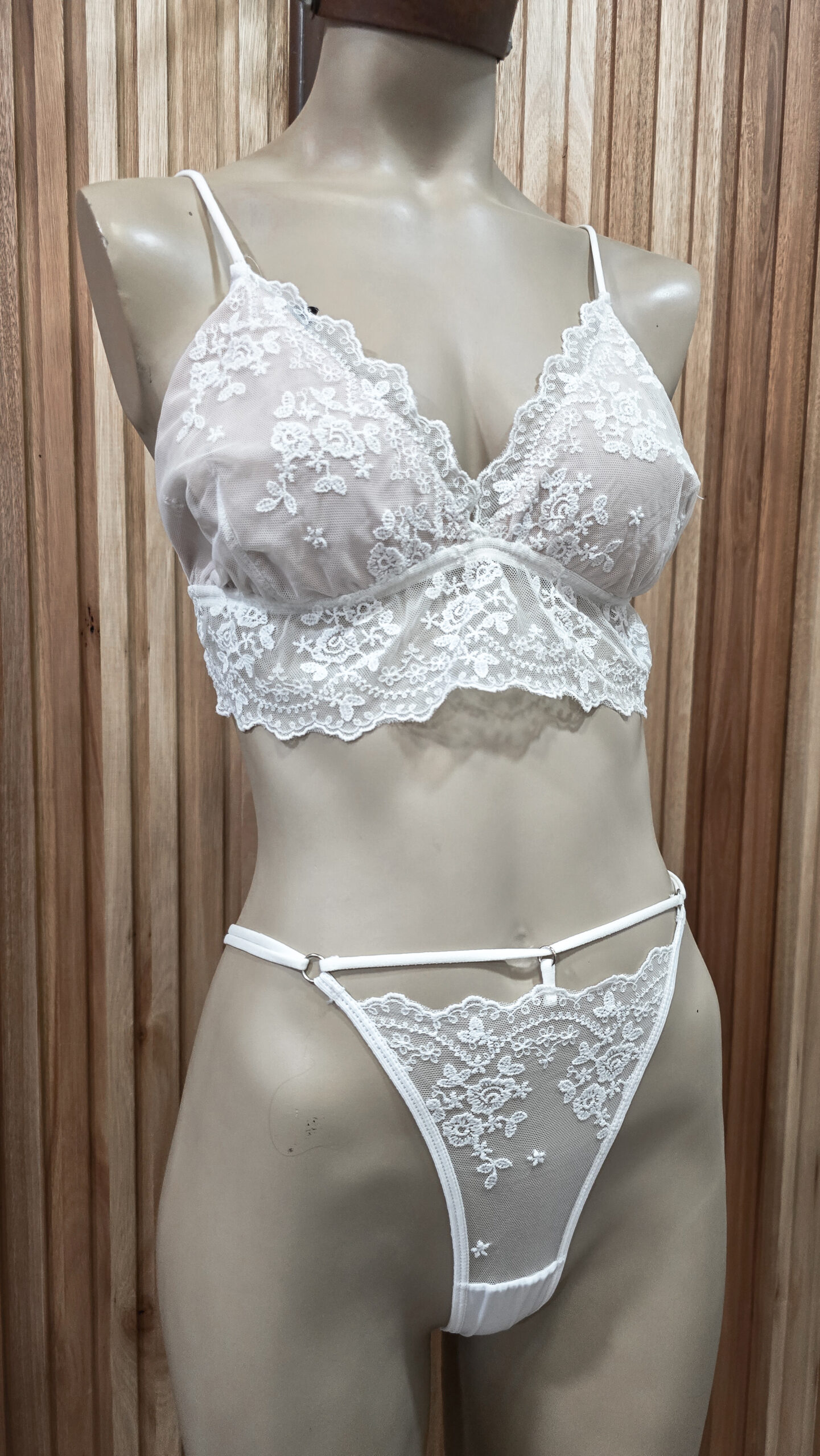 Conjunto de lencería de microtul bordado. Bralette con con bajo busto ancho. Sin coleta, breteles finos de colita de rata regulables y prendidura trasera. Tangui less de microtul y detalle de elástico colita de rata con argollita en la cintura.