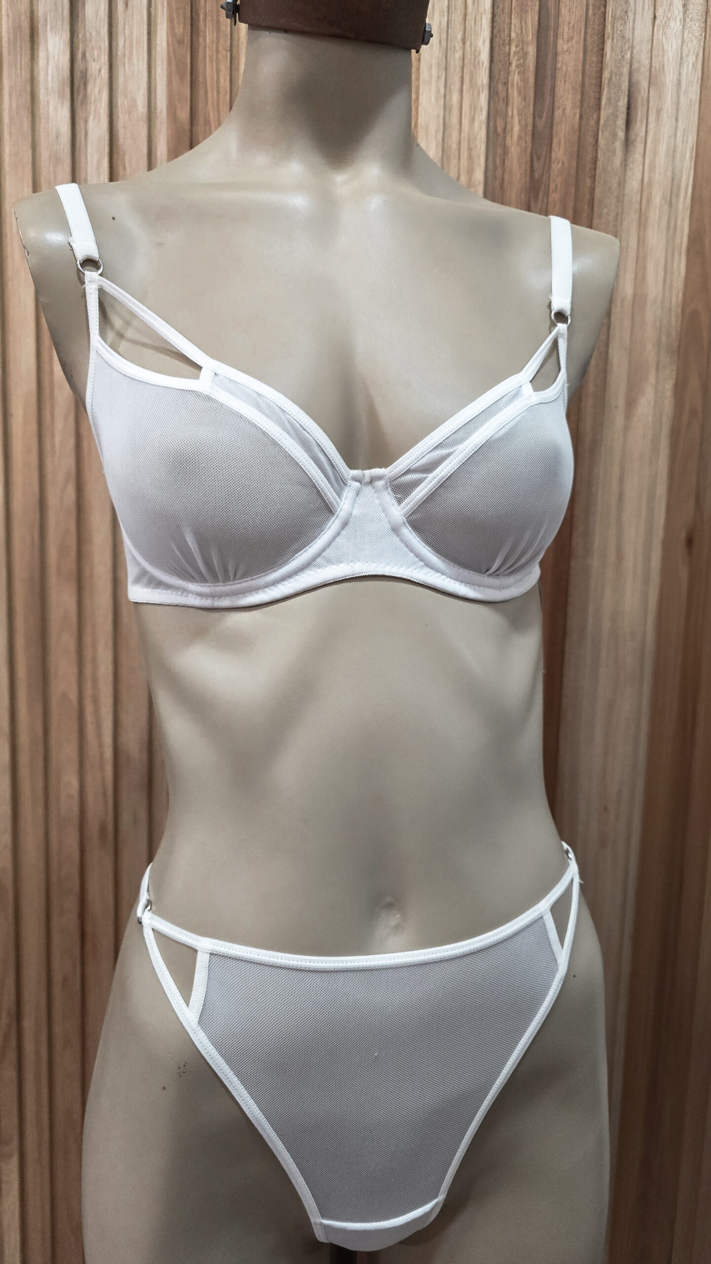 Bralette con aro, de microtul, detalle de recorte en taza. Con coleta, breteles regulables y prendidura trasera. Tangui less de microtul con detalle de recorte también.