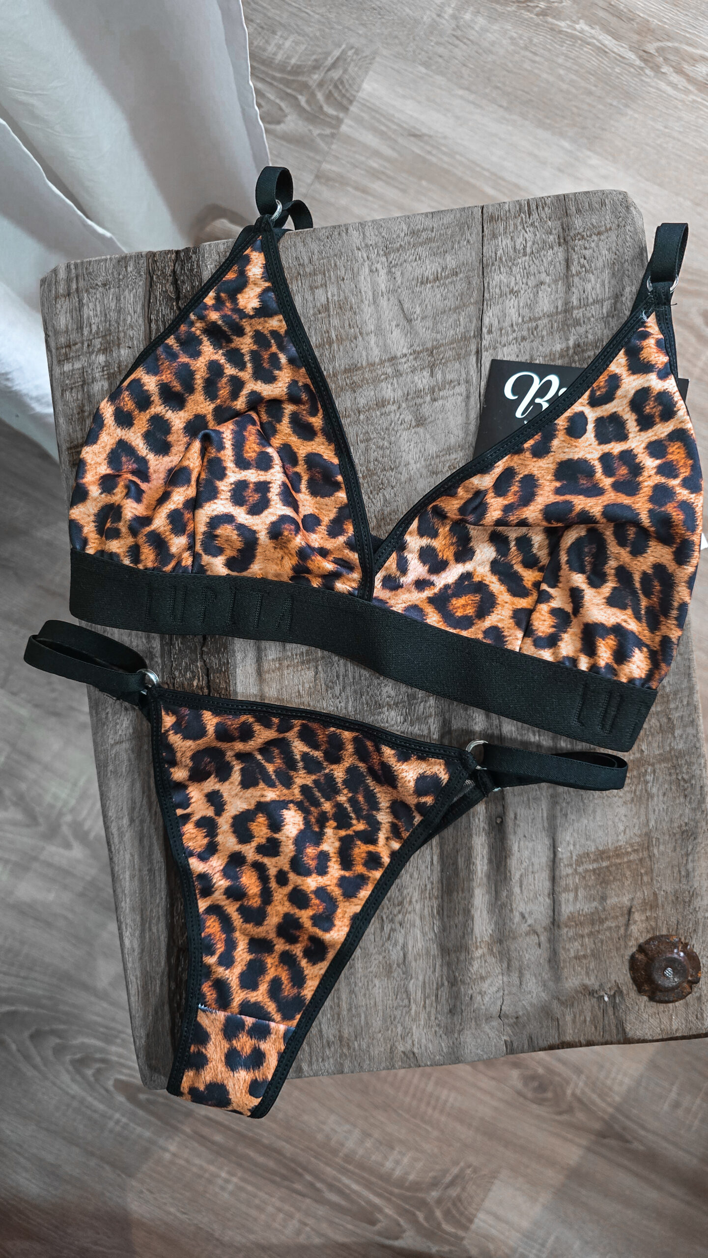 Conjunto de lycra. Corpiño bralette, bajo busto de elastico, avíos de acrílicos, coleta de microtull, prendidura trasera. Tangui less regulable avíos de acrílicos.