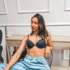Conjunto de lycra. Doble tela, costuras escondidas. Corpiño top (sin prendidura trasera) escote en V, con tazas removibles, breteles que comienzan super ancho, regulables. Tangui less regulable.
