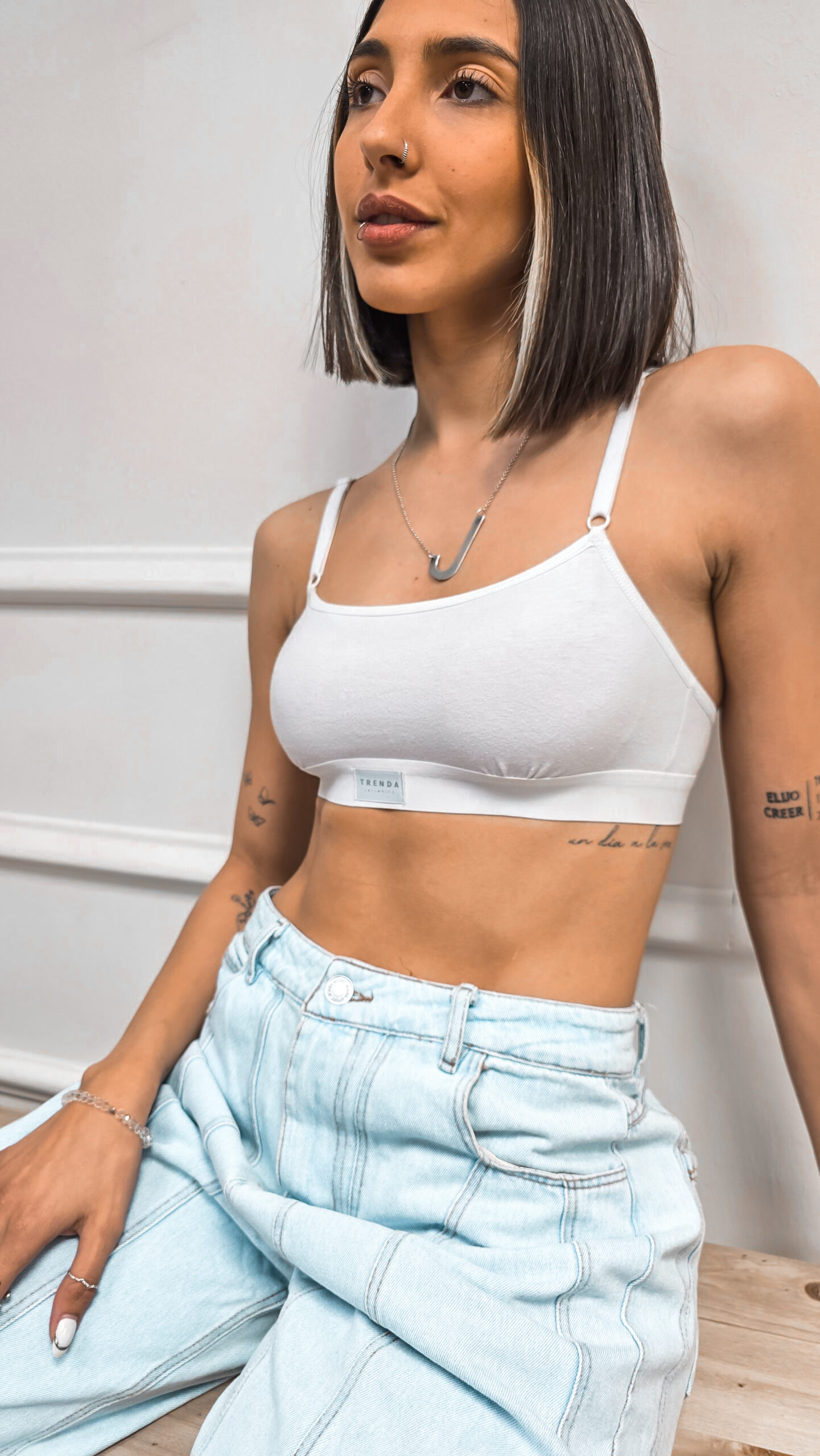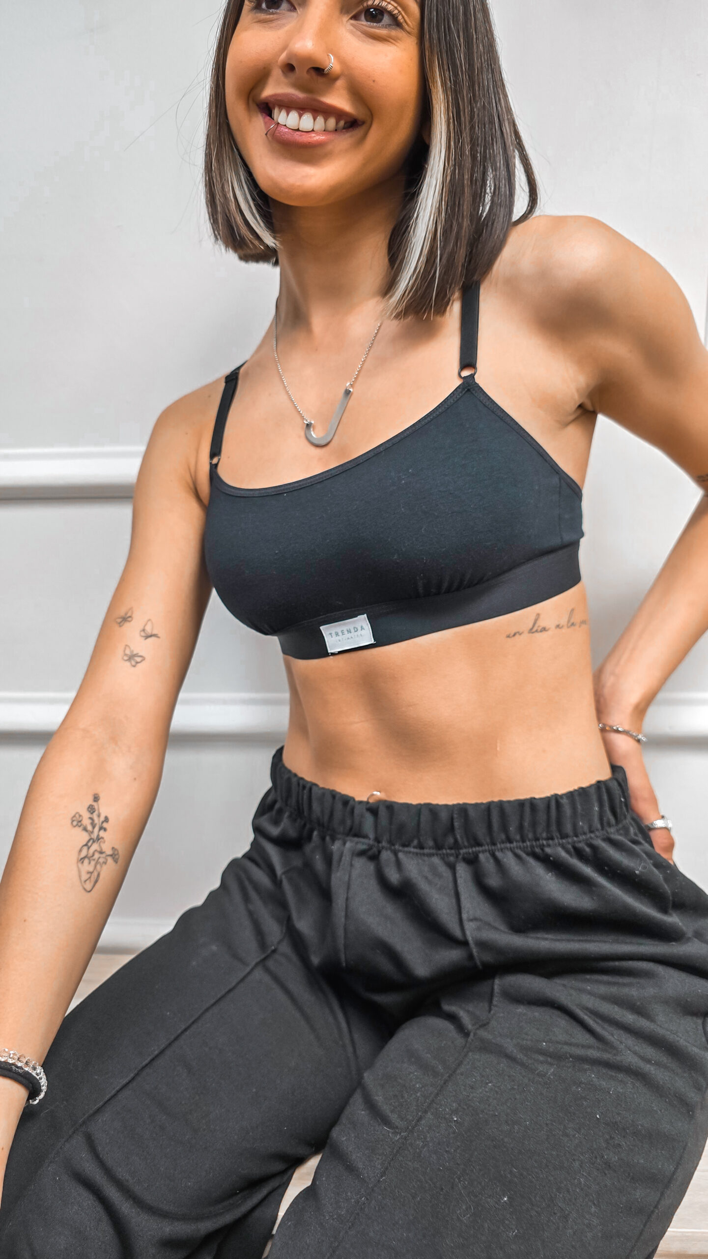 Conjunto básico de algodón 100%. Top deportivo, bajo busto de elástico. Coleta ancha, prendidura trasera. Bombiless.