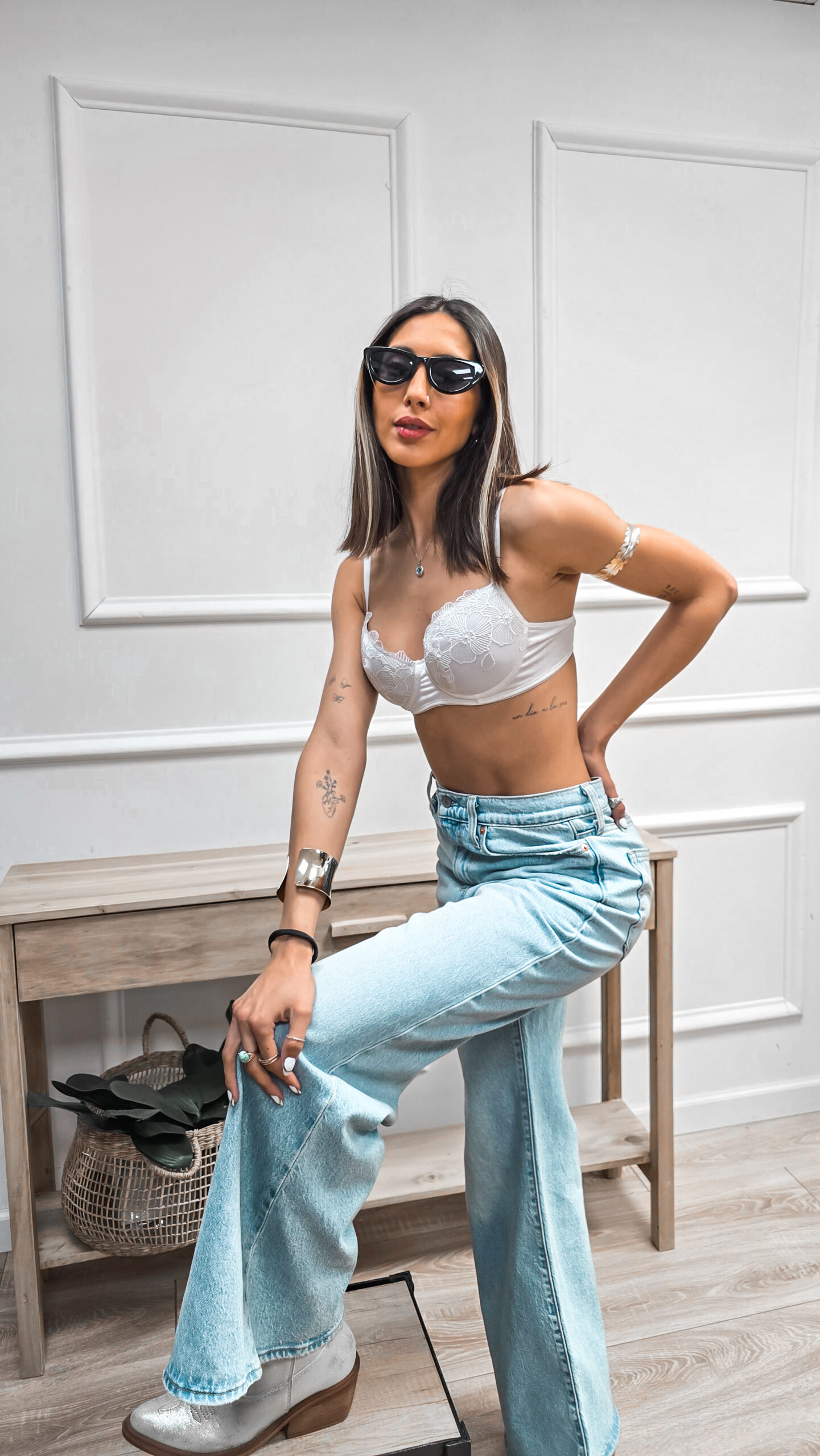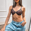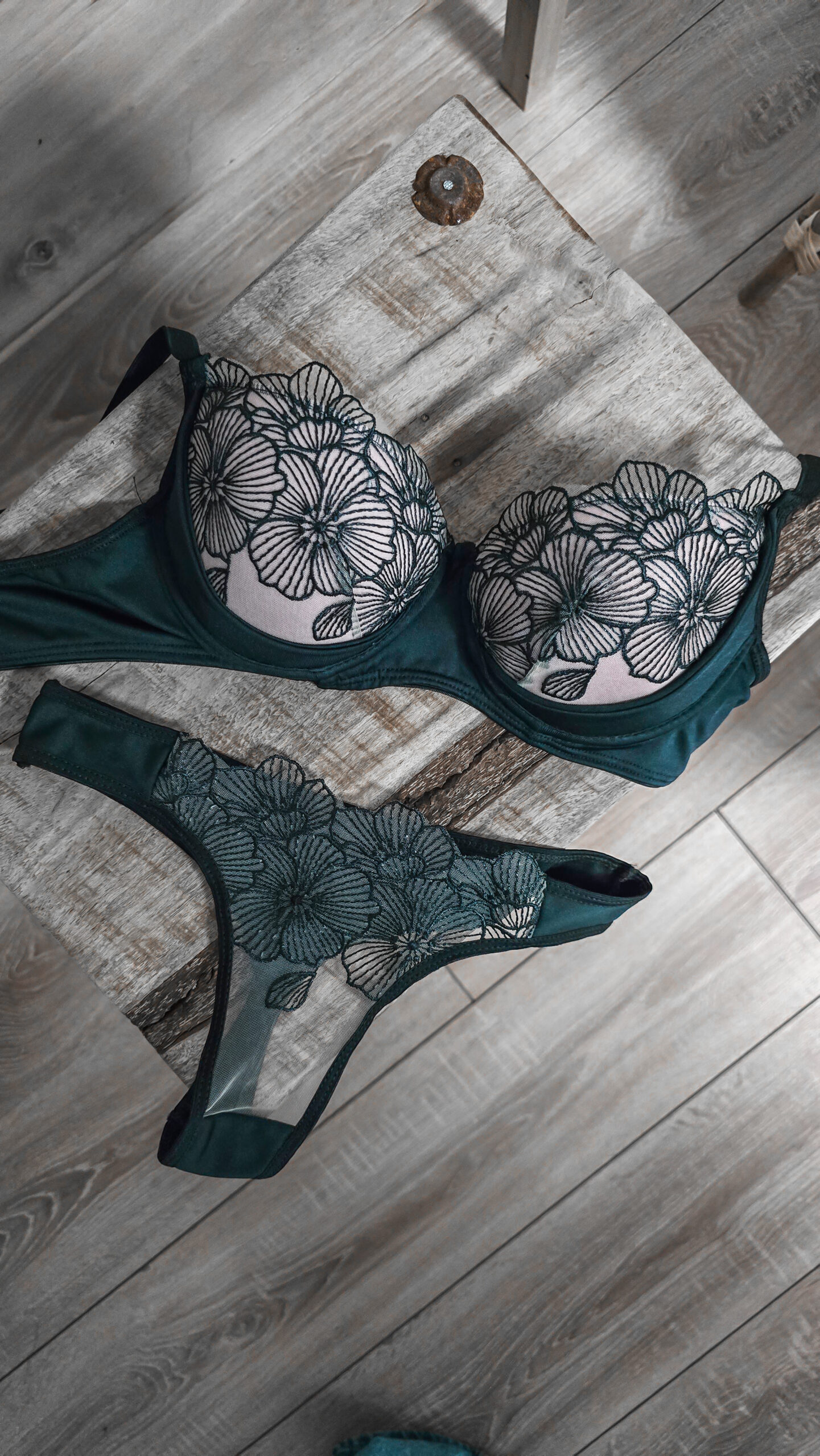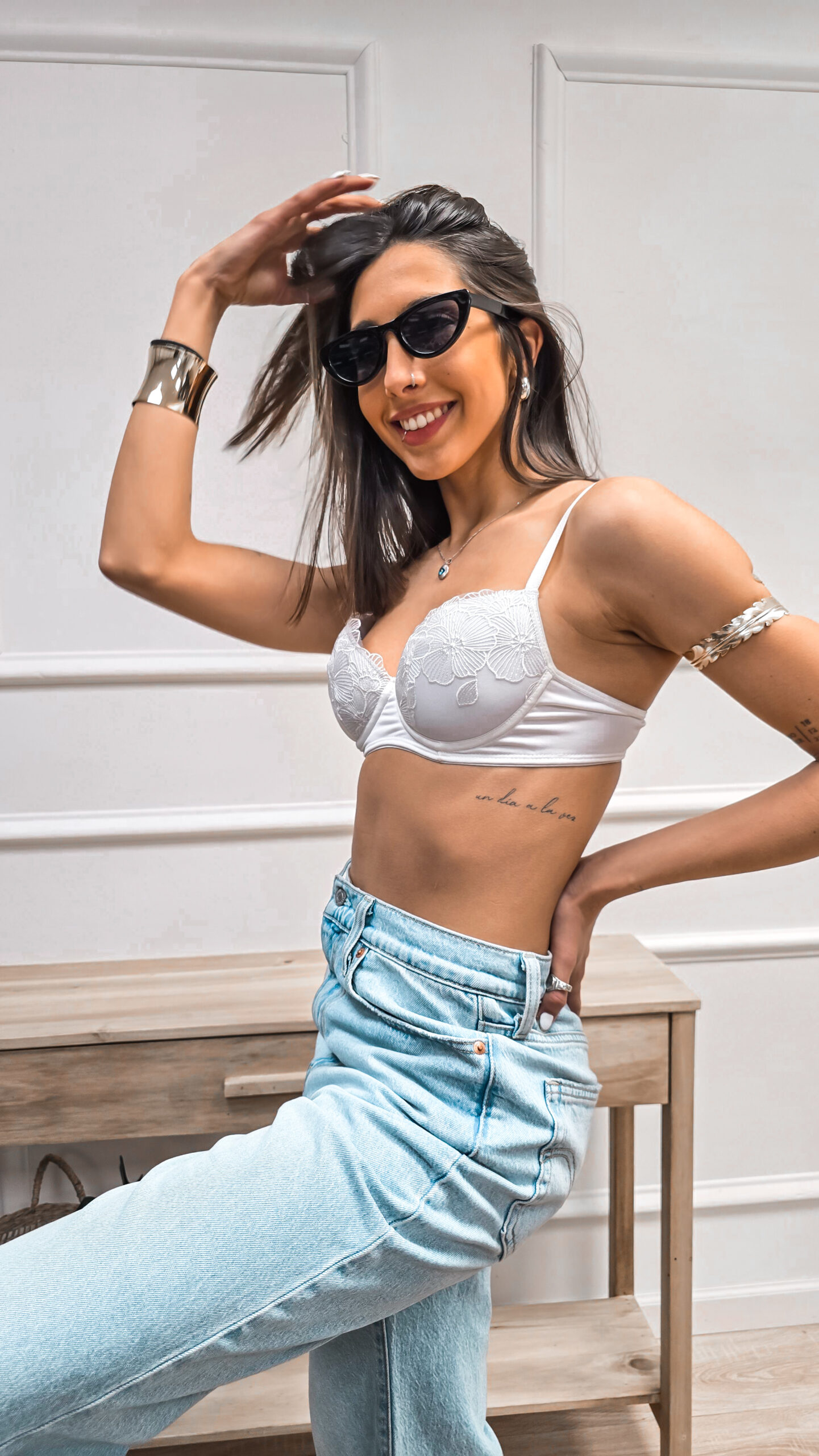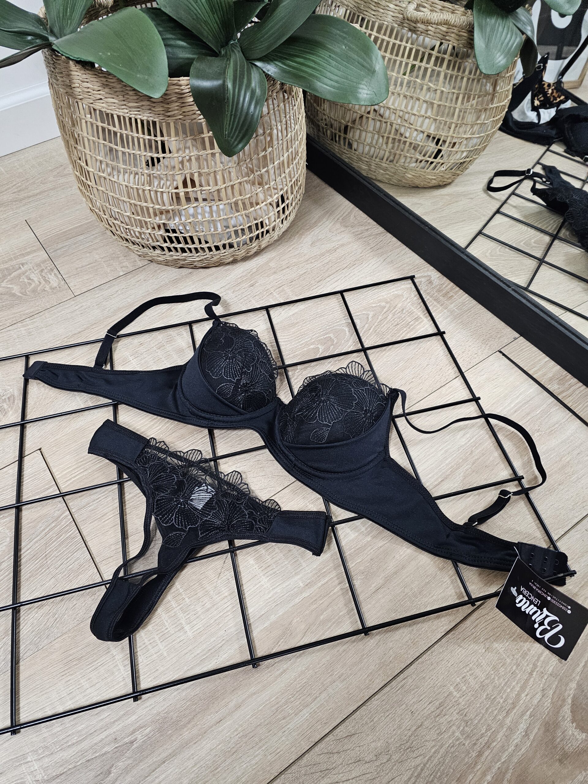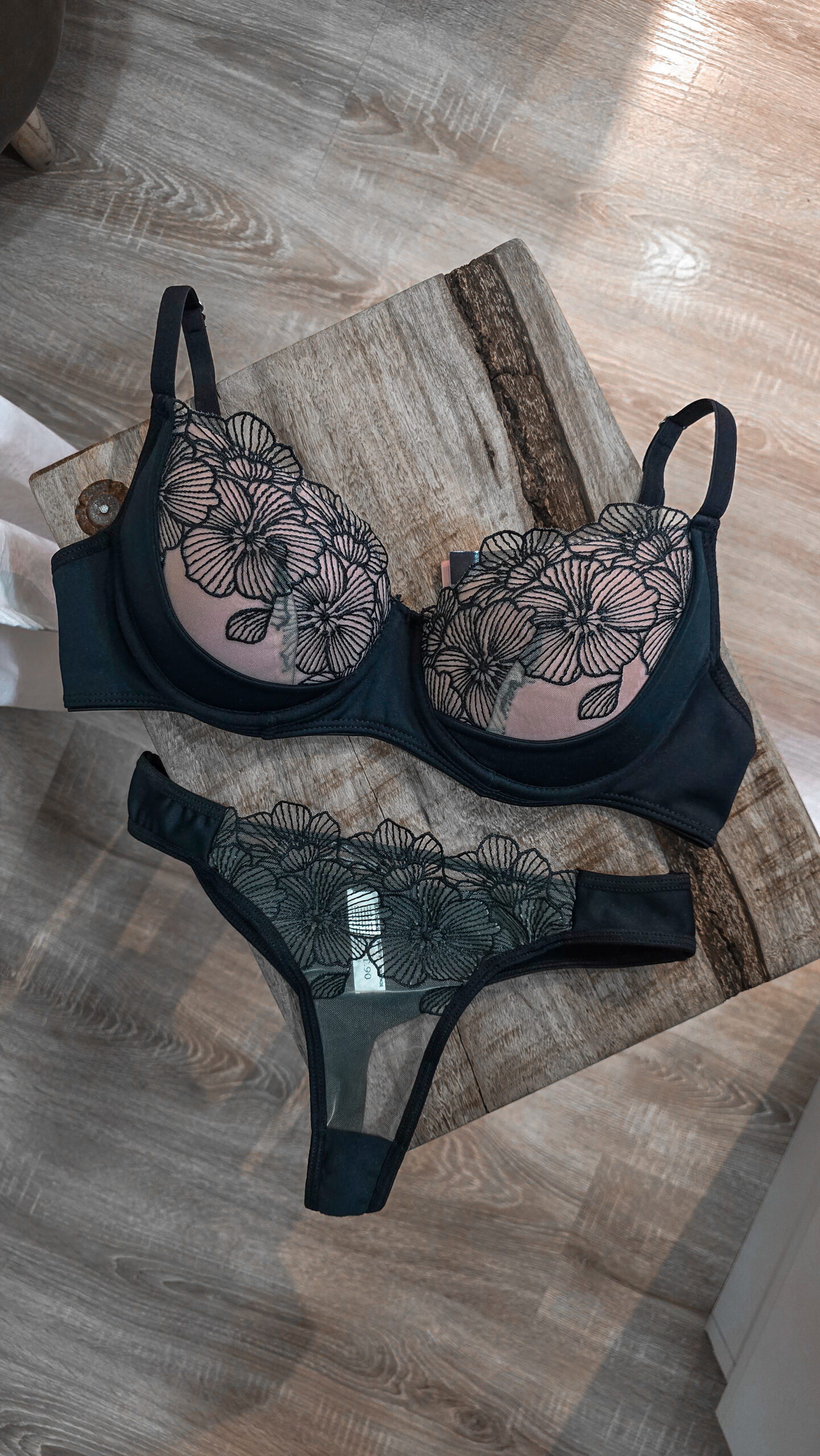 Conjunto de lycra y detalles en puntillas bordadas. Corpiño taza soft con coleta ancha de lycra, con prendidura trasera. Bretel regulable. Bombiless de lycra, parte delantera de microtull bordado.