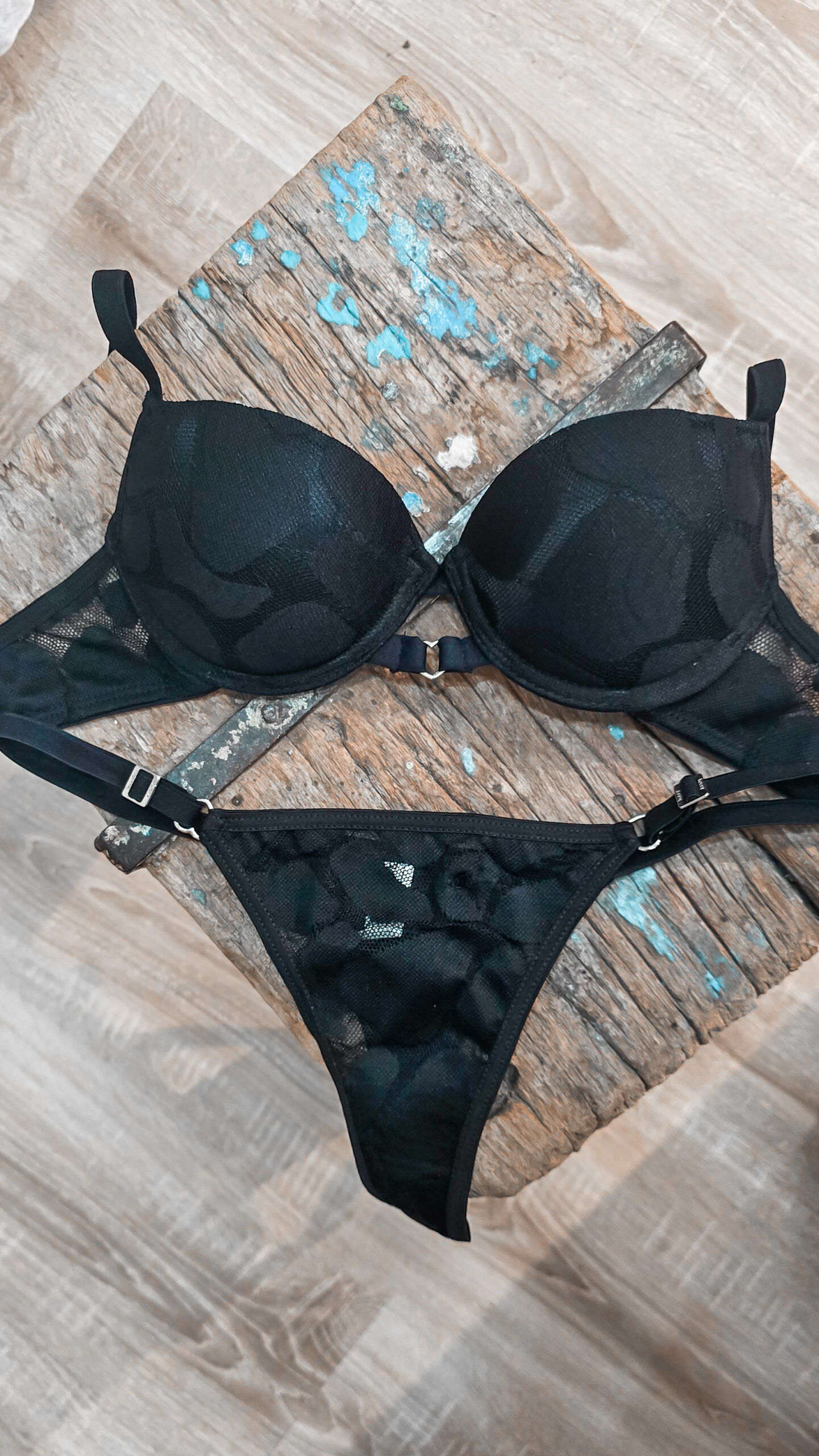 Conjunto de microtul texturado. Corpiño taza soft, sin bajo busto, con detalle de corazón metalizado en el centro. Tanguiless.
