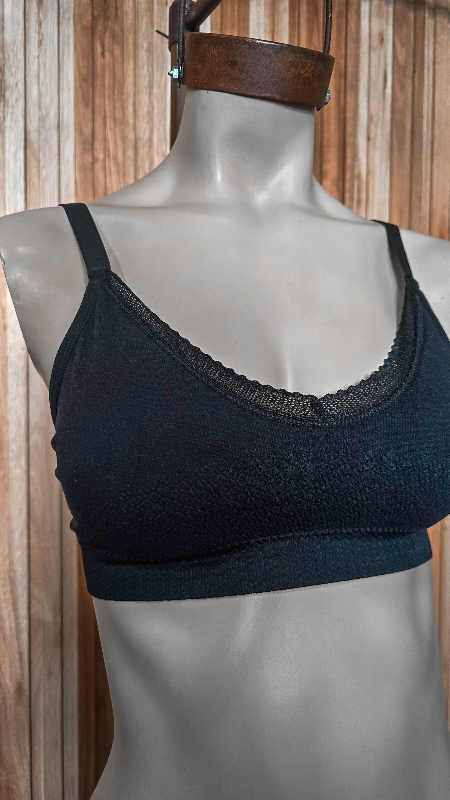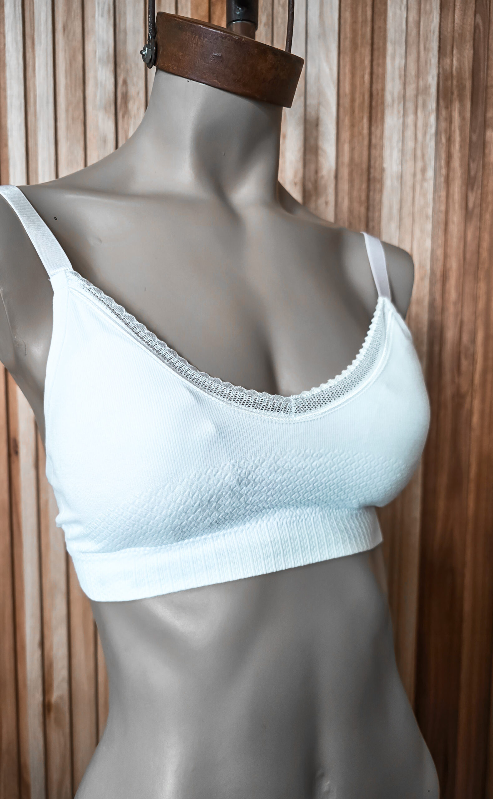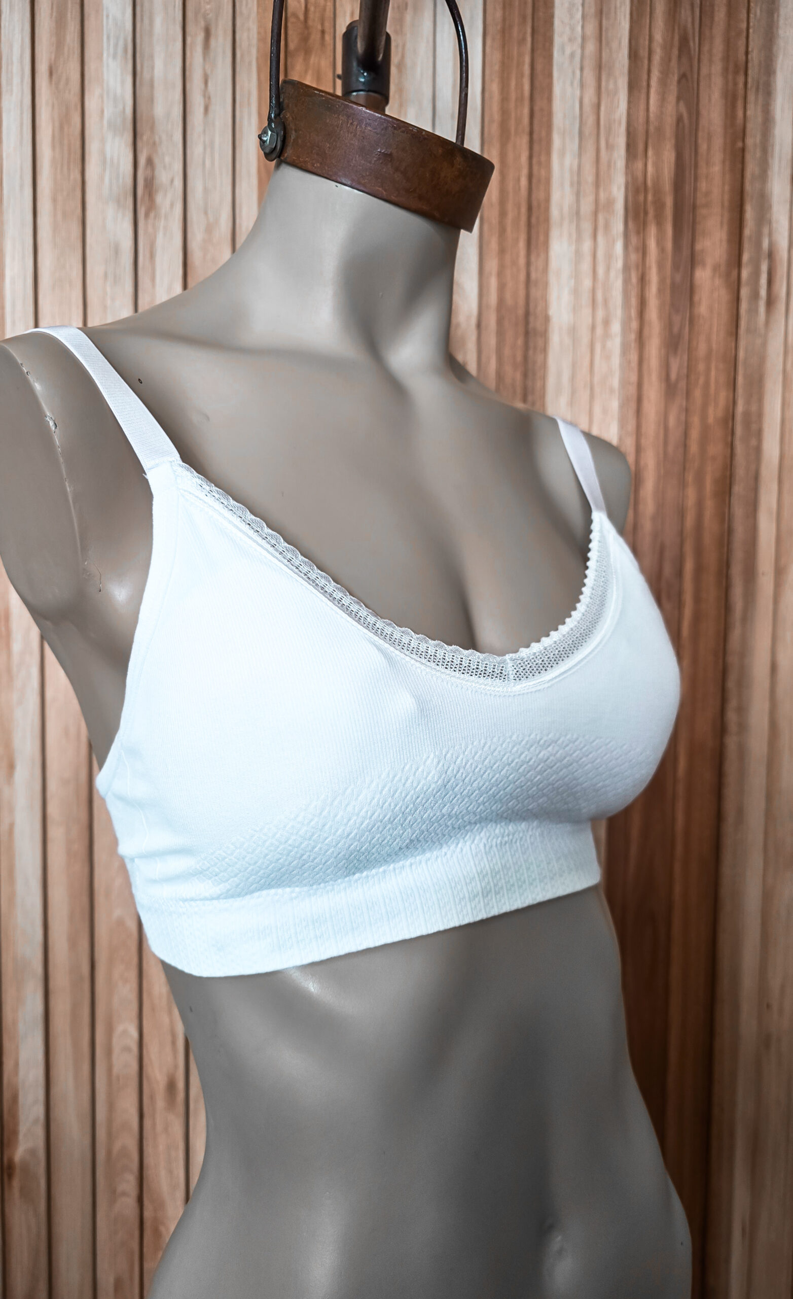 Corpiño de morley texturado de algodón. Coleta ancha con detalle de puntilla en el escote, prendidura trasera. SIN BOMBACHA.