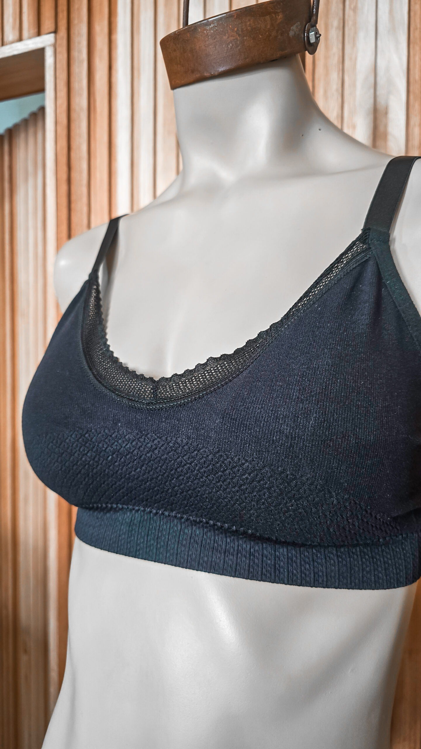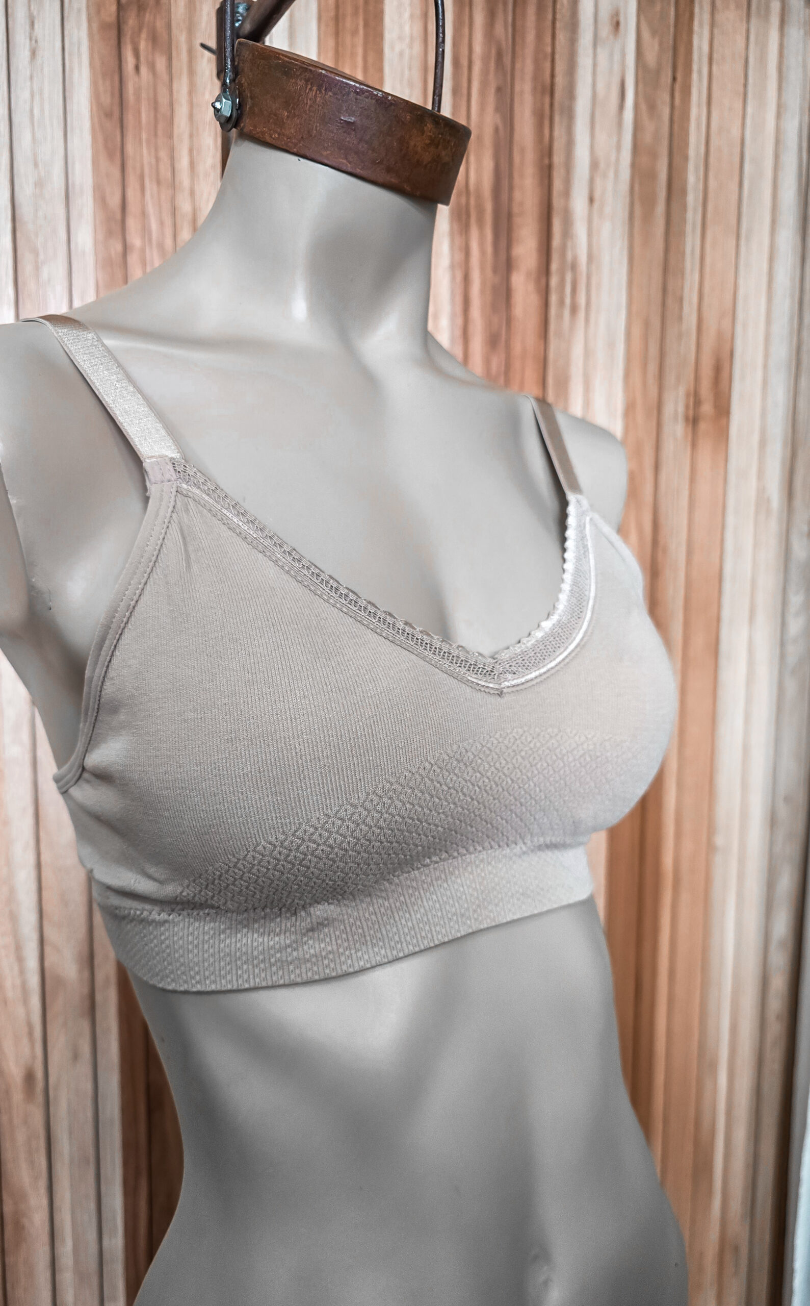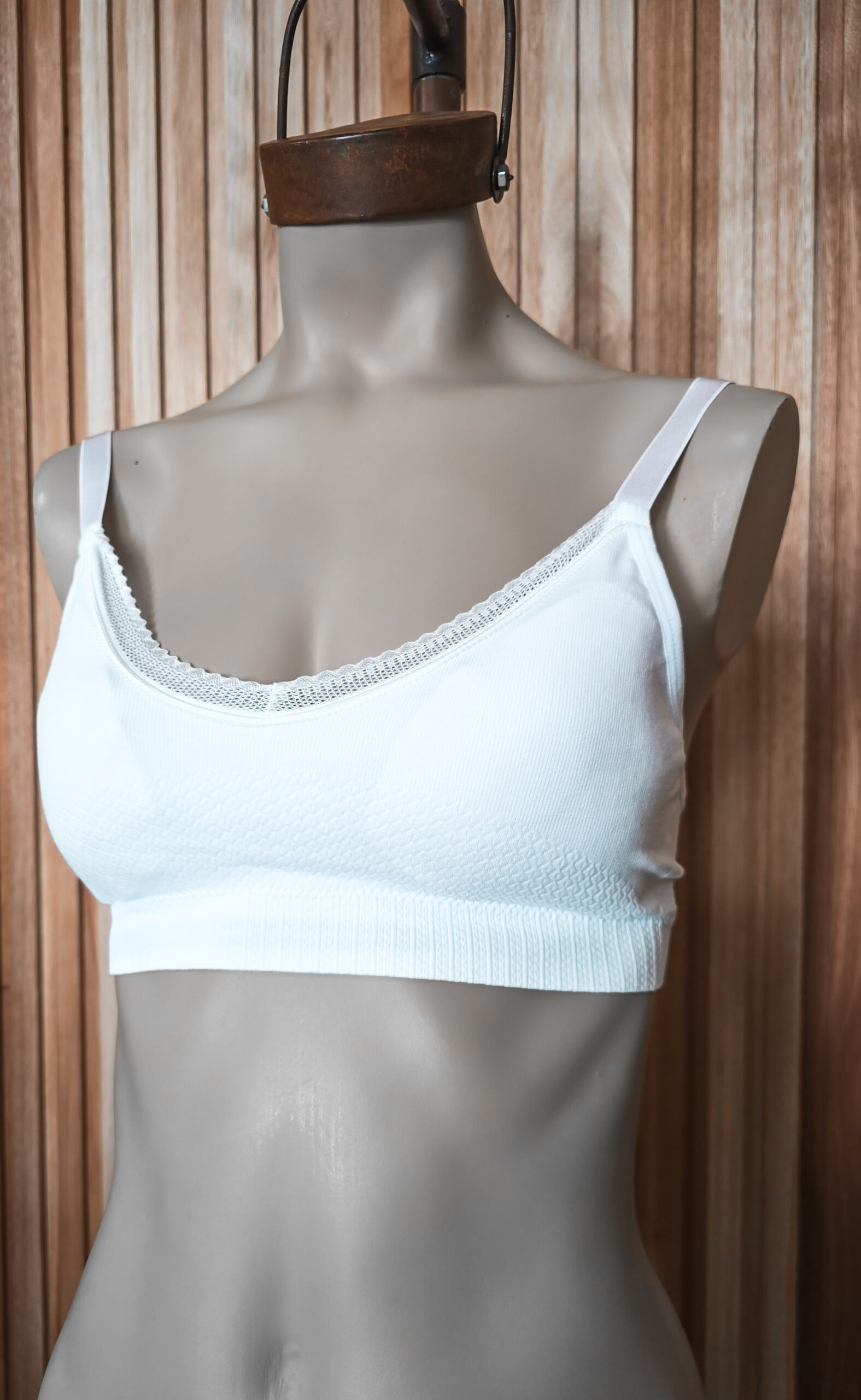 Corpiño de morley texturado de algodón. Coleta ancha con detalle de puntilla en el escote, prendidura trasera. SIN BOMBACHA.