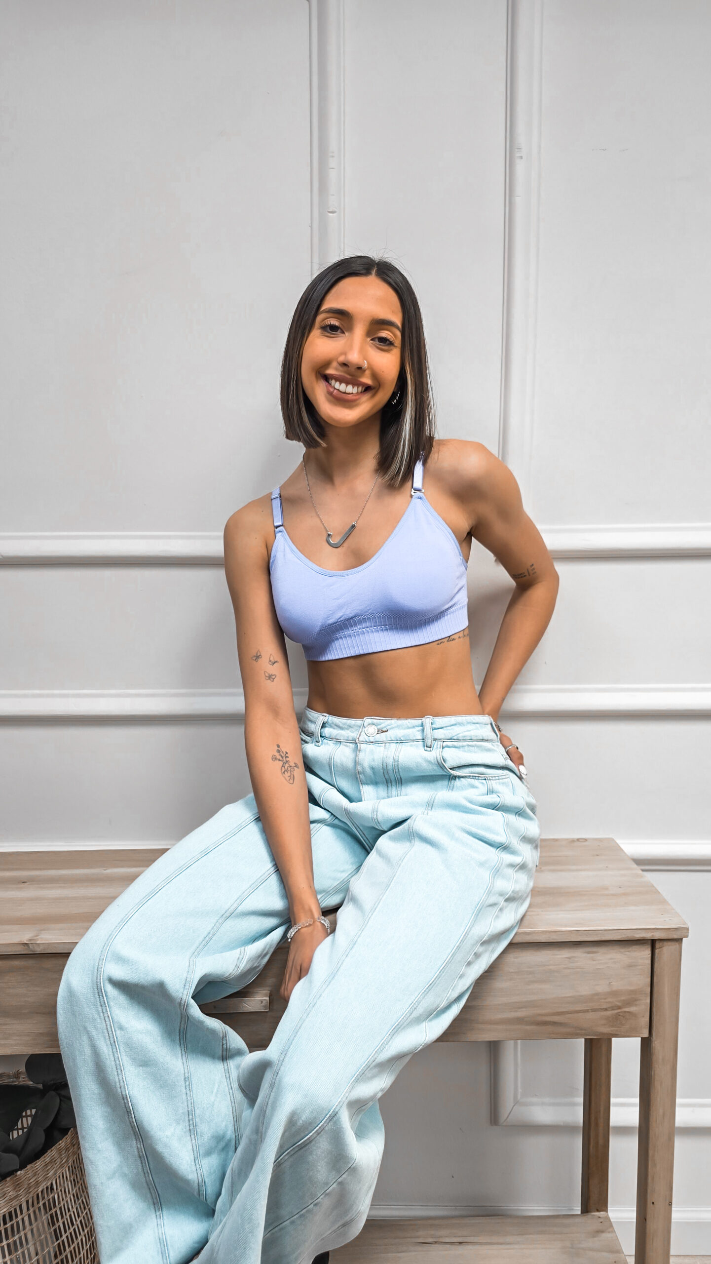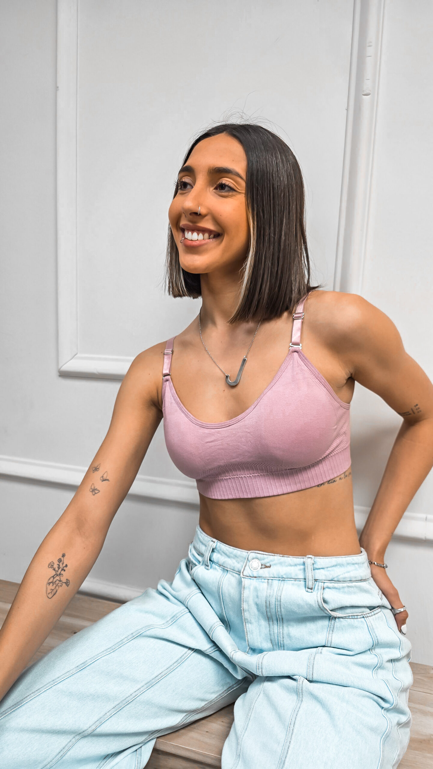 Corpiño de lycra de algodón, tipo top, sin prendidura, con tazas y breteles desmontables. SIN BOMBACHA.