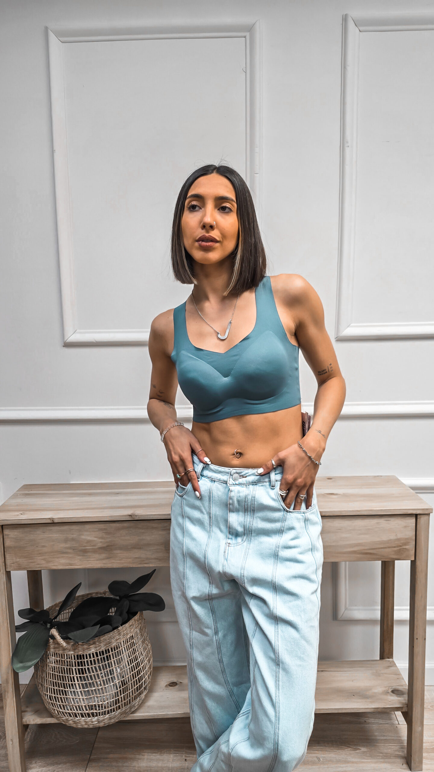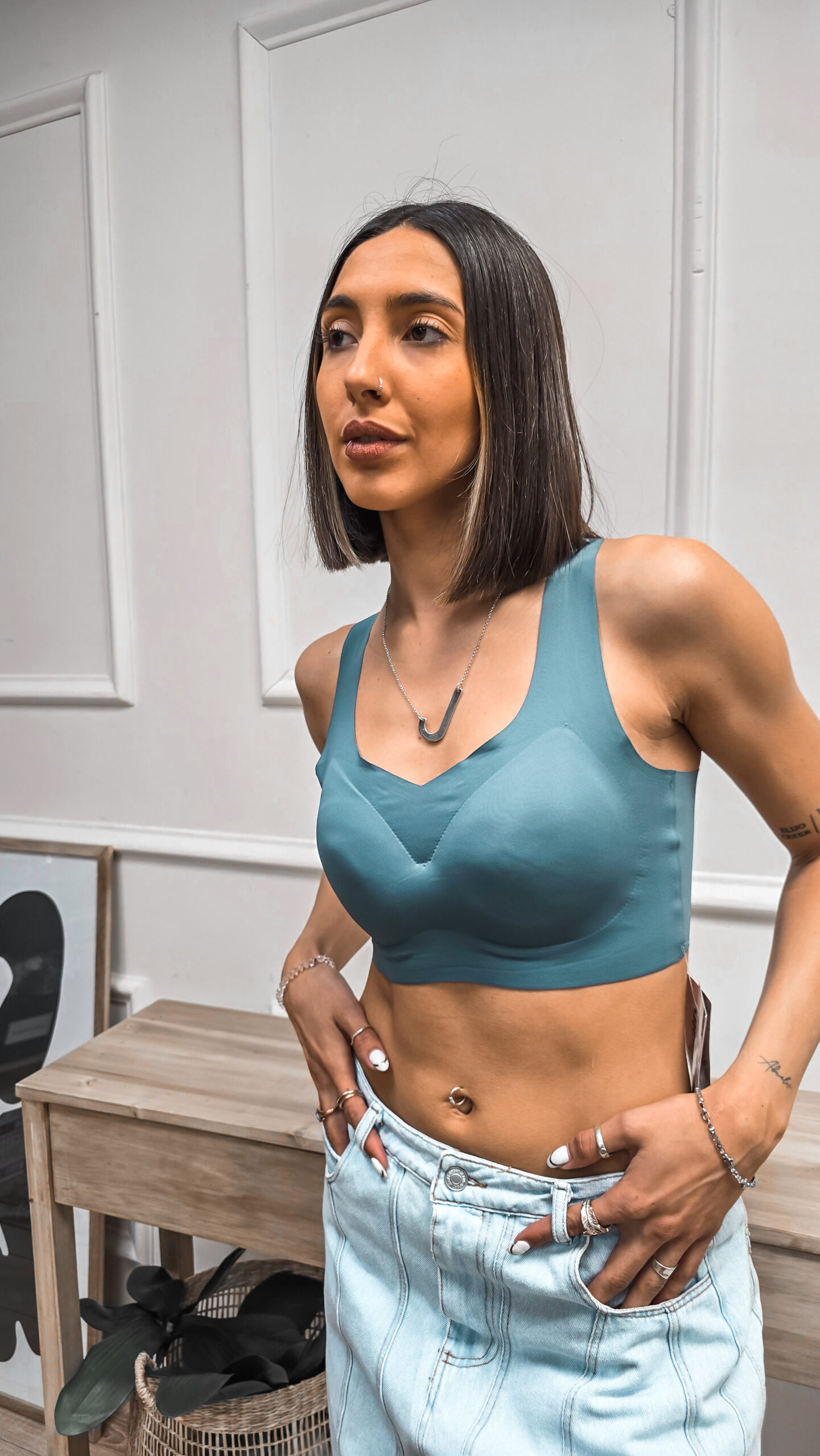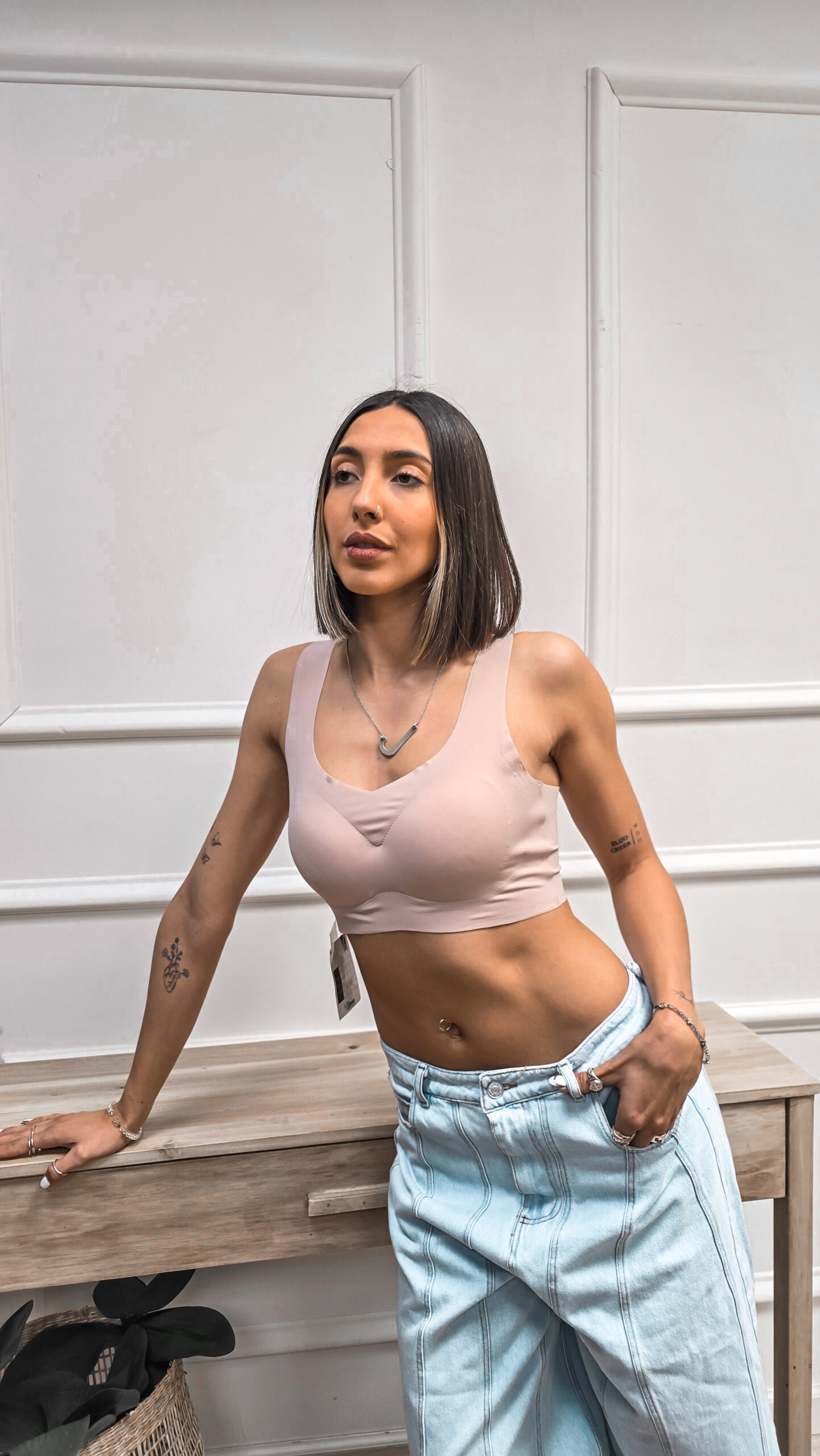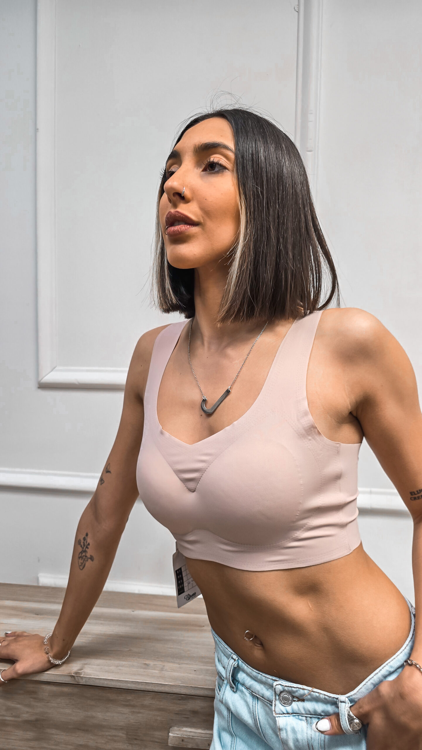 Corpiño top deportivo, de lycra sin costuras. Espalda cruzada, sin prendidura. Con tazas desmontables. SIN BOMBACHA.